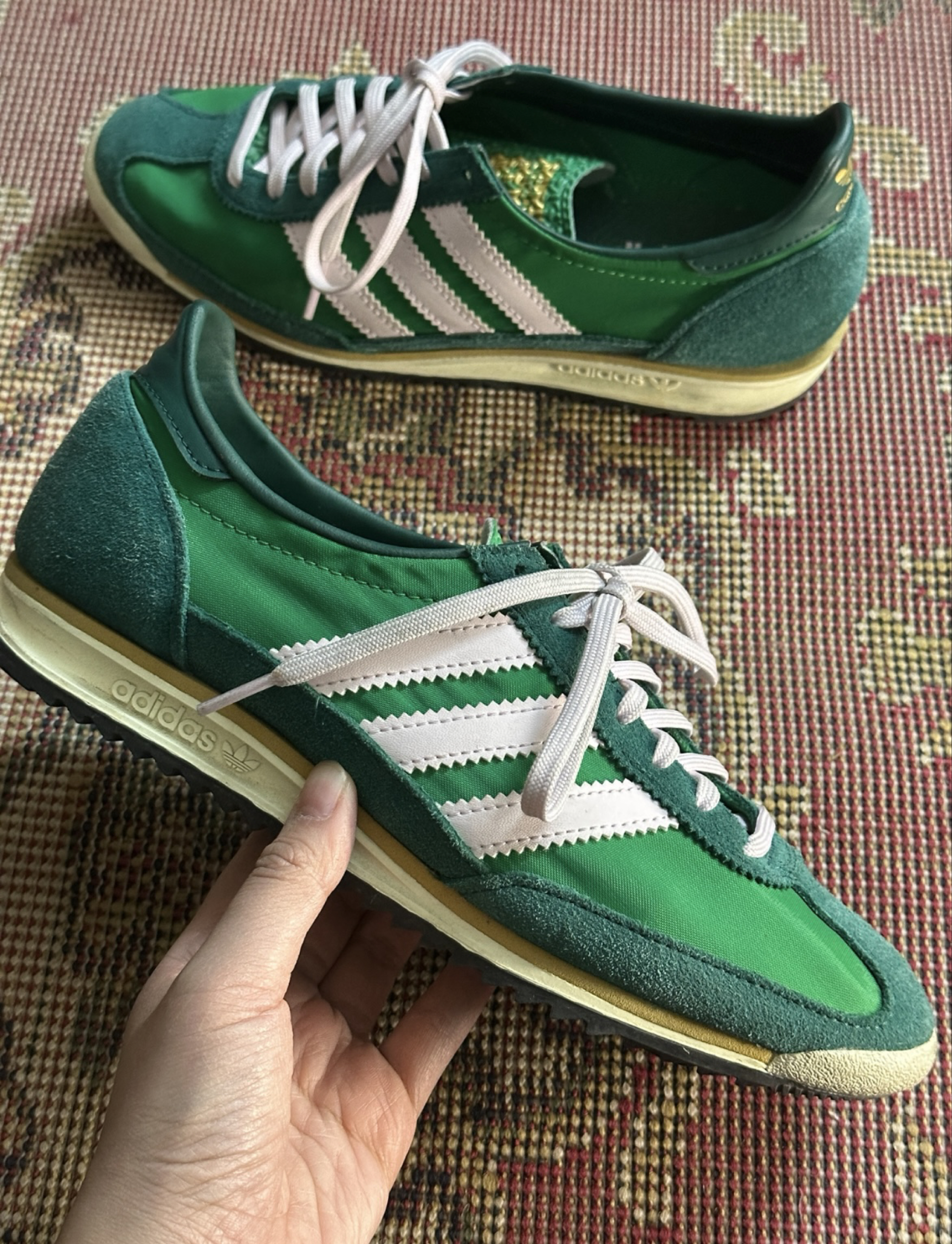 我的新宠,一双绿色的小精灵🧚 轻盈舒适,而且颜色真的很出彩 · 这双 adidas Originals SL 72 是我近期穿出门被问最多的一双。 复古绿 + 米白拼接,像把春天悄悄藏在鞋面上, 配深色牛仔裤或一身灰大衣时,它就成了全身唯一(且合理)的高光。