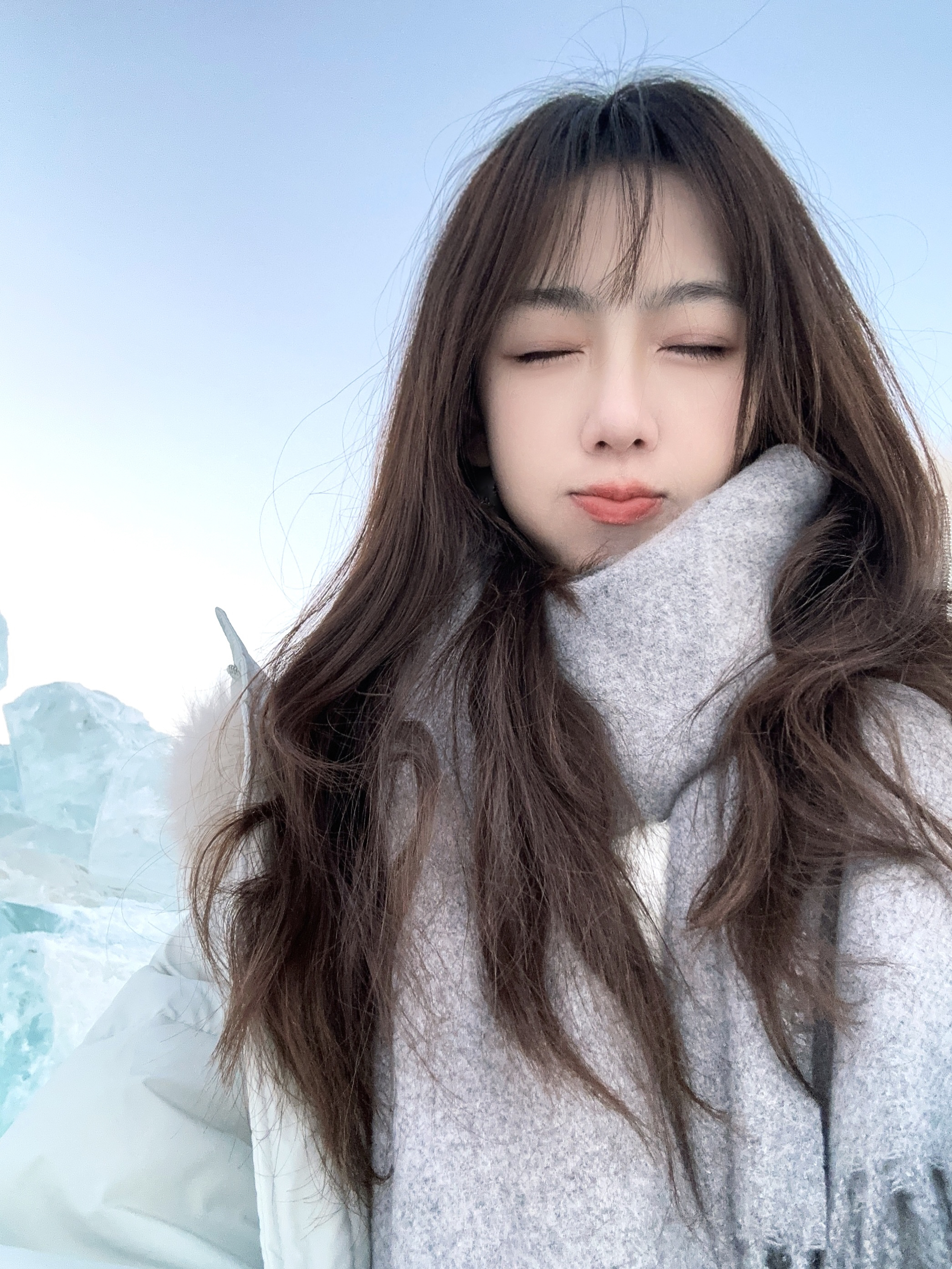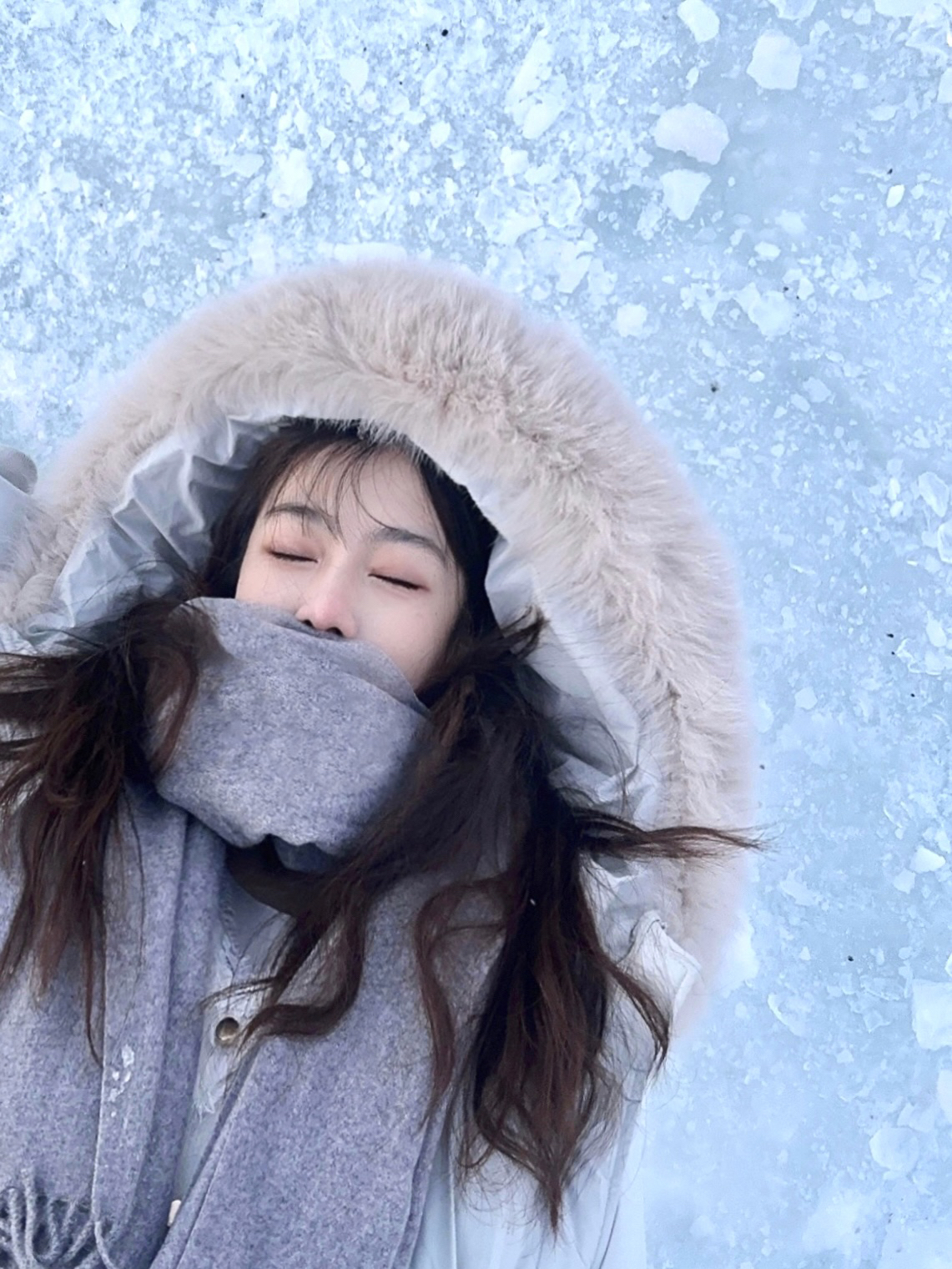 第一次见到这么多的蓝色冰块 穿上淡蓝色羽绒服+灰色围巾🧣 整体就是清冷风的感觉,不臃肿 在雪地里蛮出片又很保暖~
