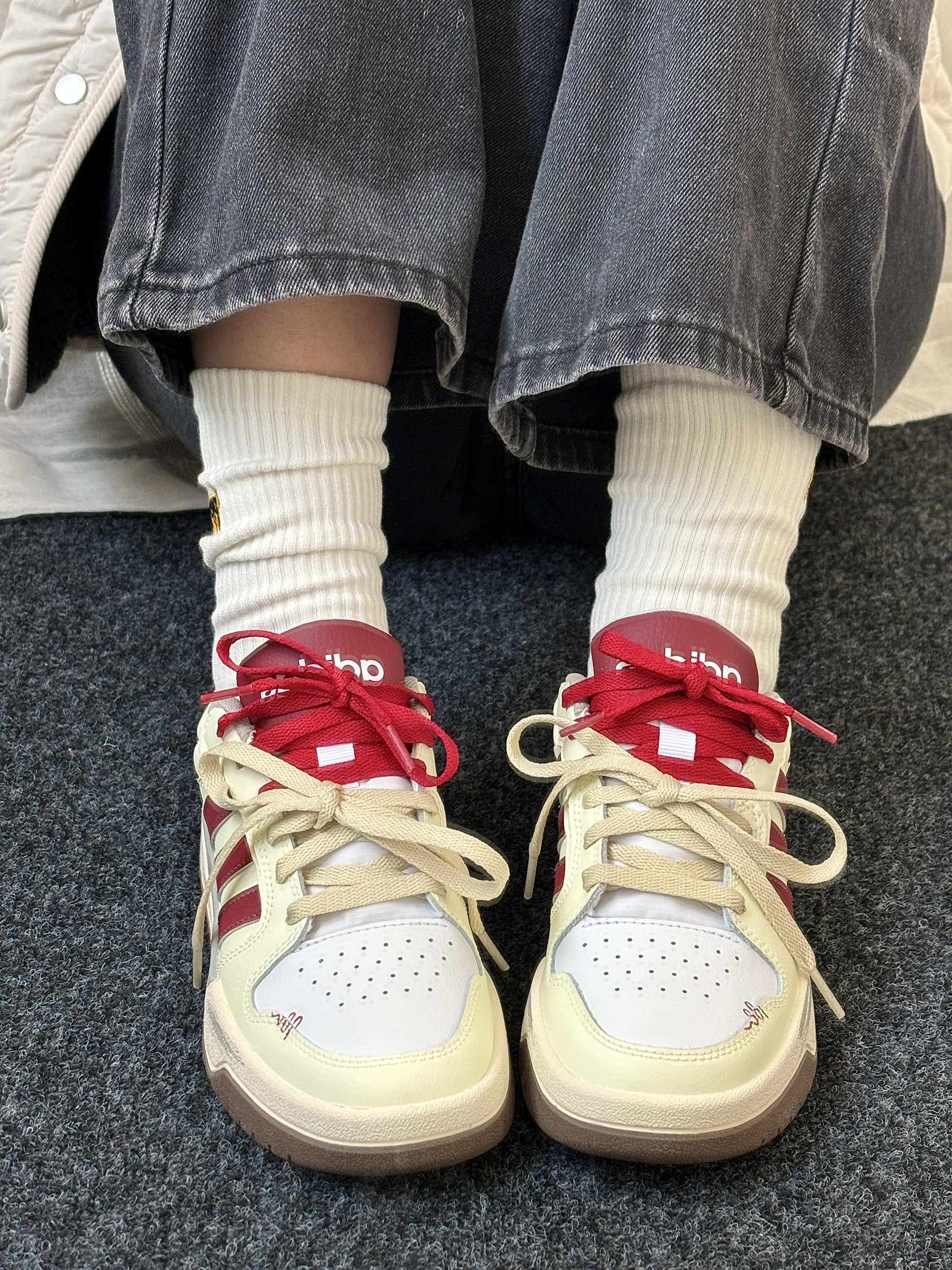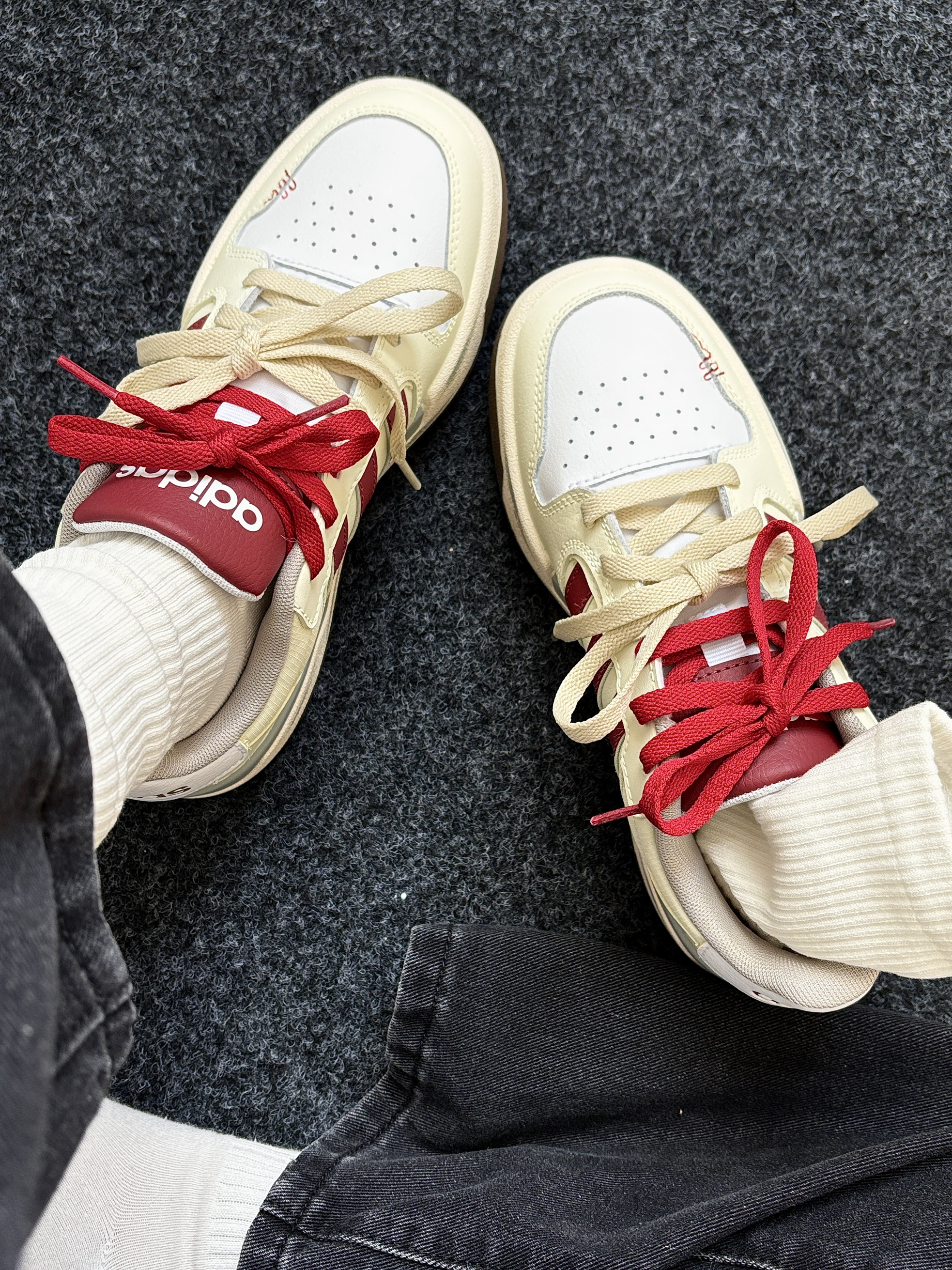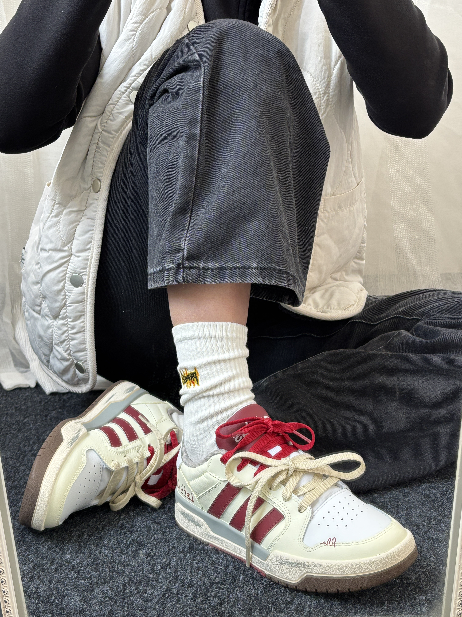哈喽今日份的穿搭 OOTD 是酷酷的女孩纸~ 阿迪定制板鞋➕ Primeet派米白色刺绣中筒袜~ 这一套舒适保暖个人感觉还挺酷🆒 这个袜子🧦很好穿包裹性很好棉质的柔软亲肤 中筒长度一年四季都可穿还挺实用 ha🫶