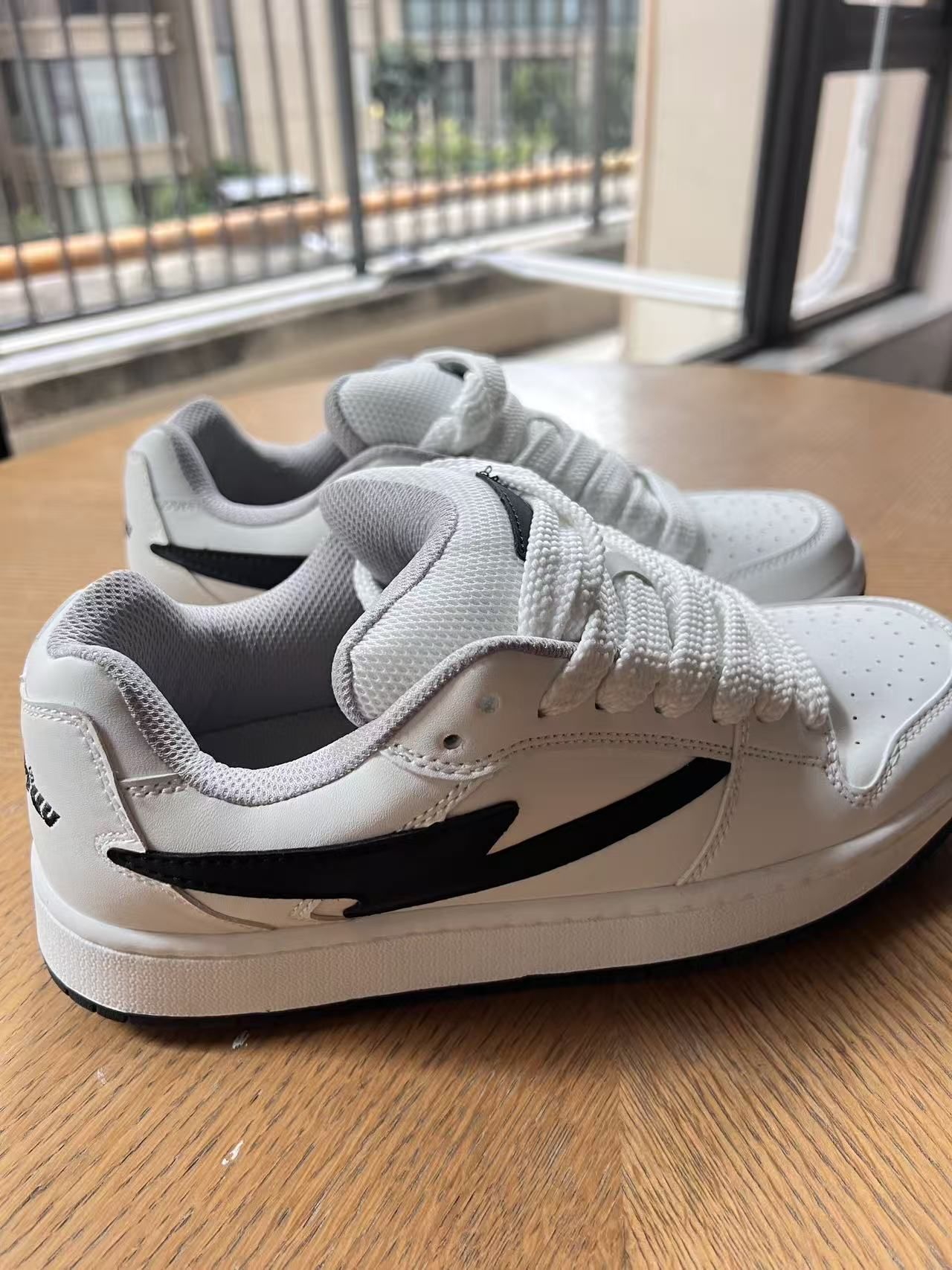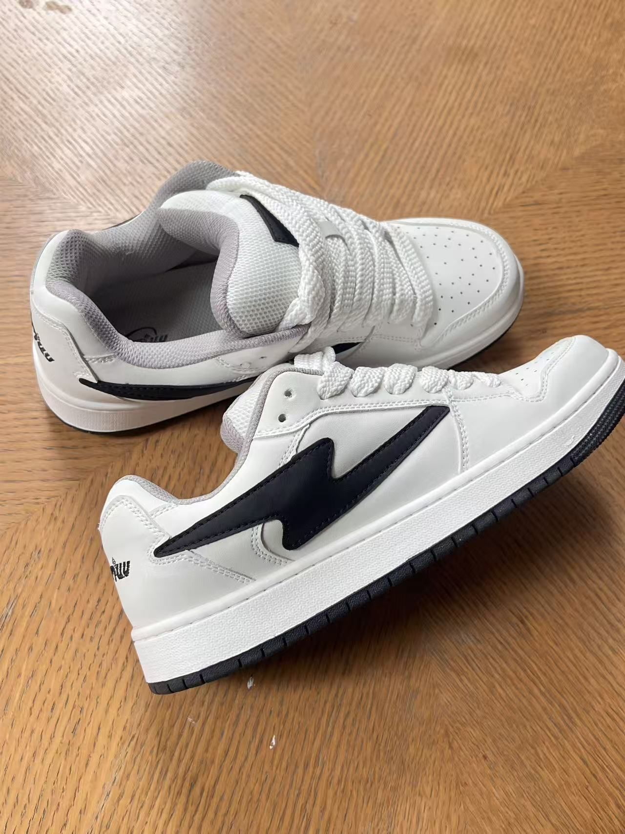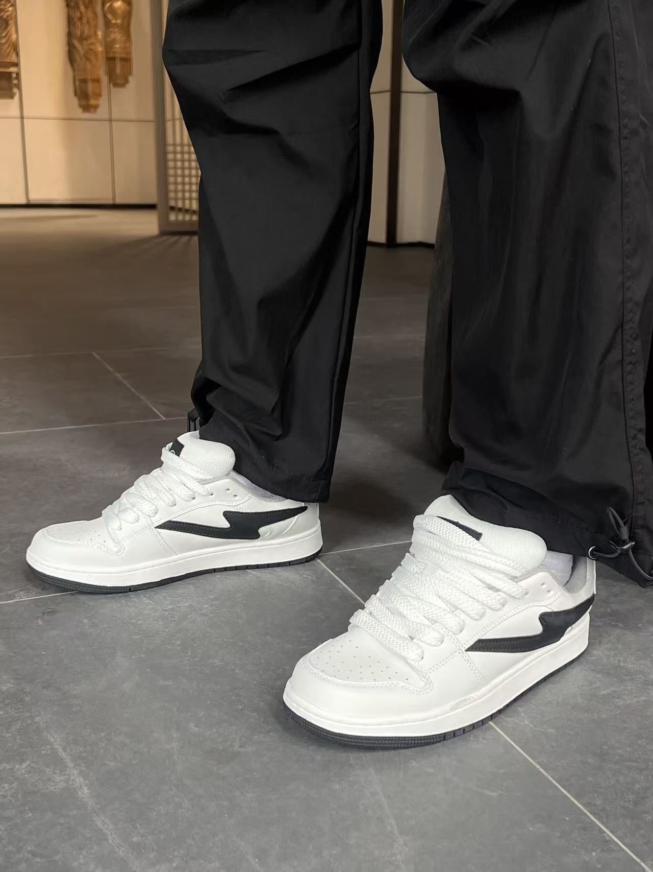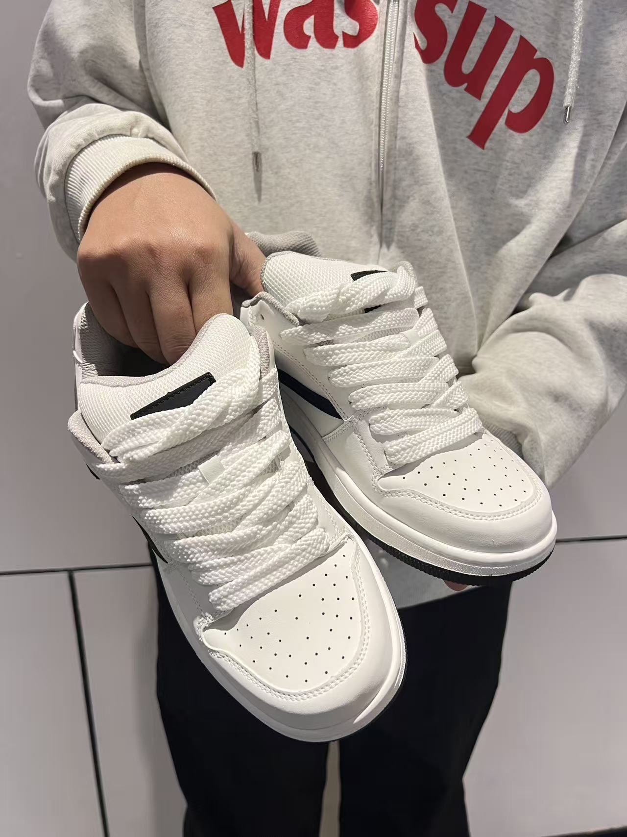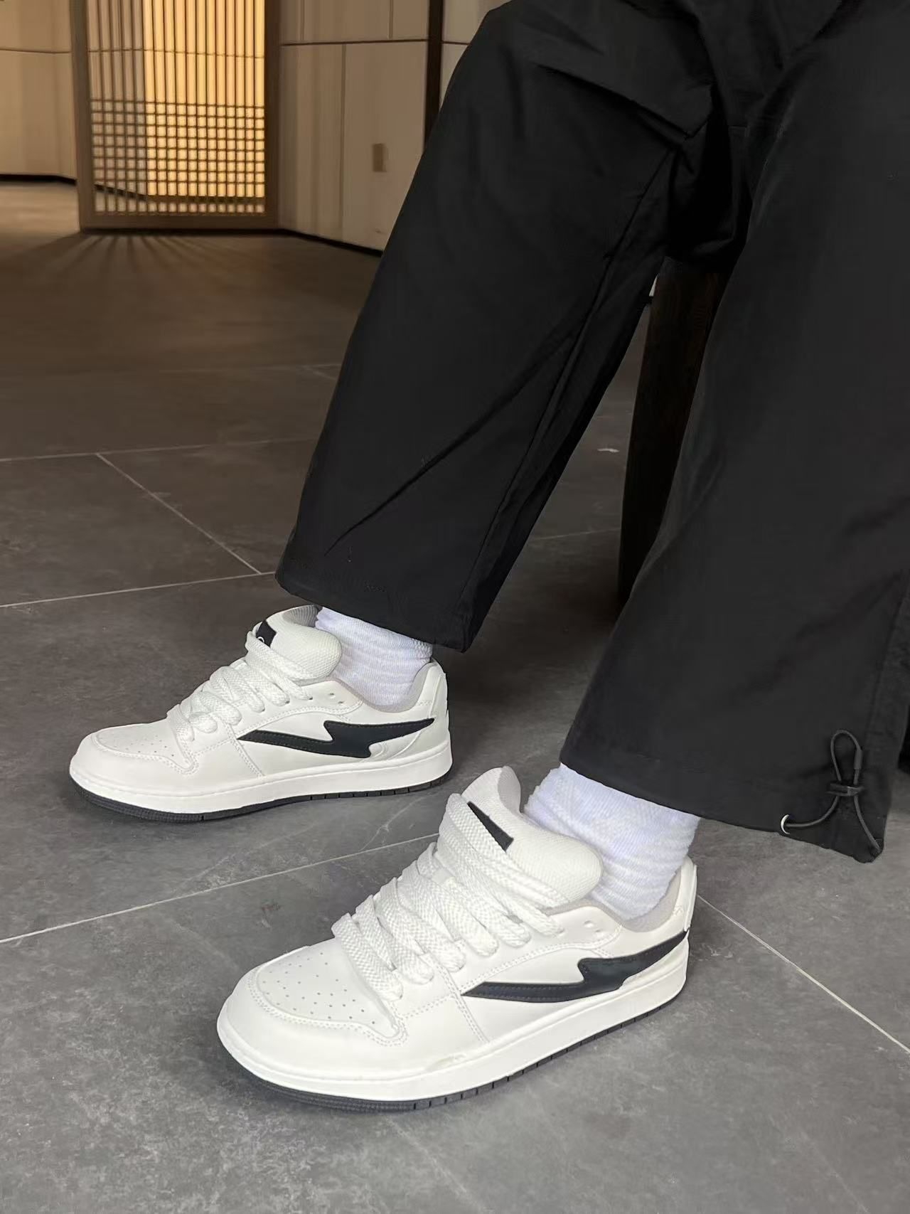🌟 神仙颜值 纯白鞋身+黑色闪电侧标,简约高级感拉满!透气孔+厚底设计兼顾颜值与舒适,皮革鞋面抗皱耐脏,网布内衬透气不闷脚。鞋底防滑耐磨,走路带风不累脚~ 👟 万能穿搭公式 ▪️ 街头潮酷风:灰卫衣+黑束脚裤+白袜,搭配鞋侧闪电标超吸睛! ▪️ 慵懒休闲范:浅紫袜+灰连帽衫+黑阔腿裤,踩上秒变日系盐系少年 ▪️ 运动机能感:抽绳束脚裤+荧光袜,厚底增高5cm悄悄拉长腿型 🛍️ 场景全...