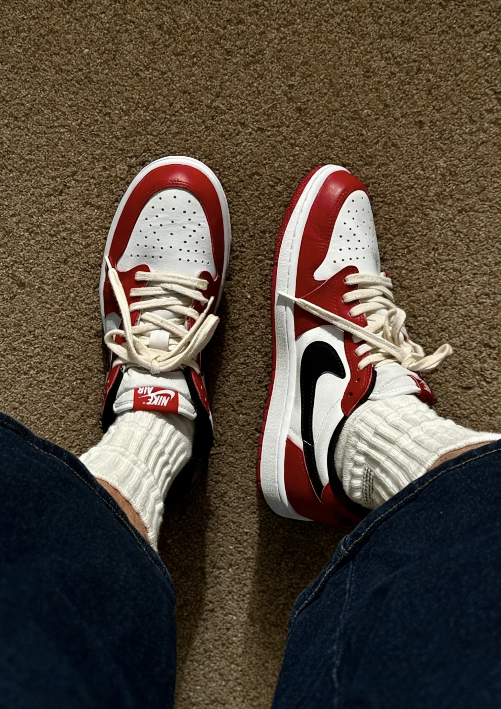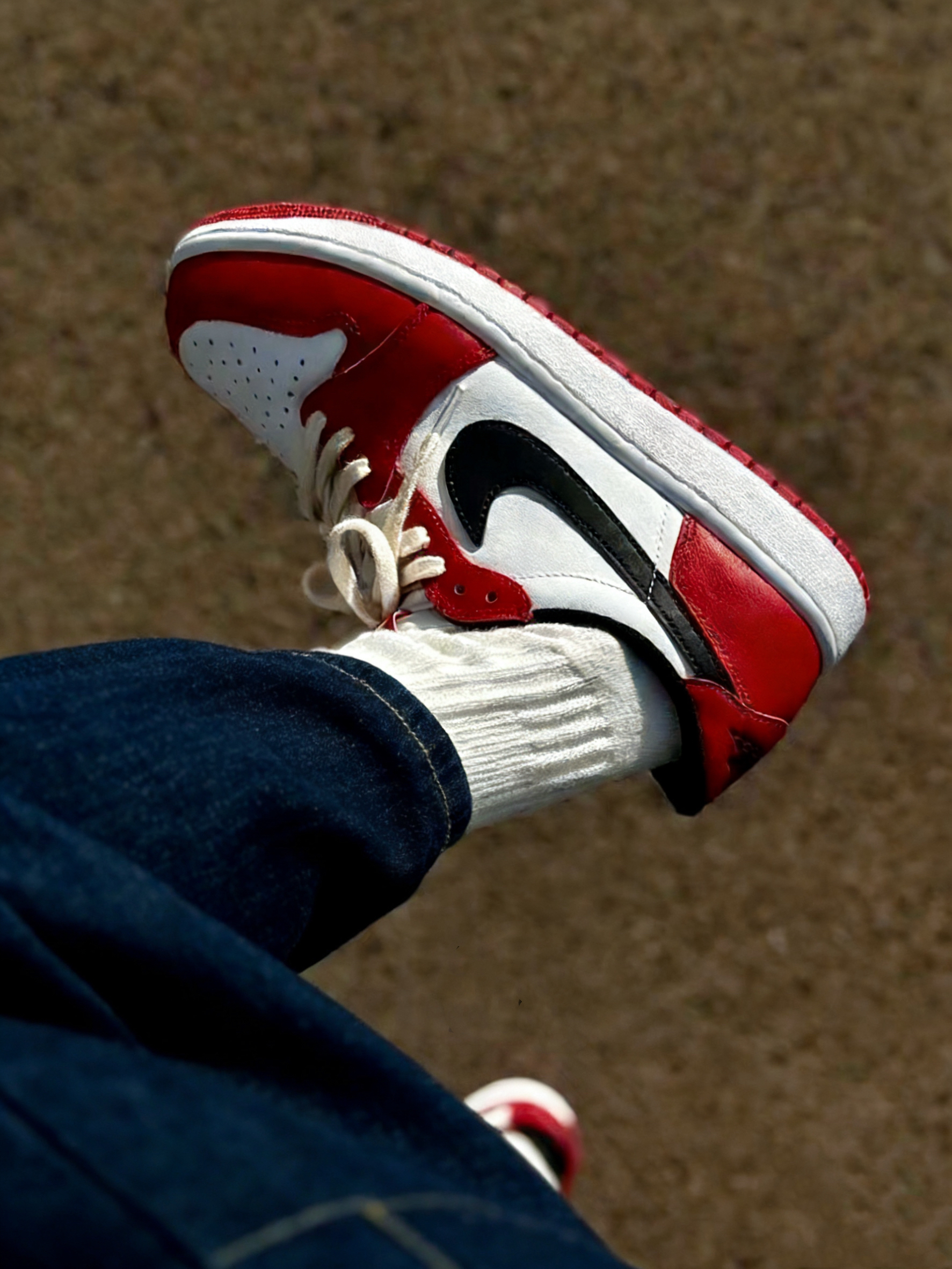 ✅经典芝加哥配色完美复刻,红白黑三色比例恰到好处,低帮鞋型比高帮更显利落清爽,夏天穿不闷脚还能悄悄拉长腿型。红色皮革光泽感细腻高级,阳光下拍照巨出片📸 ✅ 鞋头透气孔设计兼顾美观与实用性,夏天不闷脚。鞋舌的Nike Air标签和后跟飞人Logo细节拉满,OG味儿十足。皮革材质扎实细腻,摸起来就能感受到满满的复古情怀。