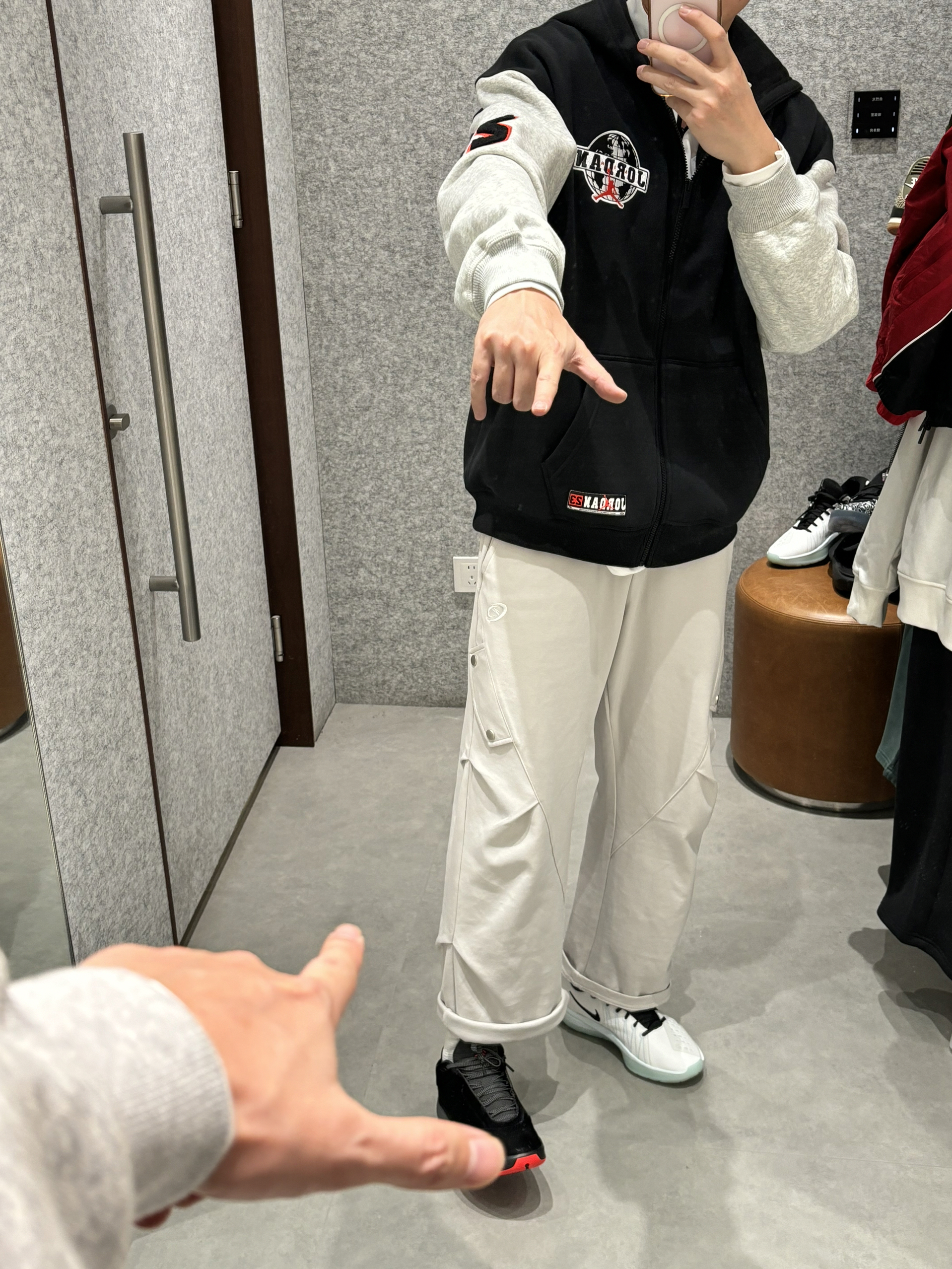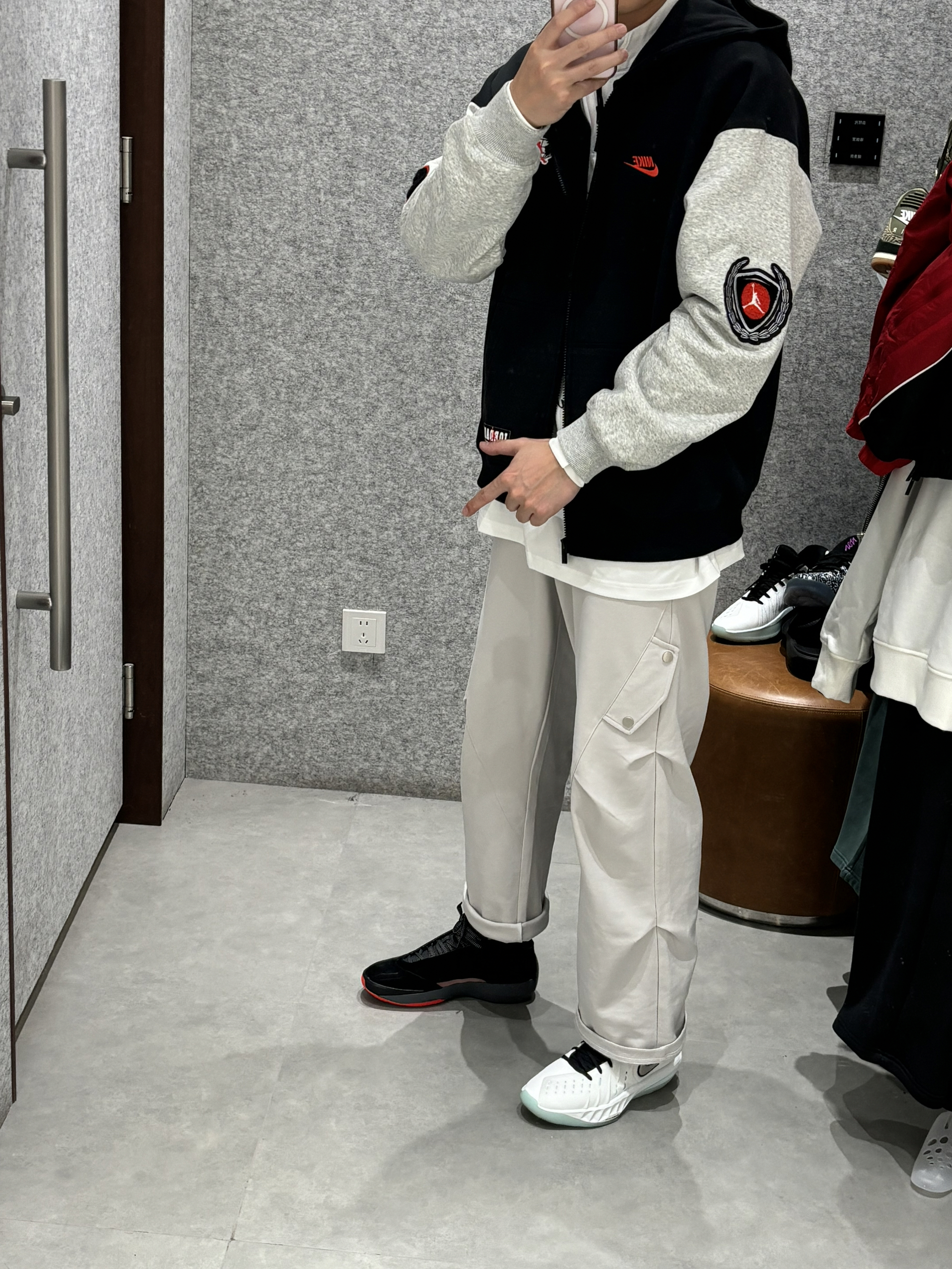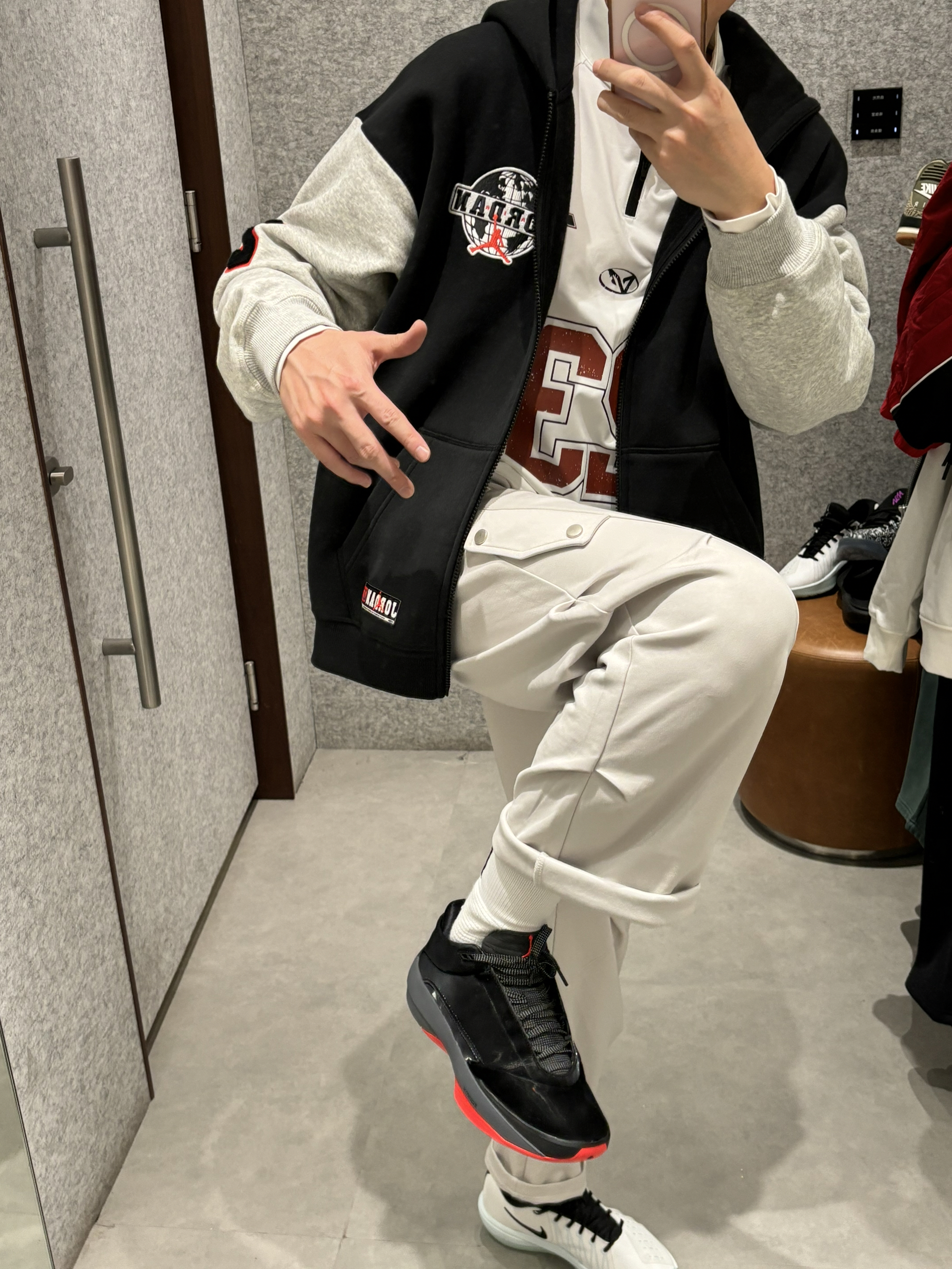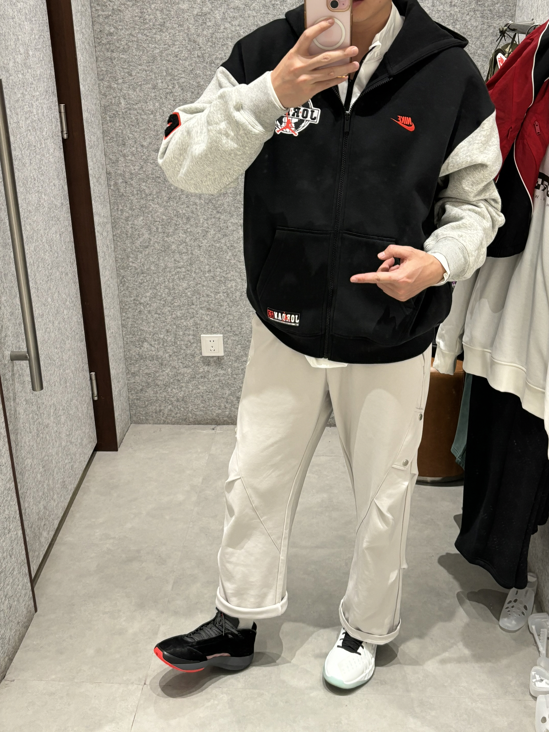 预习一下早春穿搭 我的早春就这么穿了有点冷就先叠穿吧 双拼色的卫衣外套遮得有点特别 内搭一件机车风赛车衬衣 一整个体育生运动感扑面而来 叠穿还很保暖黑灰色双拼确实帅 搭配一条直筒灰色长裤 aj40红外线就很配 👟aj40红外线 👖uzis运动裤 👔jordan双拼色外套