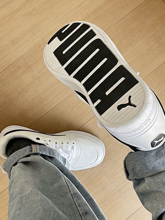 这双黑白配色的Puma板鞋,颜值真高,尤其鞋底那个1ogo太酷了鸡。皮革面好打理,踩着软乎还能增高,就是鞋头有点窄,记得拍大一码。 随便搭条工装裤就很有型,穿出去逛街又酷又舒服,性价比确实可以。穿着它逛了一下午街,脚一点也不累,真的爱了!