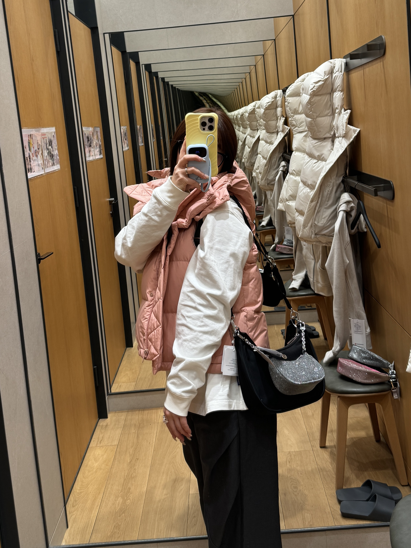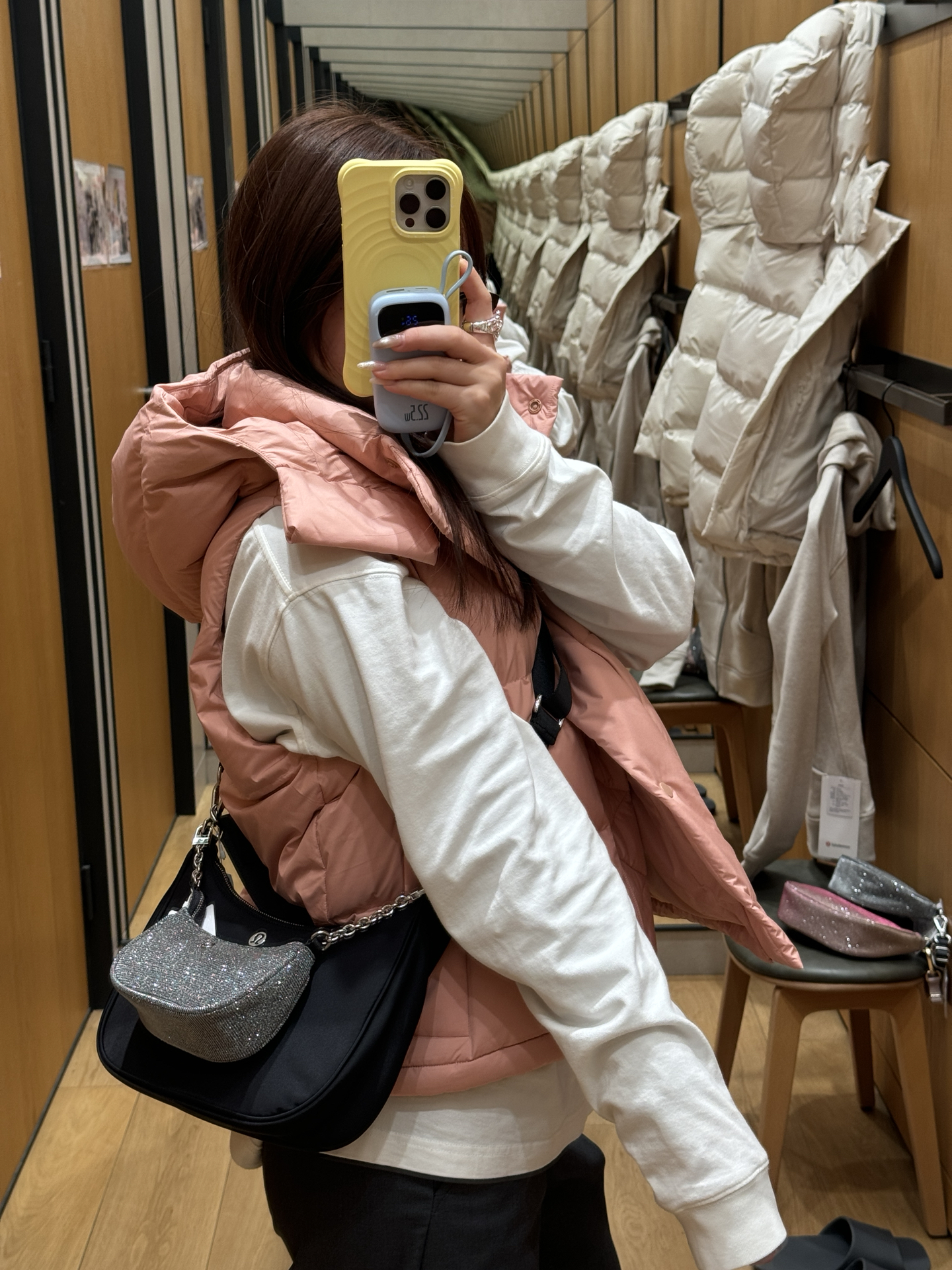 我入了这个3L容量的包,腋下斜挎都好搭~我158cm背起来尺寸刚好,不会压个子!装东西也能装不少,就是包身没有夹层,找小物件得翻一翻😅 搭同品牌粉色羽绒马甲好亮眼,日常通勤背很合适~