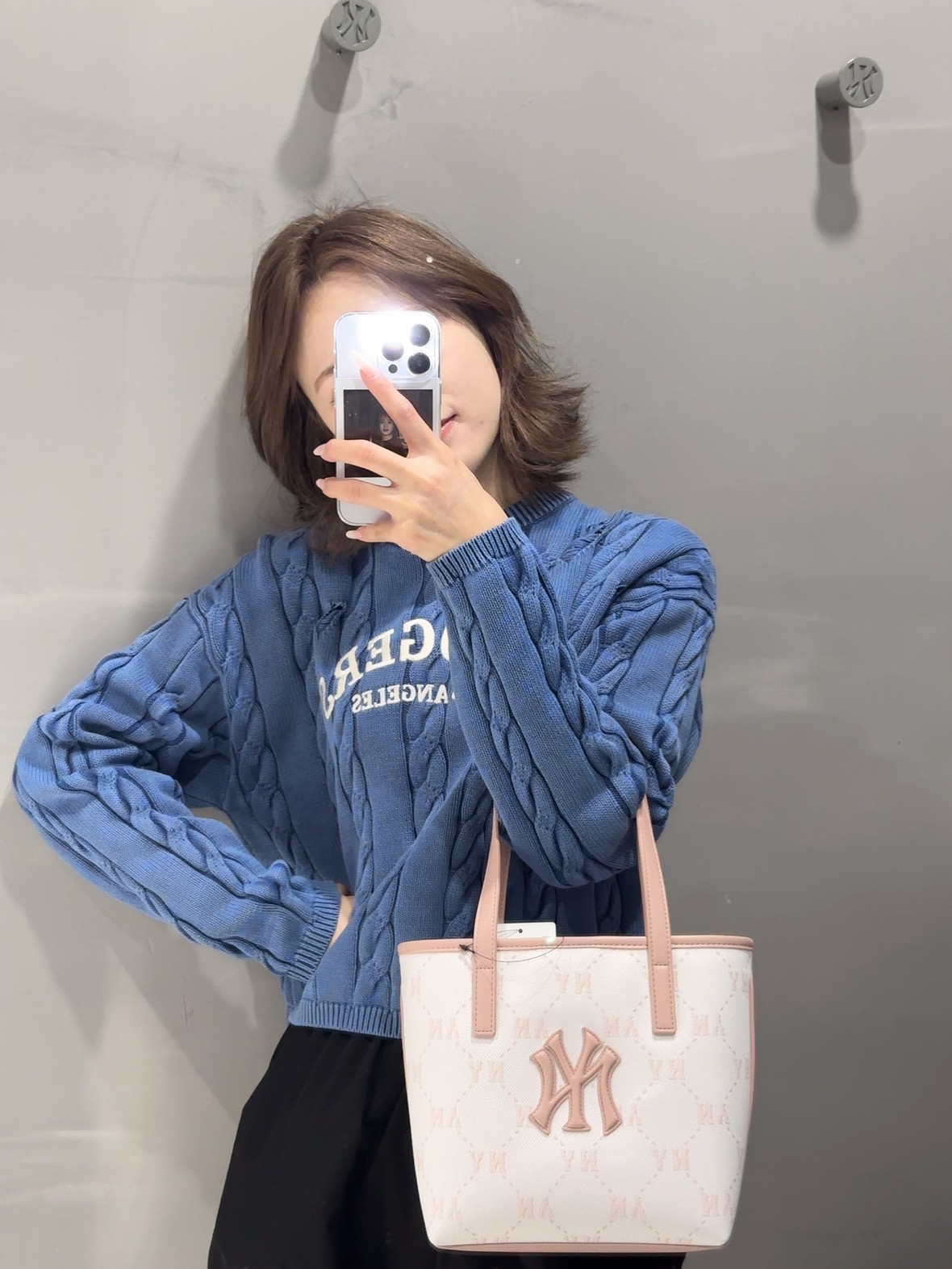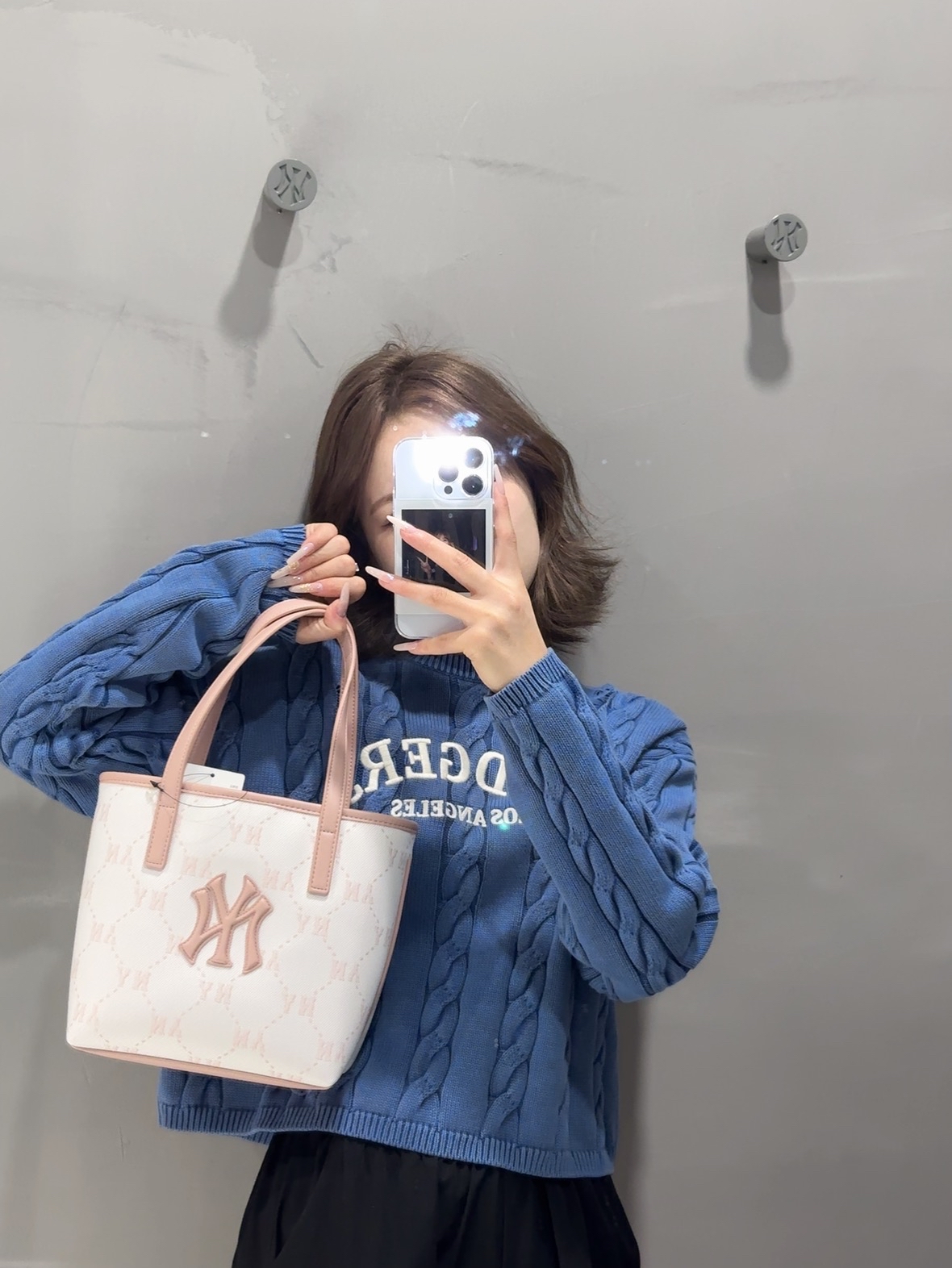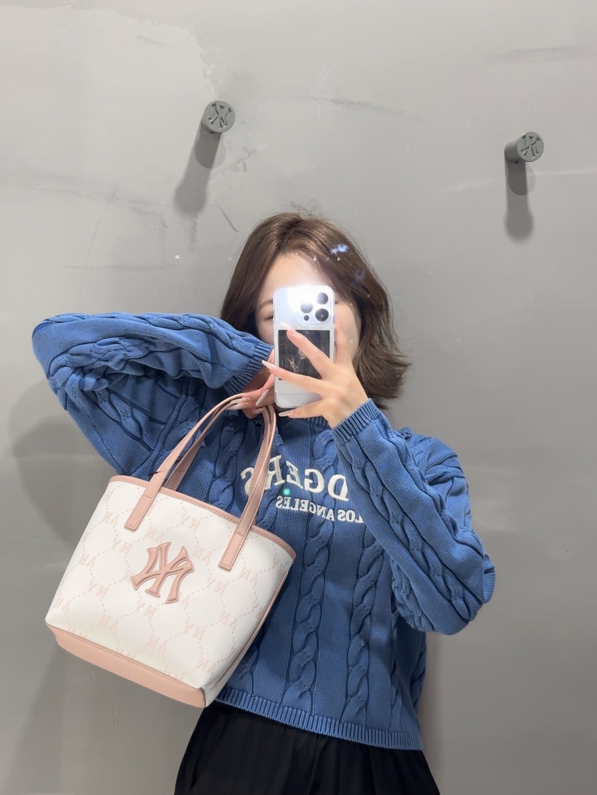 谁懂!MLB粉白托特包和克莱因蓝毛衣配一脸🥳 包包老花+粉棕配色温柔百搭,容量能装下日常刚需,自重轻背一天都不累~ 不过要是有个夹层分类放小物件就更完美啦~ 你们觉得这套搭配咋样?