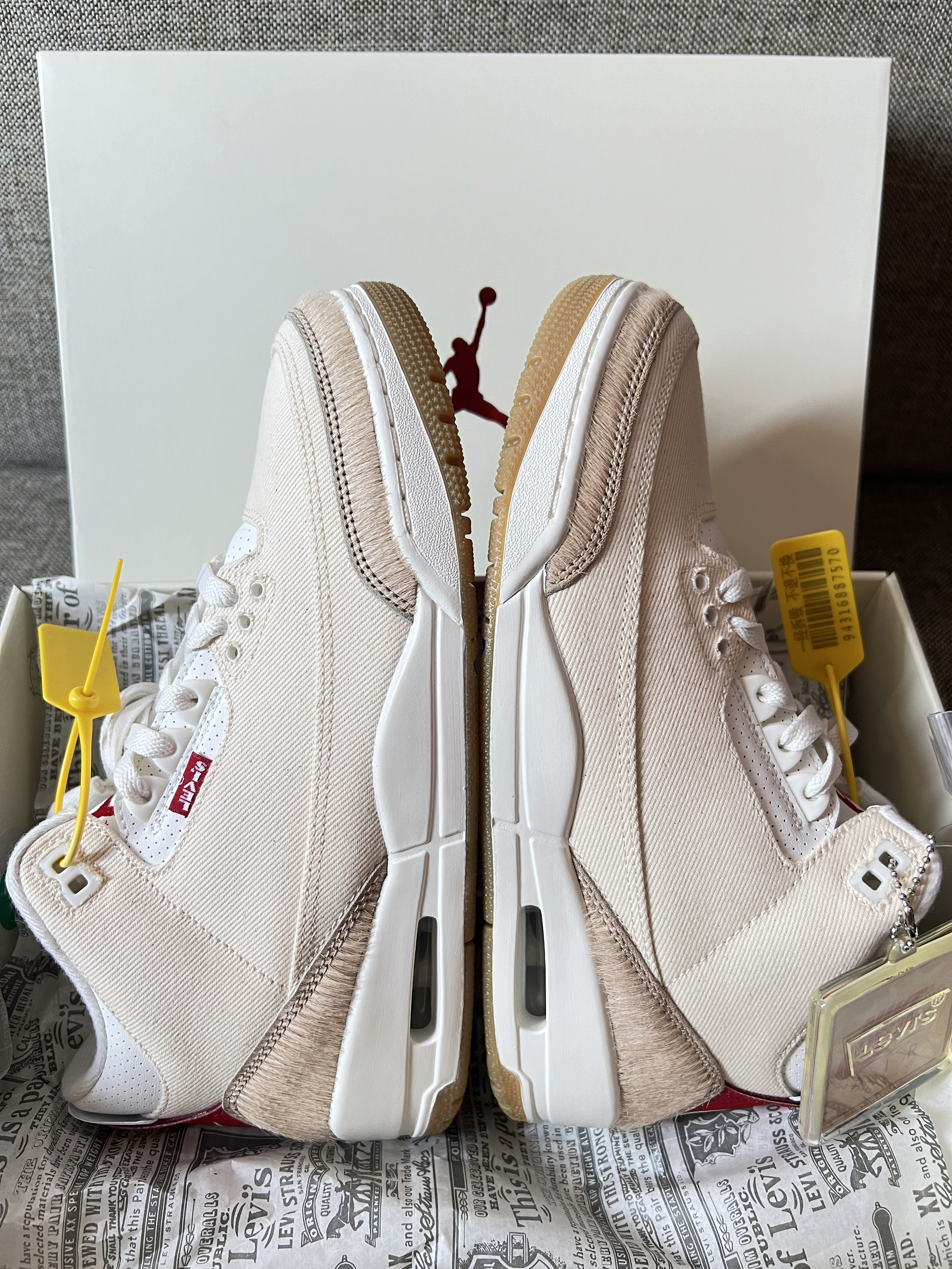 levi’s联名air jordan 3 重磅联名aj3 全鞋丹宁质感 才用了未漂洗的原色丹宁面 质感超前 配件给了额外的三副鞋带和吊牌 唯一的缺点就是不太耐脏 但是不影响它的美