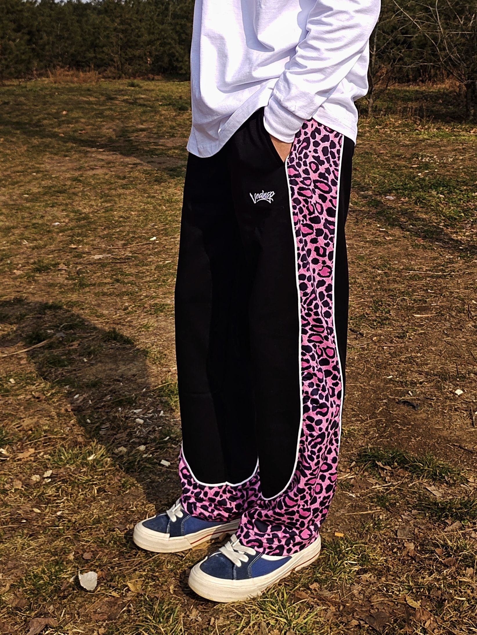 今天上腿的这款长裤来自#维动 VEIDOORN 这条裤子的设计还是比较亮眼👀的 黑色拼粉色豹🐆纹的设计给这个冬天❄️增添的一丝色彩,亮眼而不失低调 回头率不仅在球场🏀,公园散步🚶🏽♀️也是如此 搭配一件白色长袖😎 本人身高176cm,体重72kg 上身尺码L码