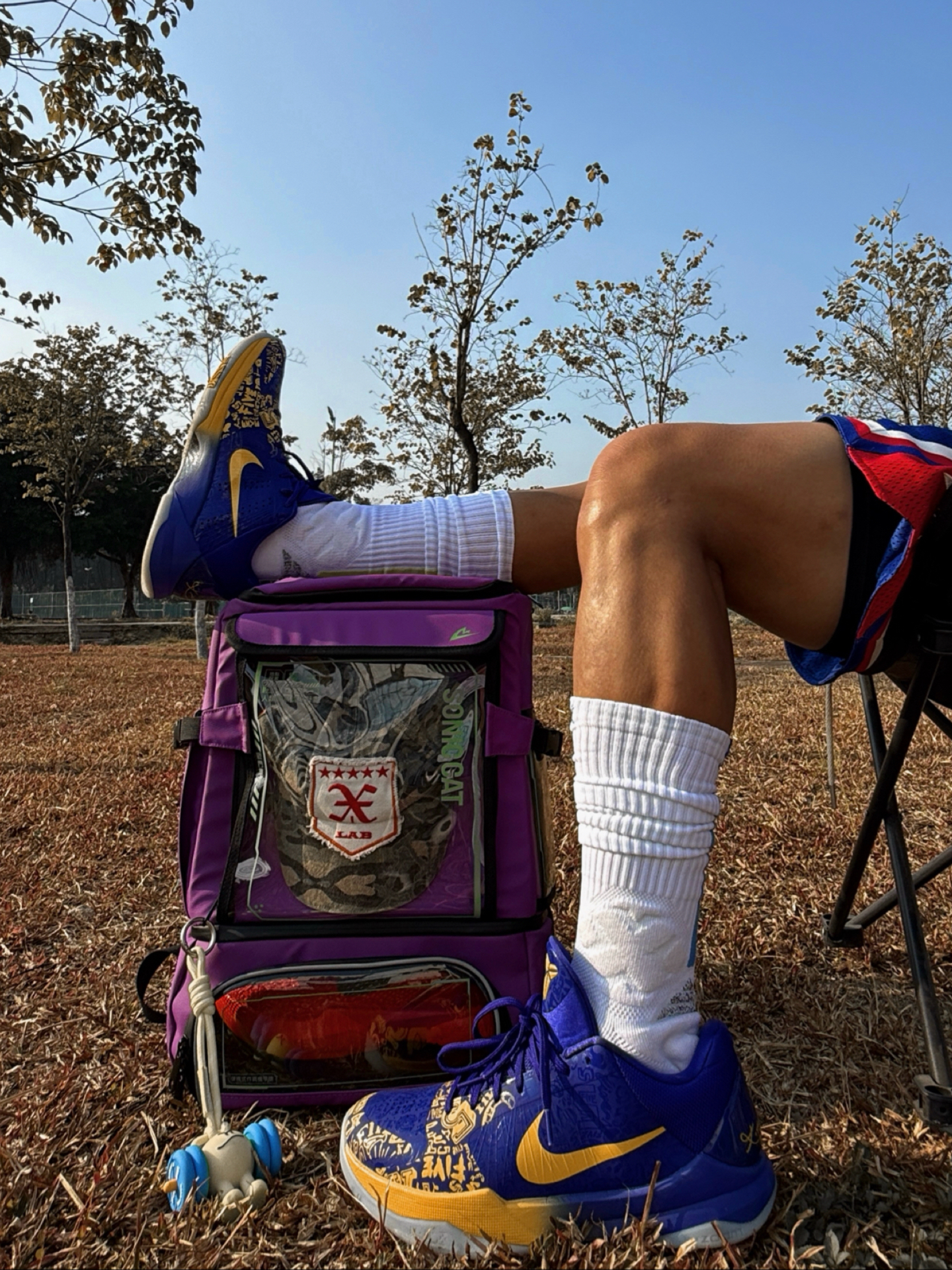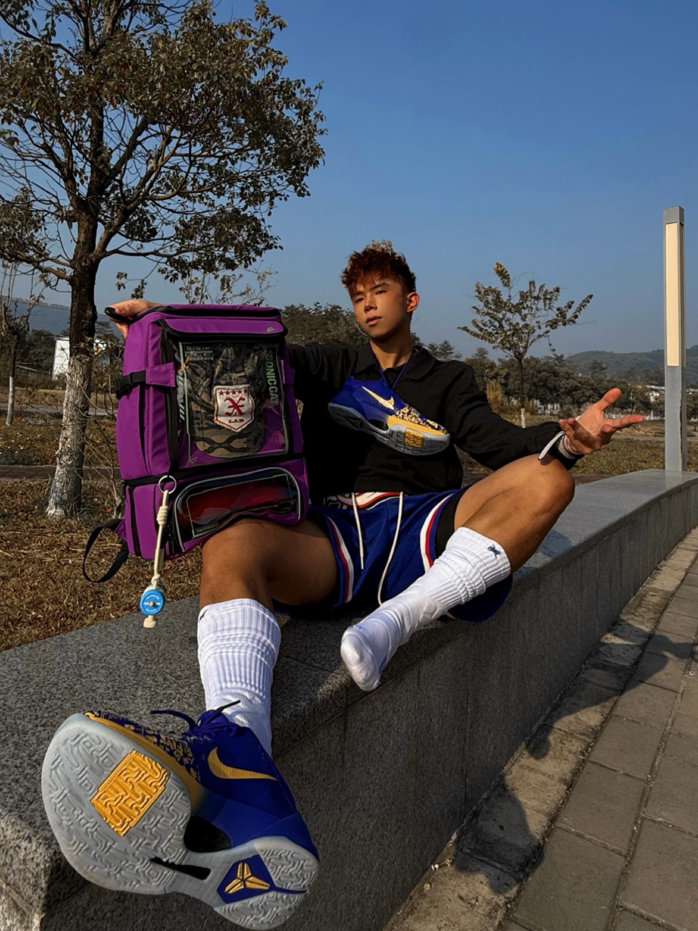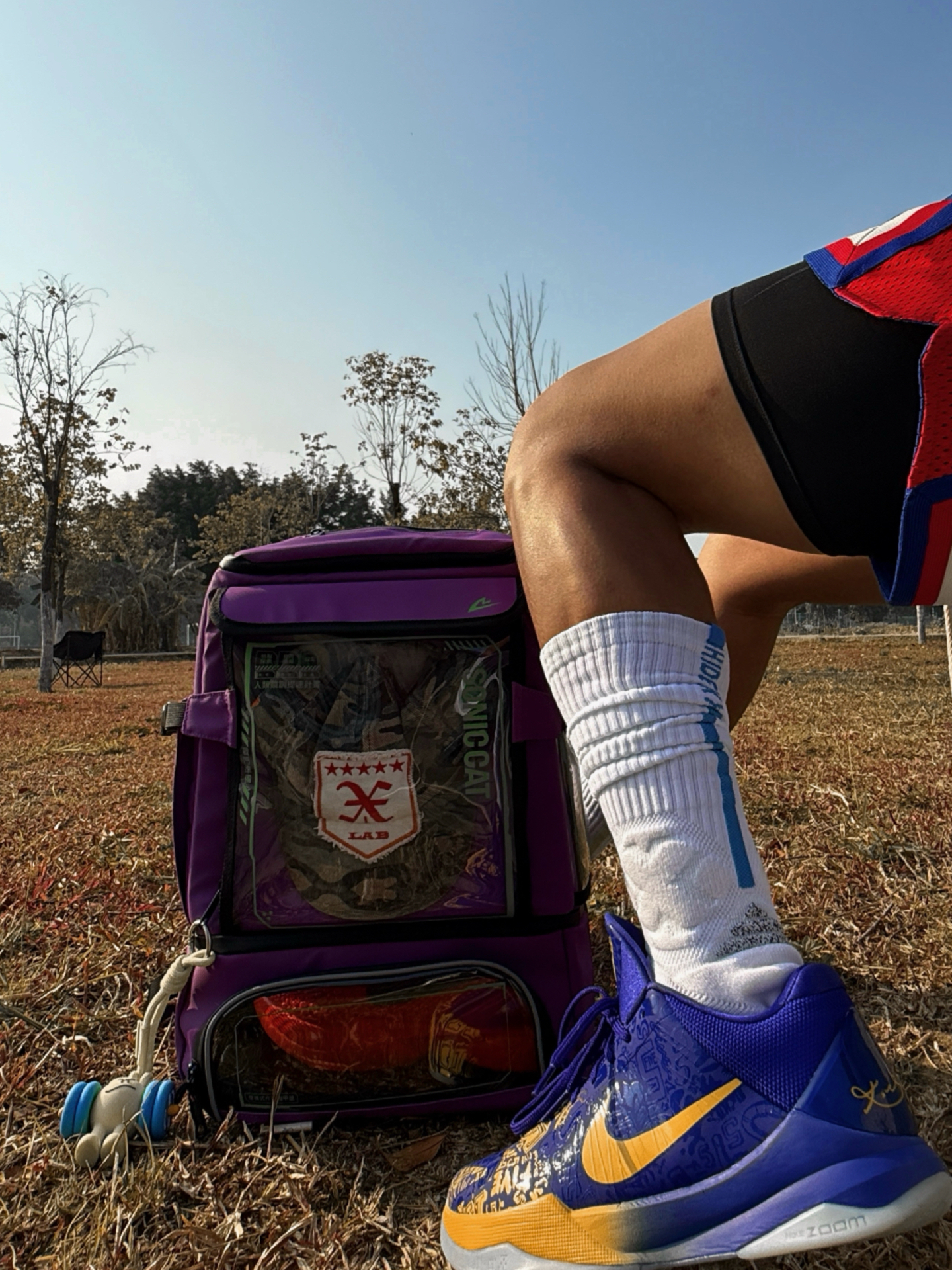 今日穿搭灵感:把球场穿身上 把态度背出门 红白蓝运动短裤点缀美式运动感 紫金球鞋和紫色背包形成视觉焦点 仰拍抬腿躺卧 利用蓝天枯树背景 随性阳光少年感就是如此不经意拿捏🤏 这只双肩包是今日隐藏MVP🎒 ▪️干湿隔离 运动后湿球衣 球鞋分开装 干干净卫生 ▪️大容量+分区明确 从球鞋到篮球 甚至笔记本电脑都能轻松装下 学生党运动党双修 ▪️透明涂层+皮膜材质 可以展示徽章球鞋配件 防水耐磨...