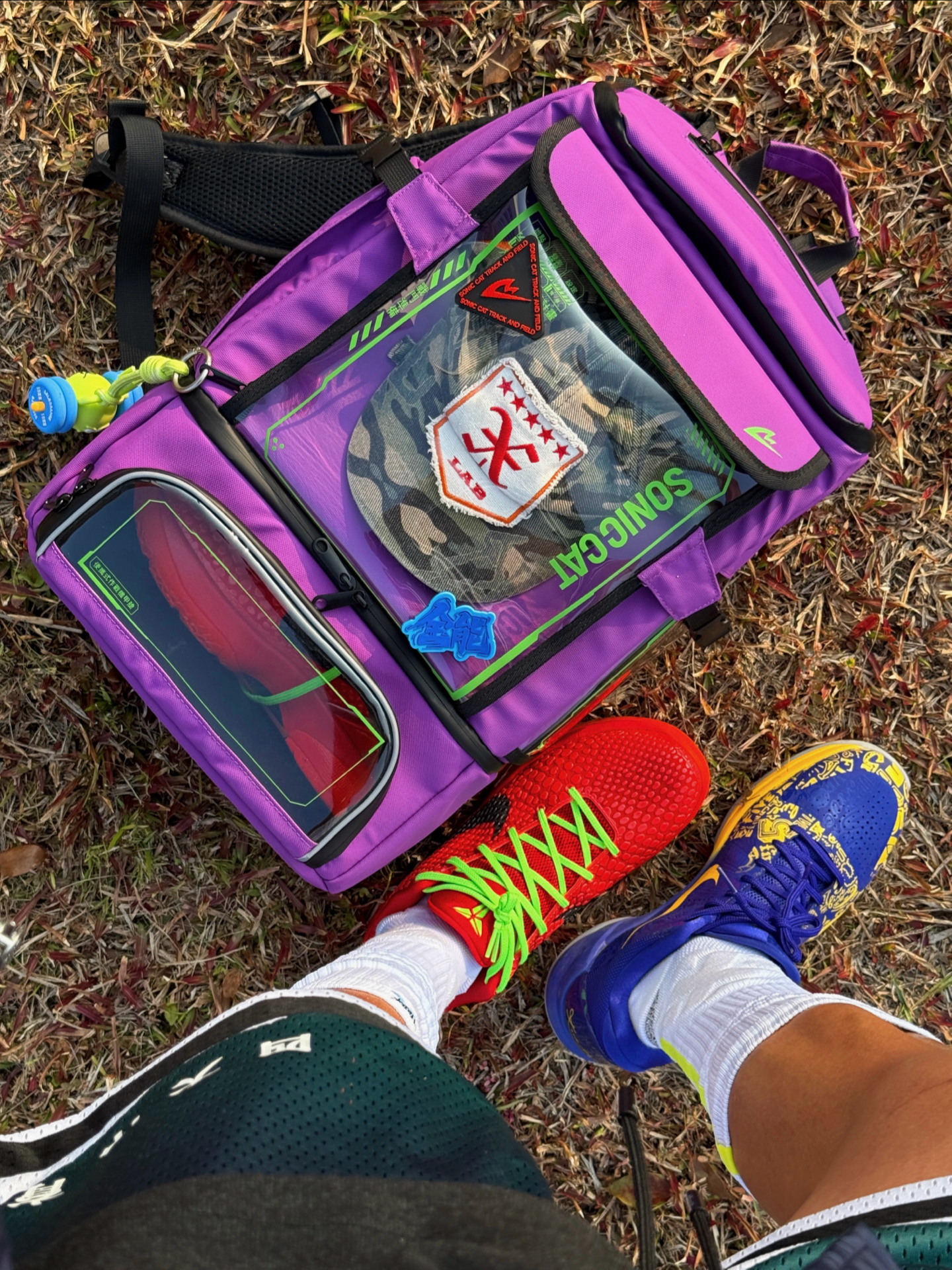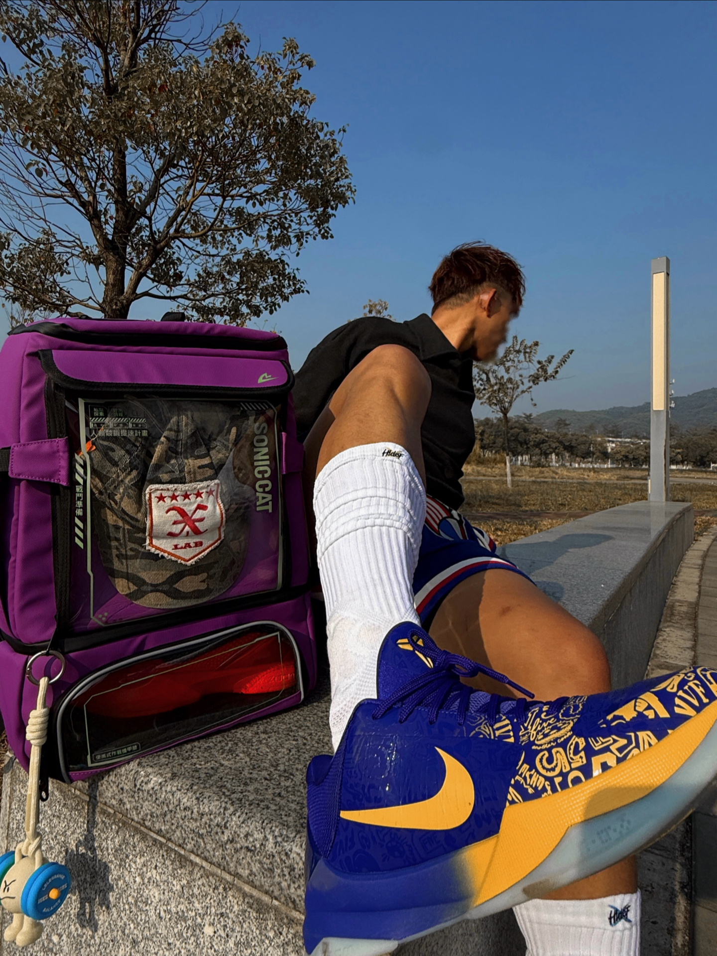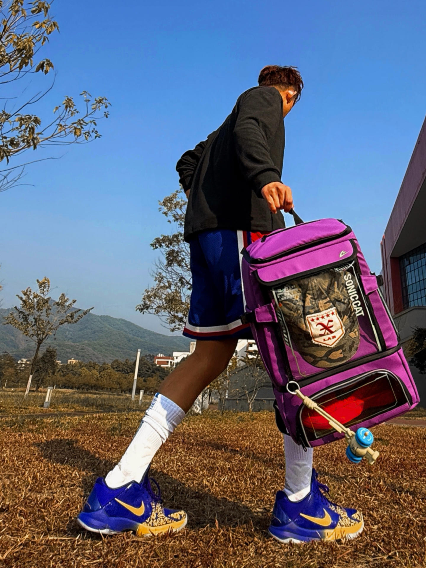 今日穿搭灵感:把球场穿身上 把态度背出门 红白蓝运动短裤点缀美式运动感 紫金球鞋和紫色背包形成视觉焦点 仰拍抬腿躺卧 利用蓝天枯树背景 随性阳光少年感就是如此不经意拿捏🤏 这只双肩包是今日隐藏MVP🎒 ▪️干湿隔离 运动后湿球衣 球鞋分开装 干干净卫生 ▪️大容量+分区明确 从球鞋到篮球 甚至笔记本电脑都能轻松装下 学生党运动党双修 ▪️透明涂层+皮膜材质 可以展示徽章球鞋配件 防水耐磨...