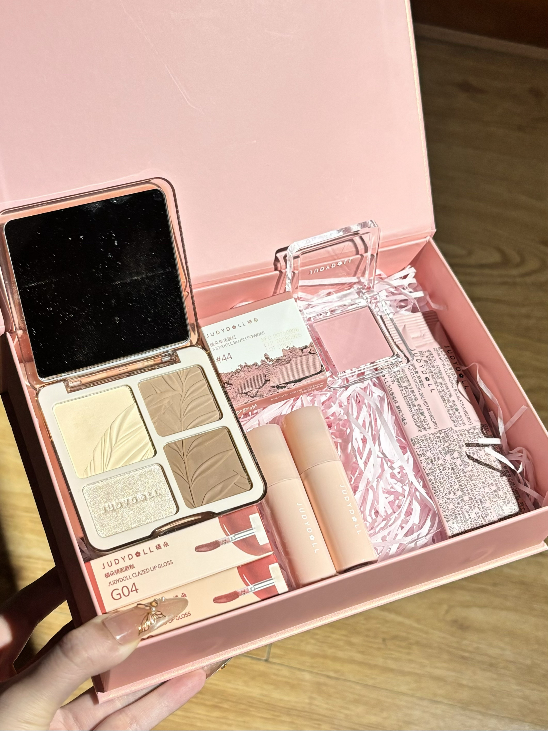 新手彩妆套盒被我挖到宝了!橘朵这个礼盒真的太适合化妆小白了✨ 里面的单品都是刚需,没有鸡肋,百元预算就能搞定全妆,性价比直接拉满。 • 四色修容盘: 颜色都很日常,不会重手,新手也能轻松打造立体轮廓,哑光高光填充泪沟超绝,细闪高光打在颧骨上超好看。 • 唇釉: 质地丝滑不拔干,#G03温柔豆沙,#G04显白红棕,素颜、通勤都能涂,黄皮姐妹也能轻松驾驭。 • 腮红: 低饱和灰粉色,上脸是那种天...