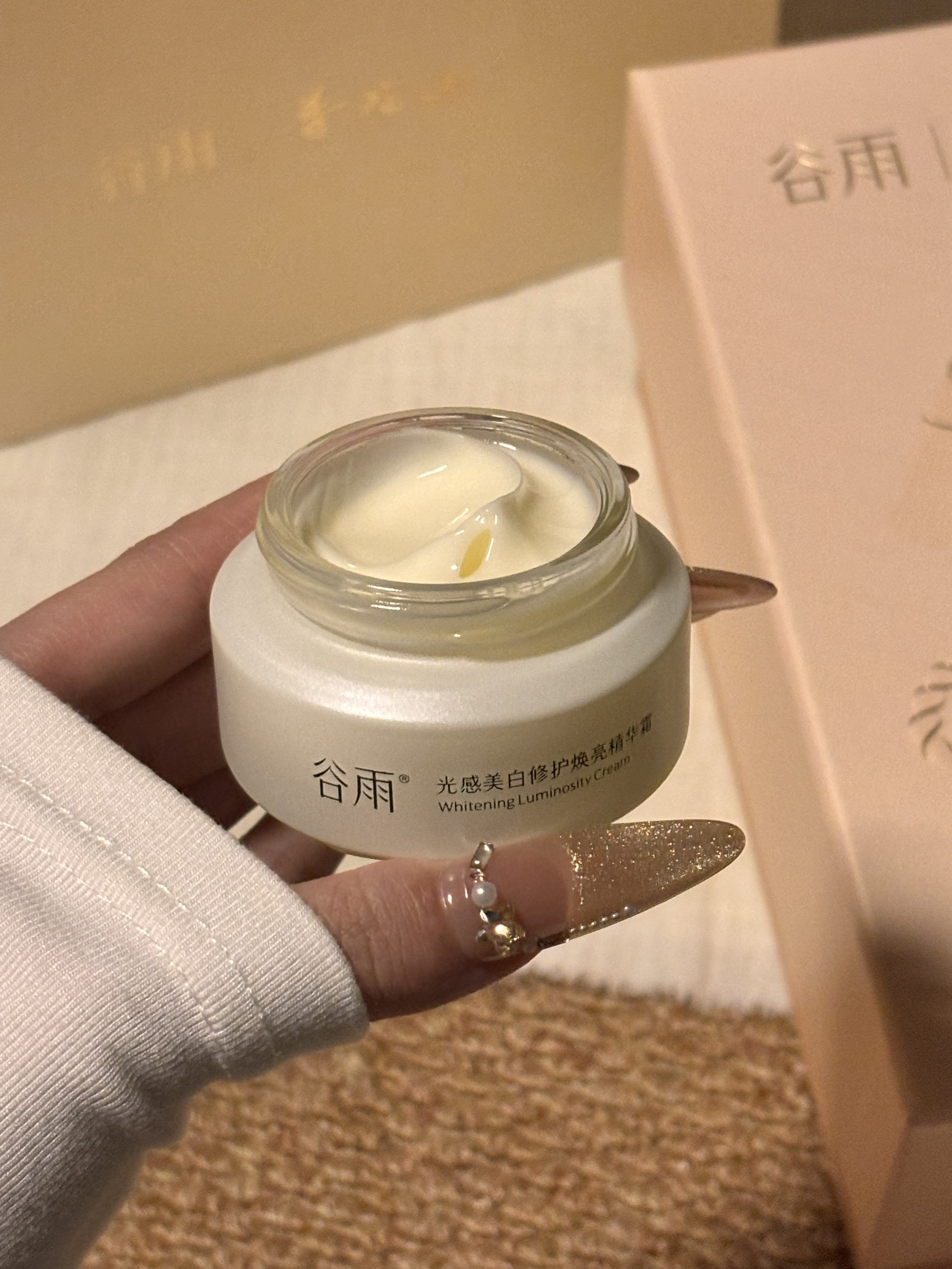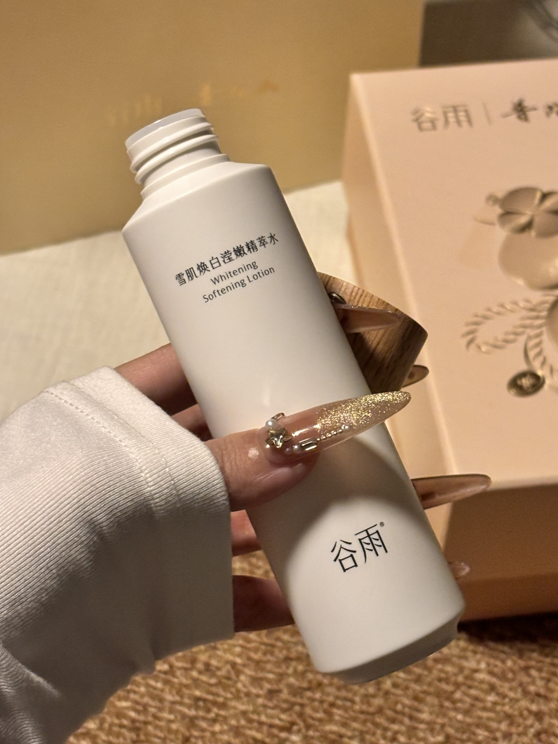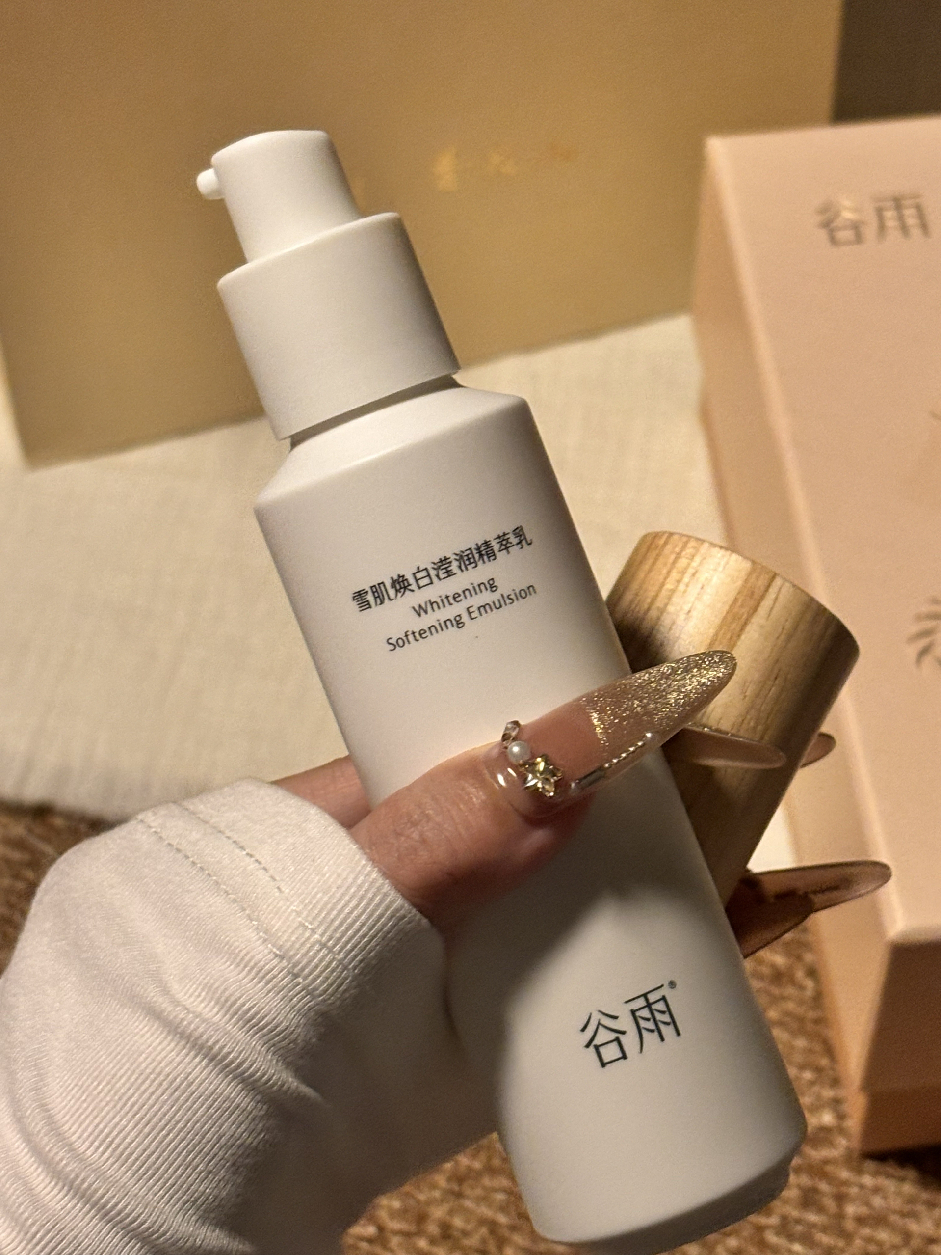 宝子们!新年护肤礼盒我真的挖到宝了!就是这套谷雨美白奶罐礼盒,颜值和实力双在线,送人自用都超有面儿~ 我来给你们好好唠唠里面的每一样宝贝👇 • 光感美白控色精萃水 质地很清爽,像水一样,拍在脸上吸收超快,完全不黏腻。里面有光果甘草和烟酰胺,主打一个先给皮肤“喝饱水”,再把暗沉黄气赶跑,后续上妆也更服帖了。 • 奶感透润嫩精华乳 乳液的质地像融化的奶霜,推开就化水,保湿力很在线但不会闷痘。它和...