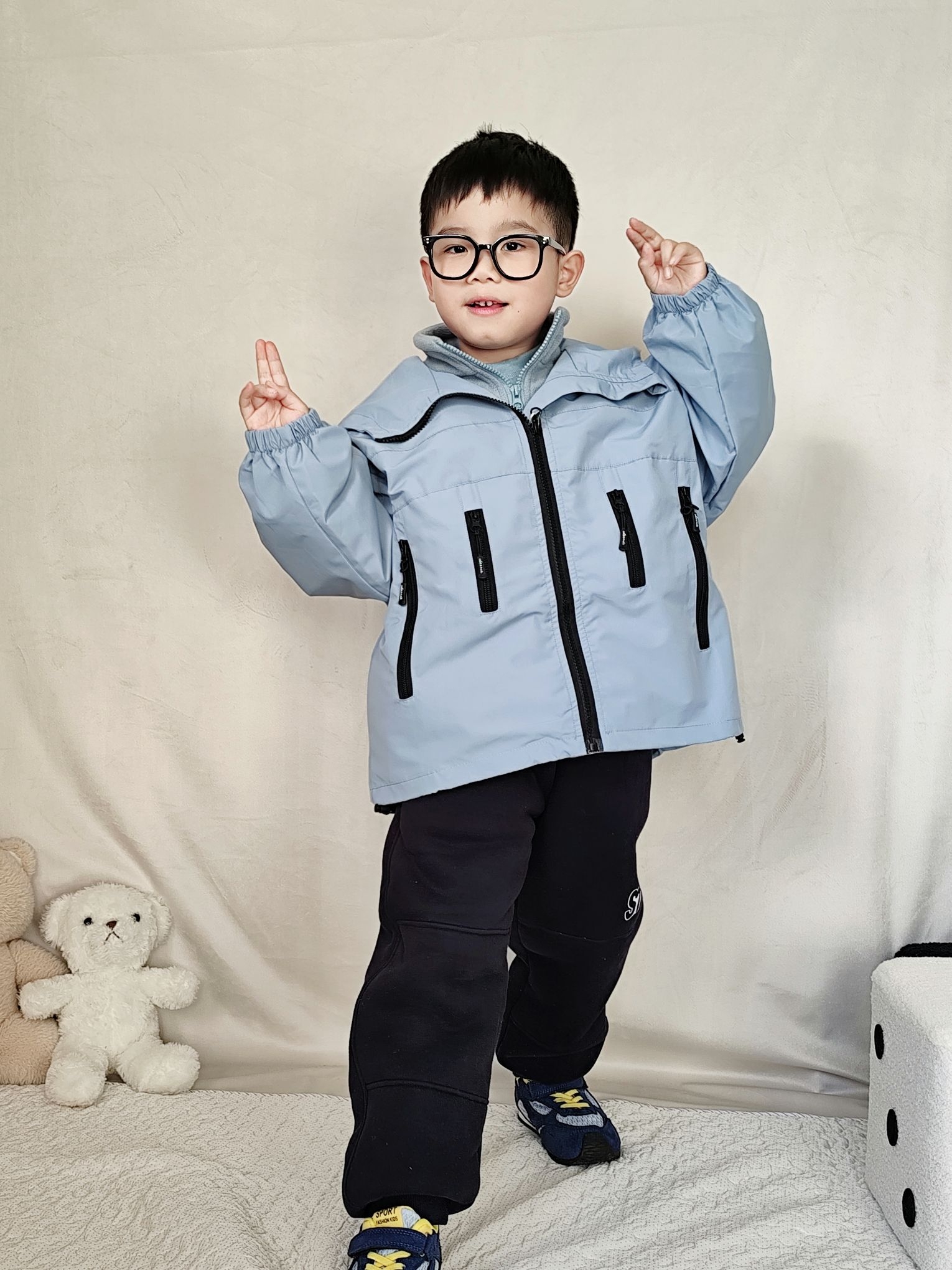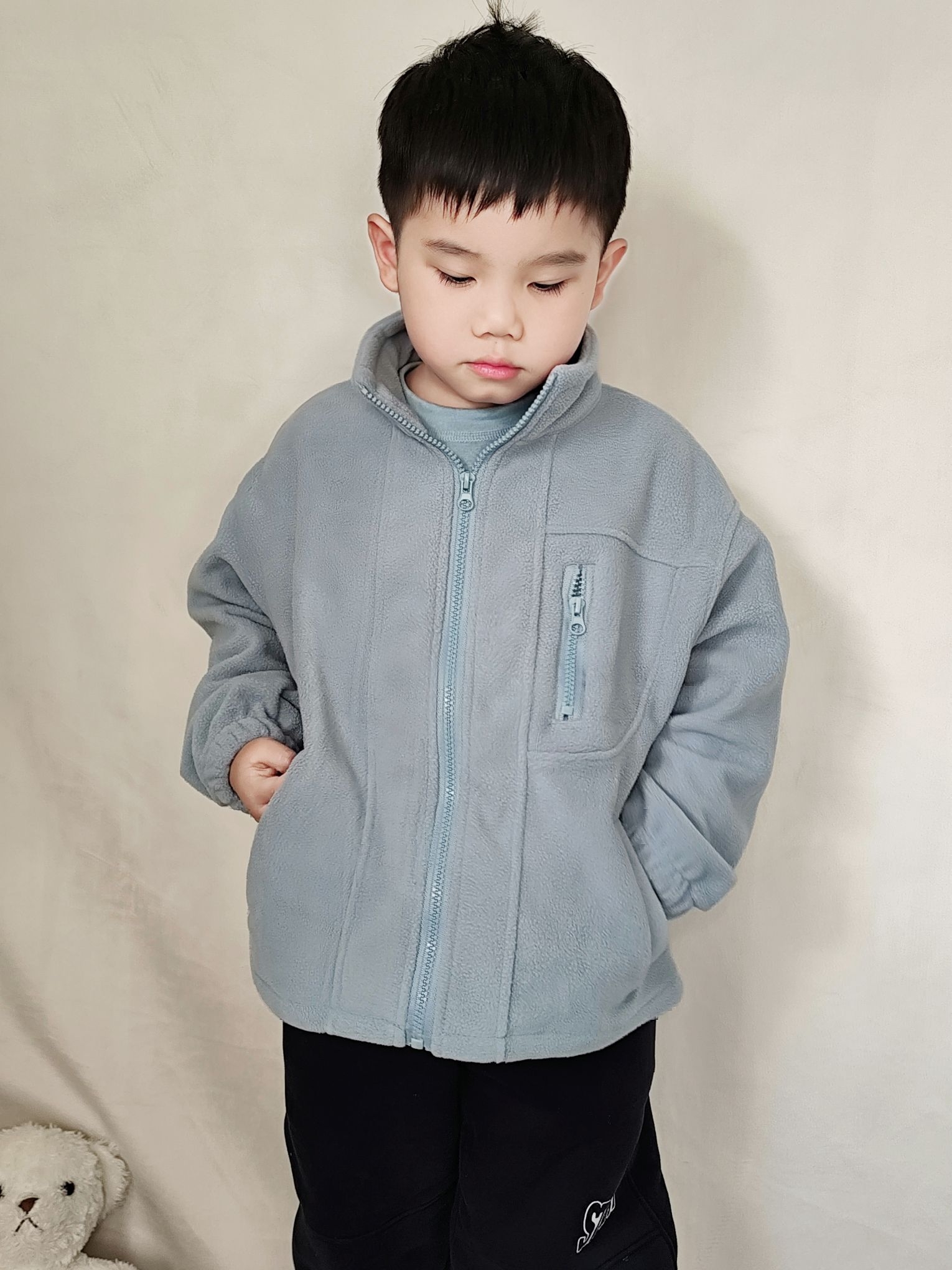 家人们!被我挖到5岁男童秋冬王炸穿搭!💥 我家娃穿这套出门,小区宝妈追着问了三条街! 这件浅蓝冲锋衣是真的绝——假两件设计自带层次感,大口袋+黑色拉链细节拉满,面料防风还软乎乎,娃穿脱方便,内搭加绒也不显臃肿!假两件设计特别适合现在早晚温差大天气,完全不怕娃感冒,老母亲超省心,宸宝穿120码刚好还能套厚毛衣!北方现在穿刚好抗风,南方搭个薄内搭就能出门~ 裤子是藏青加绒卫裤,侧面字母标潮到不行,跑...