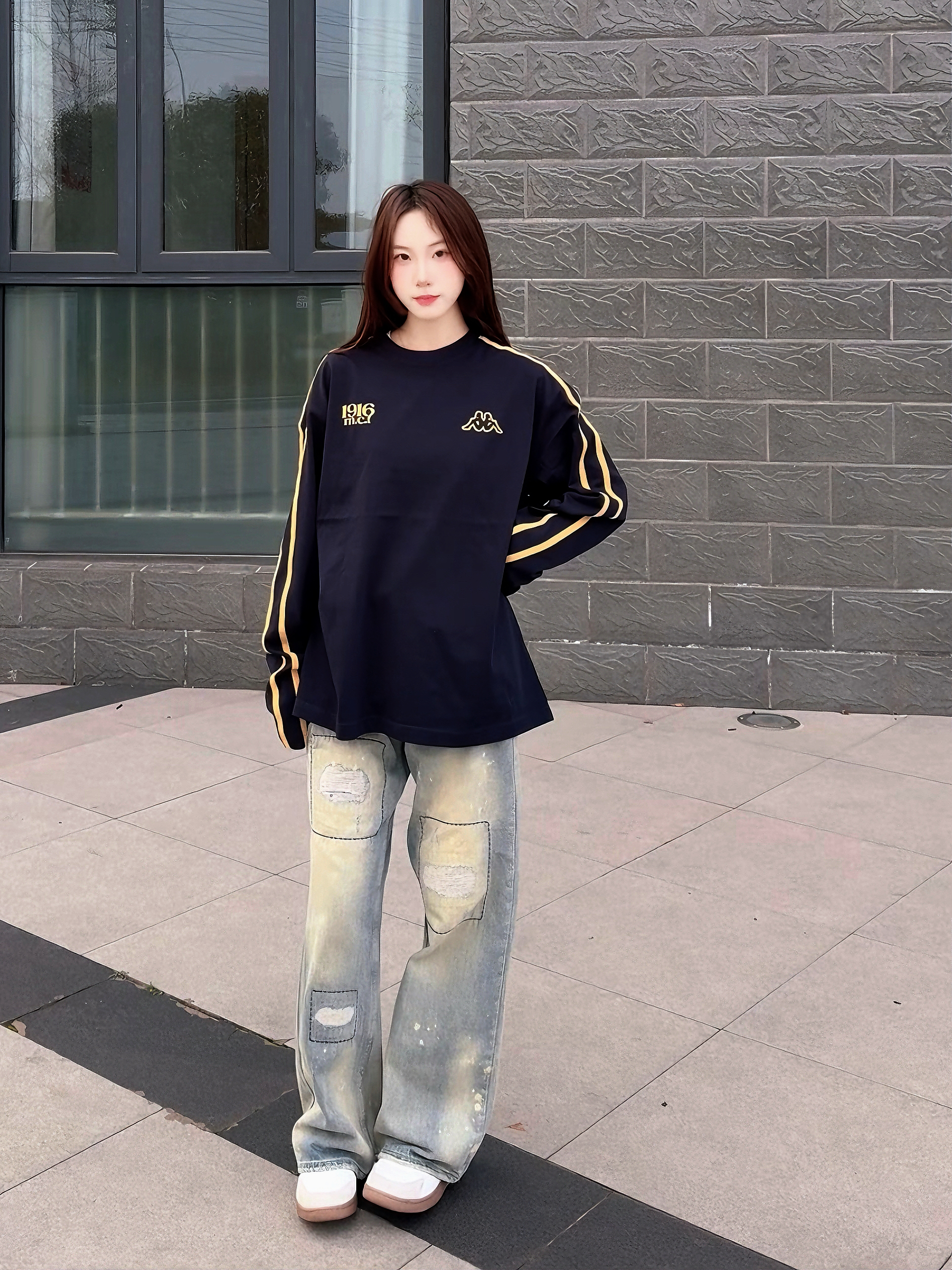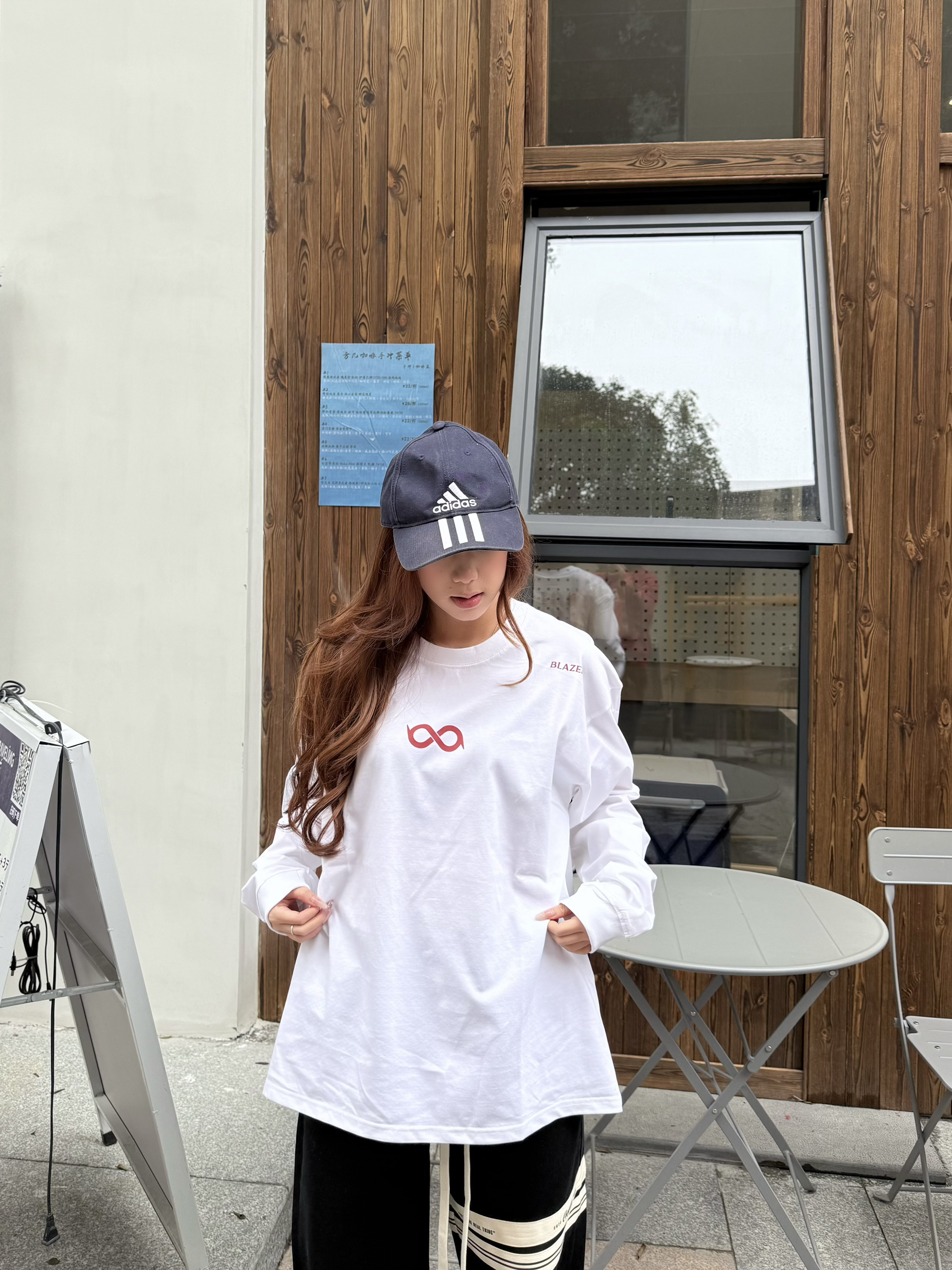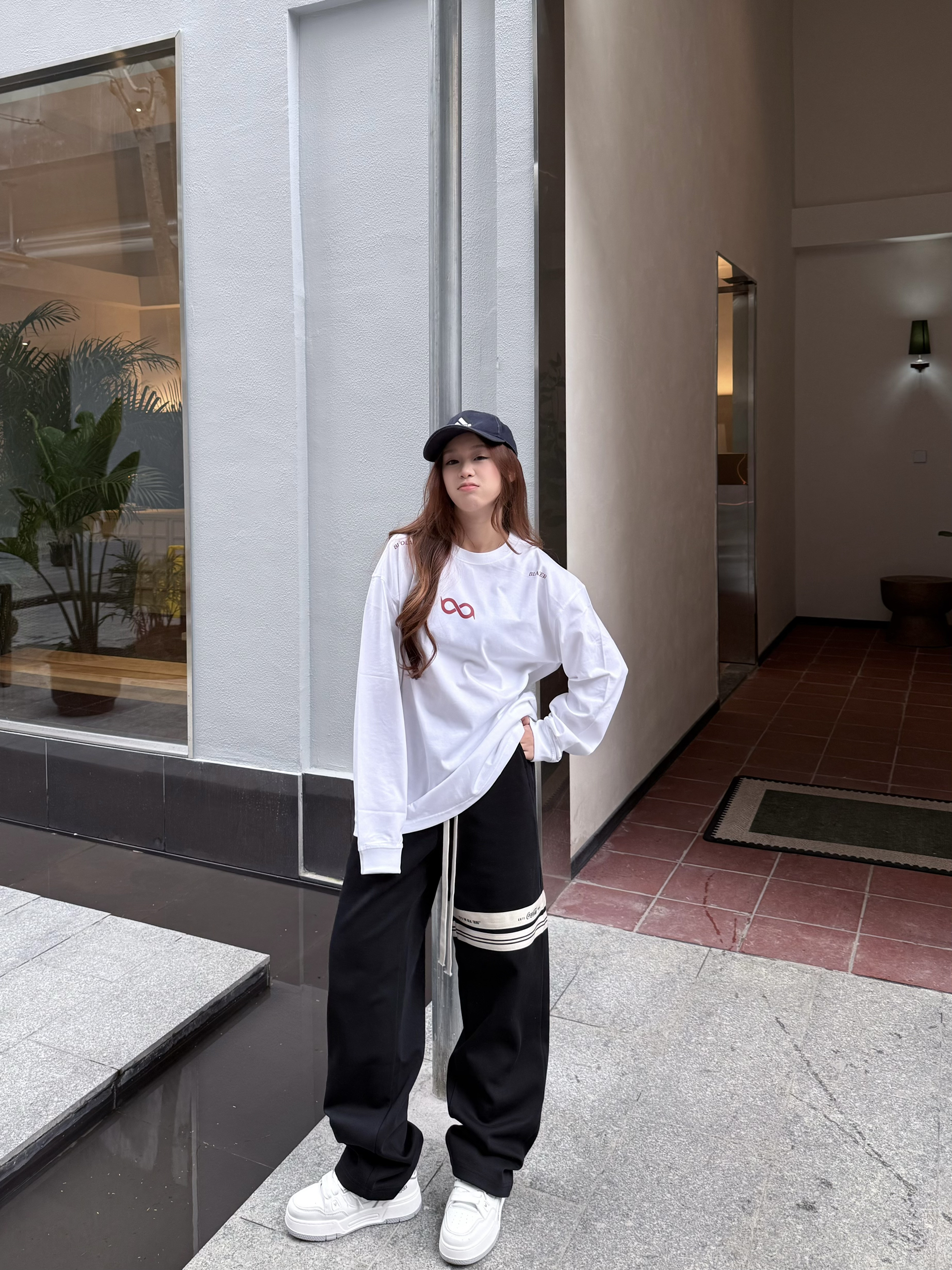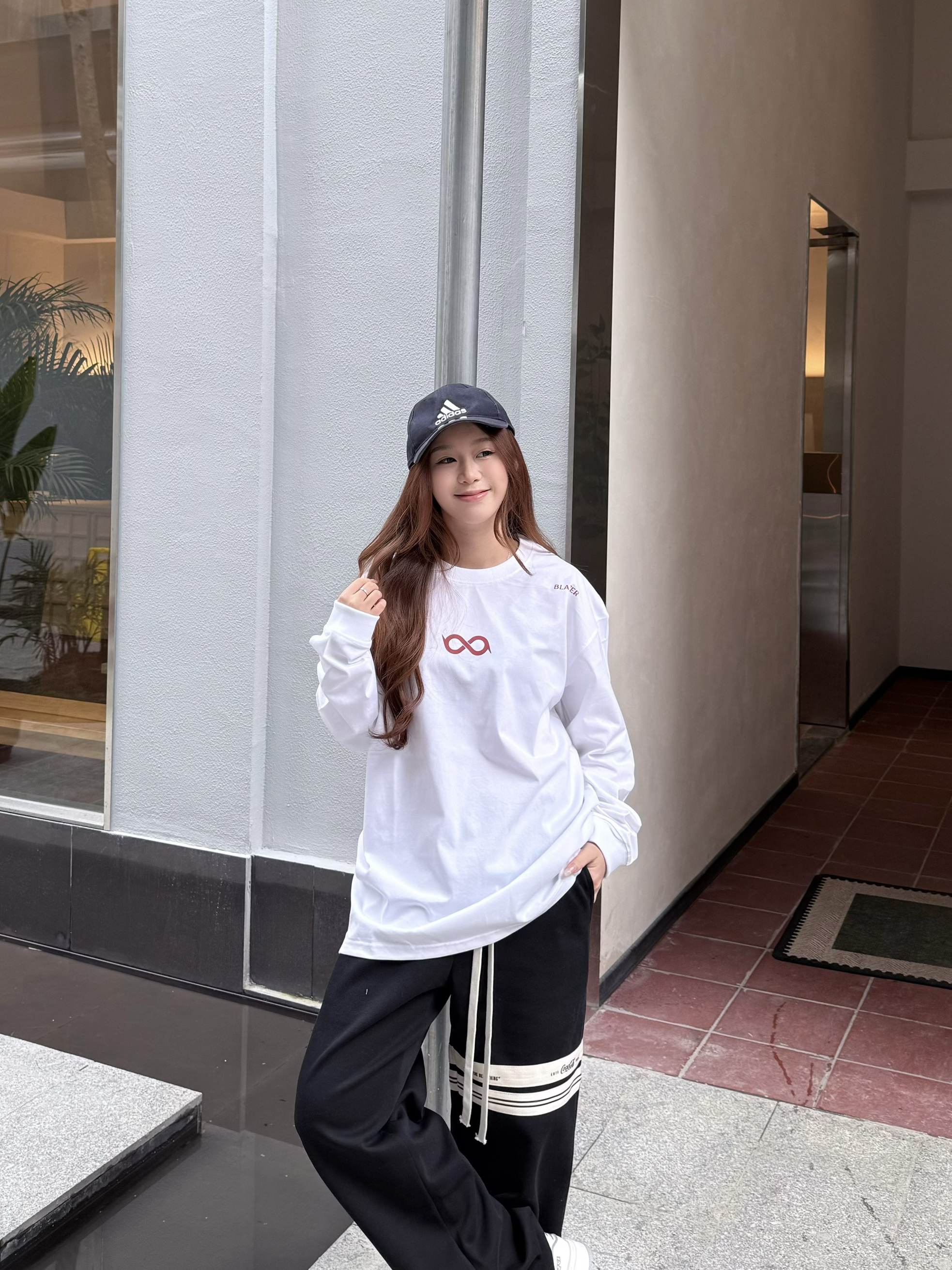 这件一眼长袖我一眼爱上! 白色底显干净,粉红字体温柔又有记忆点 无限循环断开字设计很特别,街头感🆙 长袖版型很日常,我160/45kg穿s码 宽松但不拖沓,叠穿外套也很加分💯 介就是我的开春体面内搭啦~