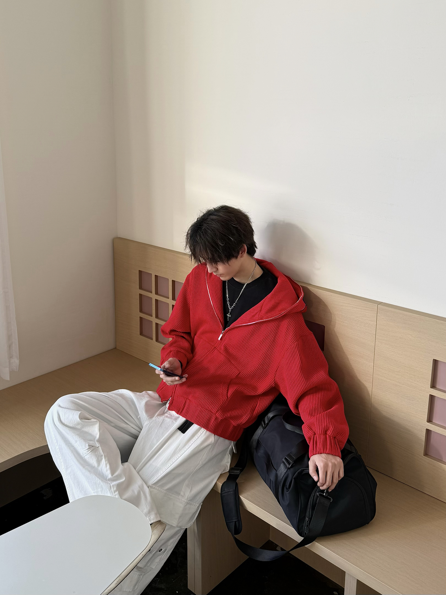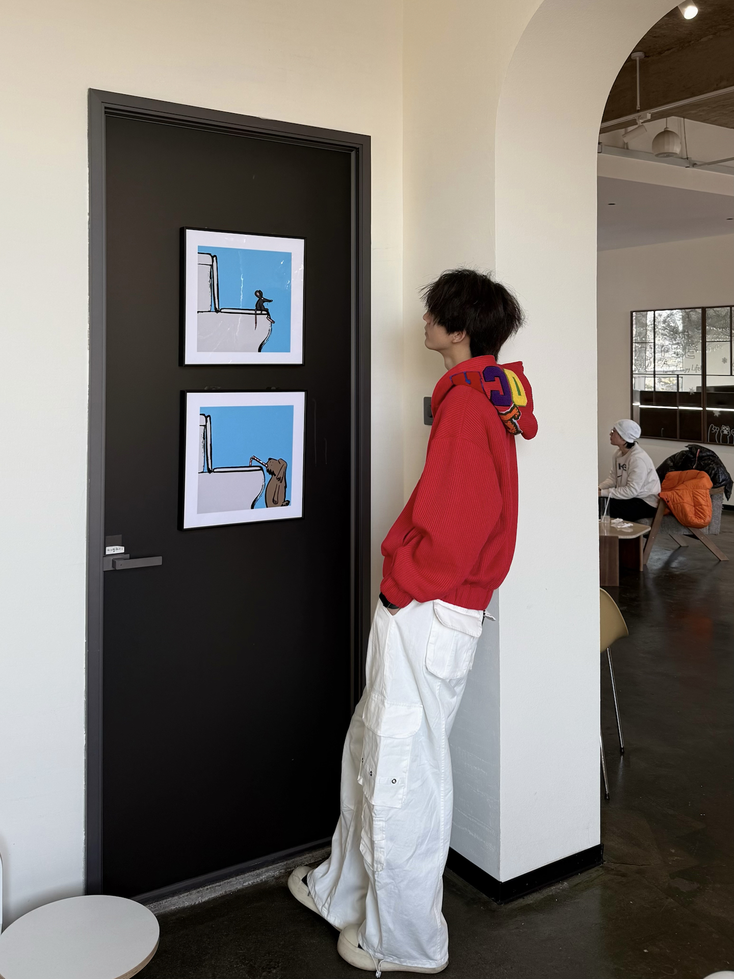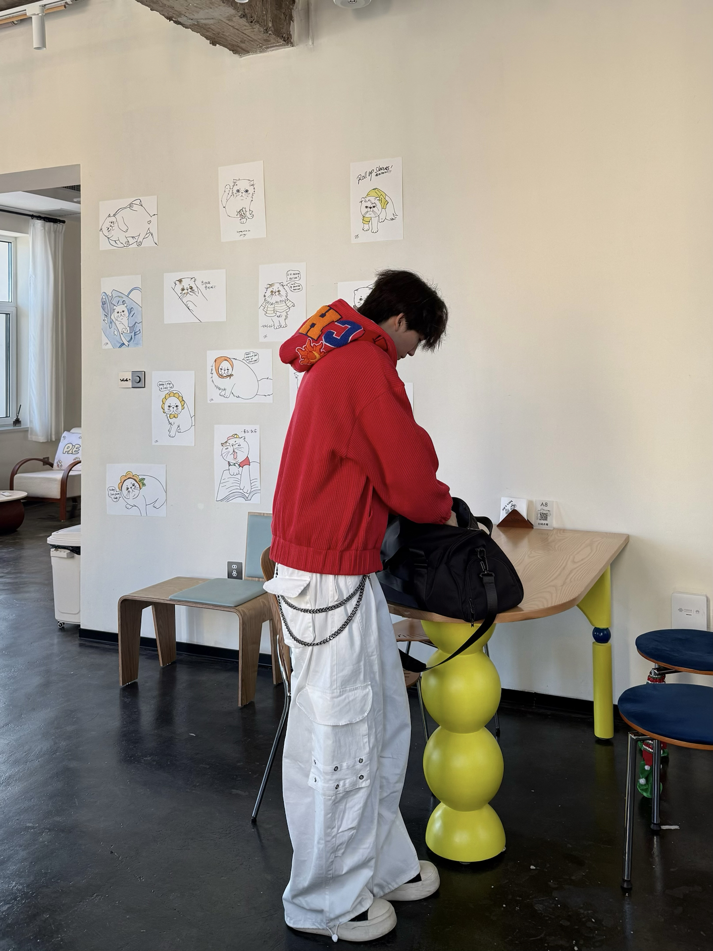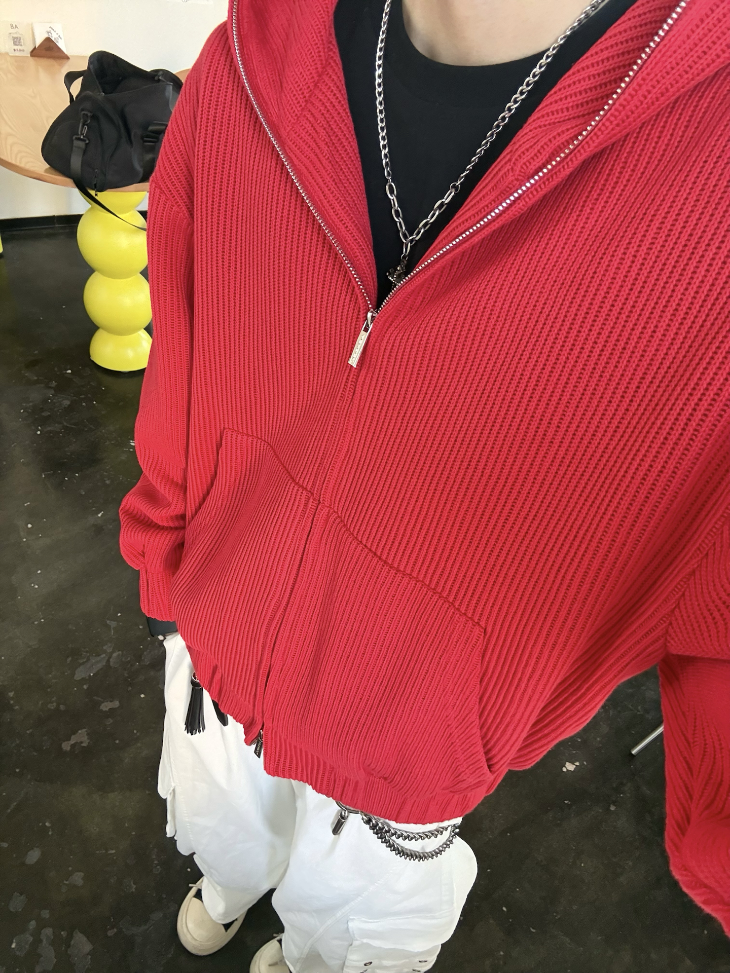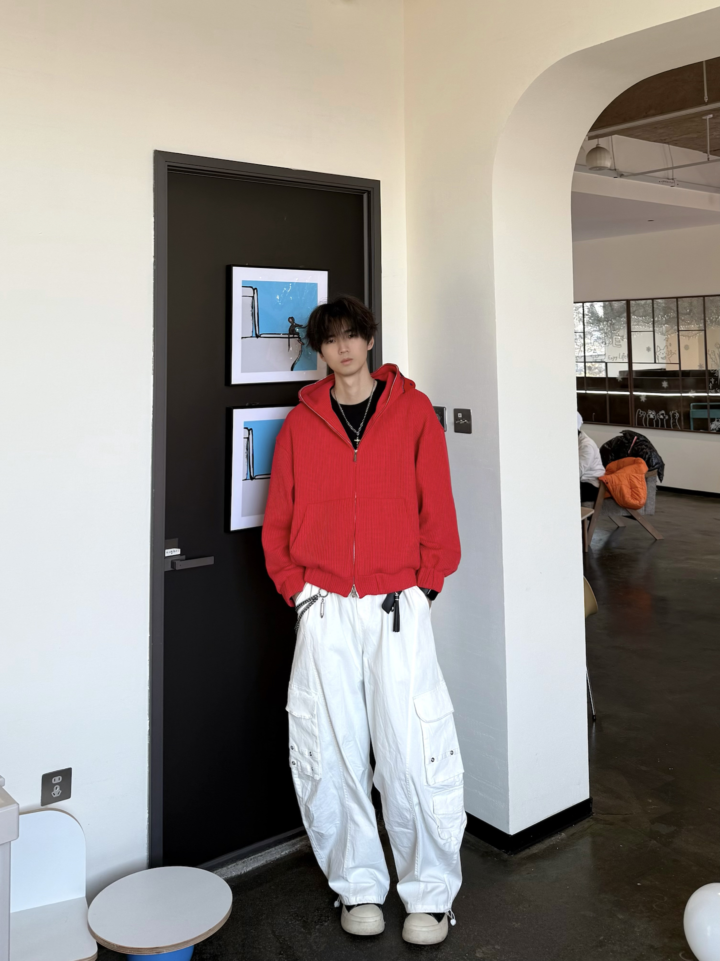 今天出门主打一个“红的炸眼🔴” 搞了件Achock红色针织帽衫 配上白工装裤 本来还闲挺显眼的 没想到到店里还挺搭✅ 刚好能跟墙上卡通画板🎆呼应上 整身的点睛之处👀 就是帽子上的彩色 配上半拉不拉的拉链 微微露出内搭和配饰 层次这一块 也算拿捏了 毕竟本历年嘛 总要搞点红色来挂彩的🧨 #卫衣终于开窍了 #宝藏男生的氛围感卫衣 #美式时尚休闲百搭连帽卫衣 #美式潮流百搭连帽卫衣 #这么搭配卫衣包帅...