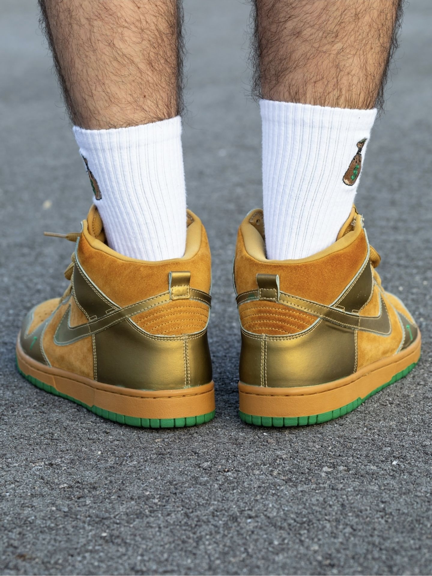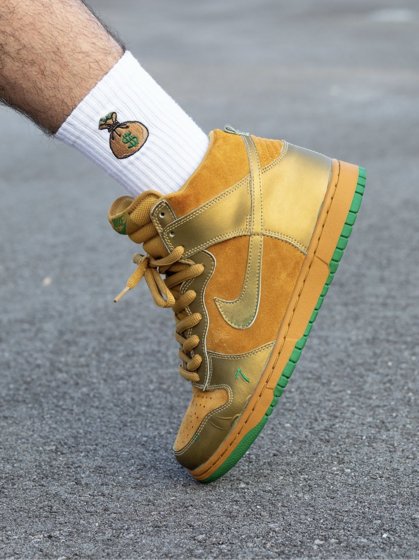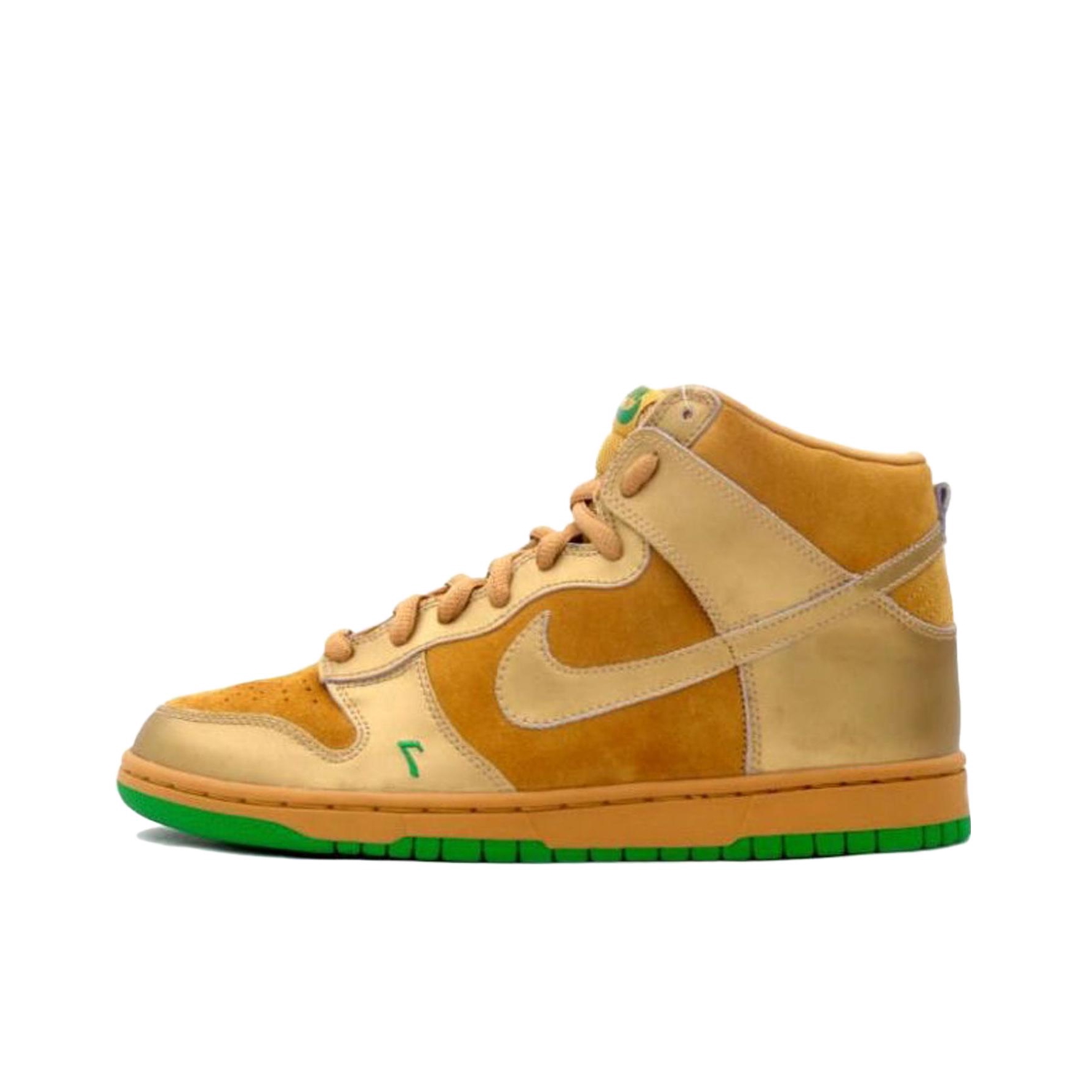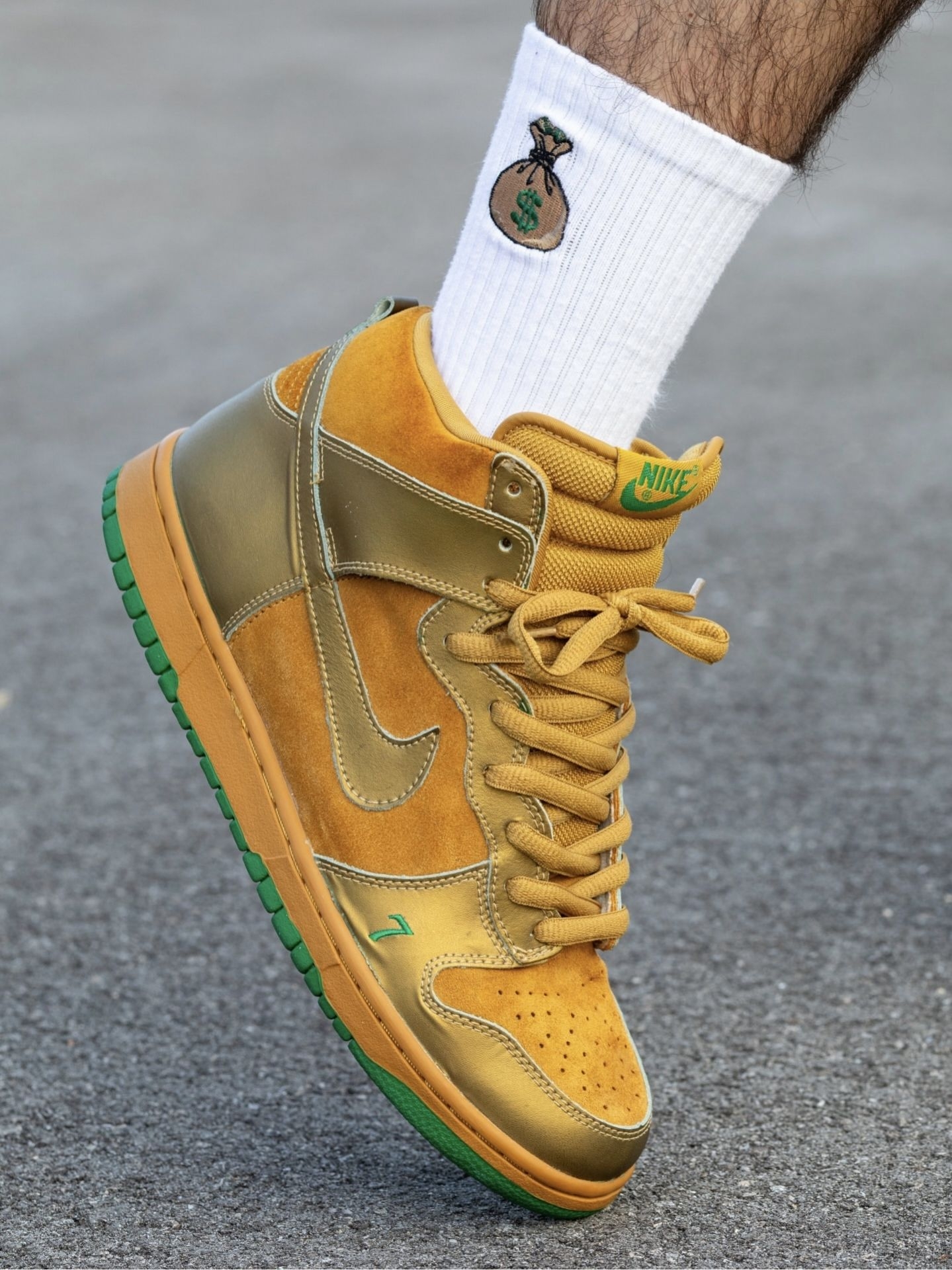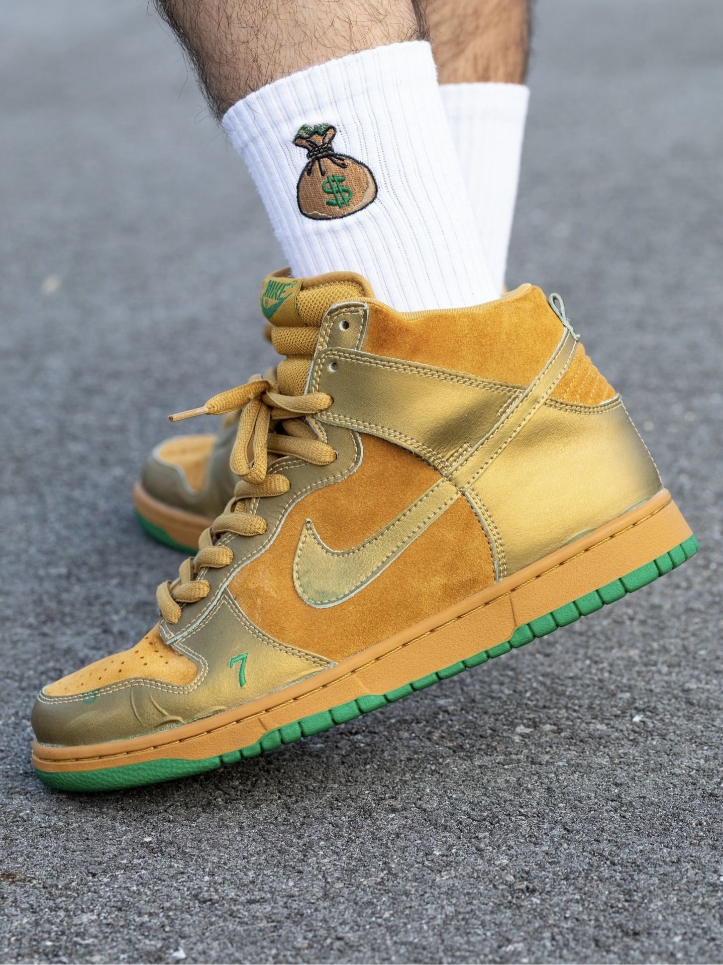 我直呼亮眼,这双“Lucky 7”是那种能把街头气场直接拉满的金色战靴。 我越看越爱,鞋身的小麦色翻毛皮拼接鎏金皮革,像把街头滑板场的阳光都揉进了质感里。翻毛皮的细腻触感和亮面皮革的光泽感碰撞出层次,高帮设计给脚踝稳稳的包裹感,搭配印着钱袋图案的白袜,“幸运暴富”的氛围感直接拉满。橡胶大底的绿色边缘是点睛之笔,抓地力稳定又暗藏幸运细节,刷街时踩过柏油路都带着底气。 我越穿越爱,辨真假就看俩...