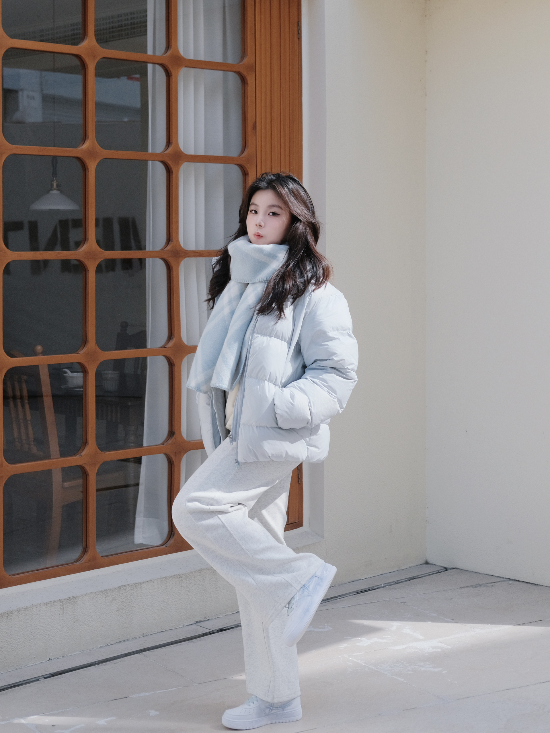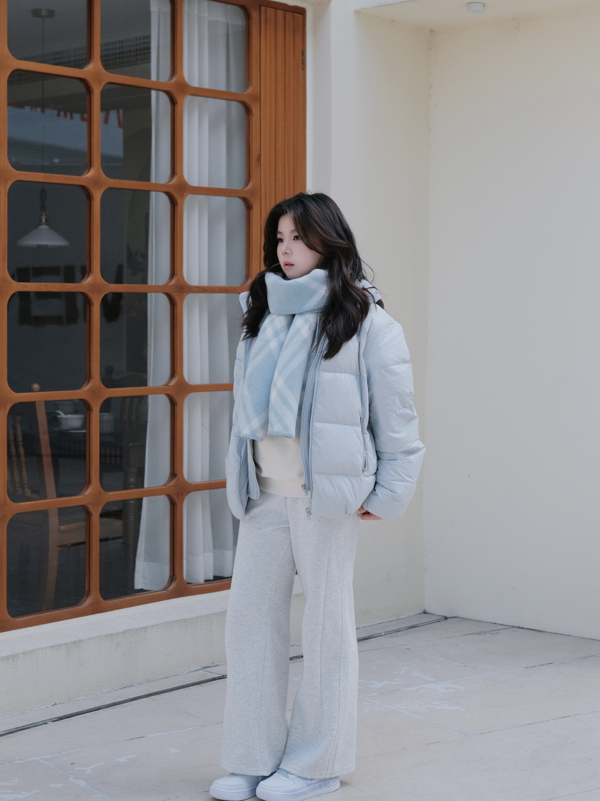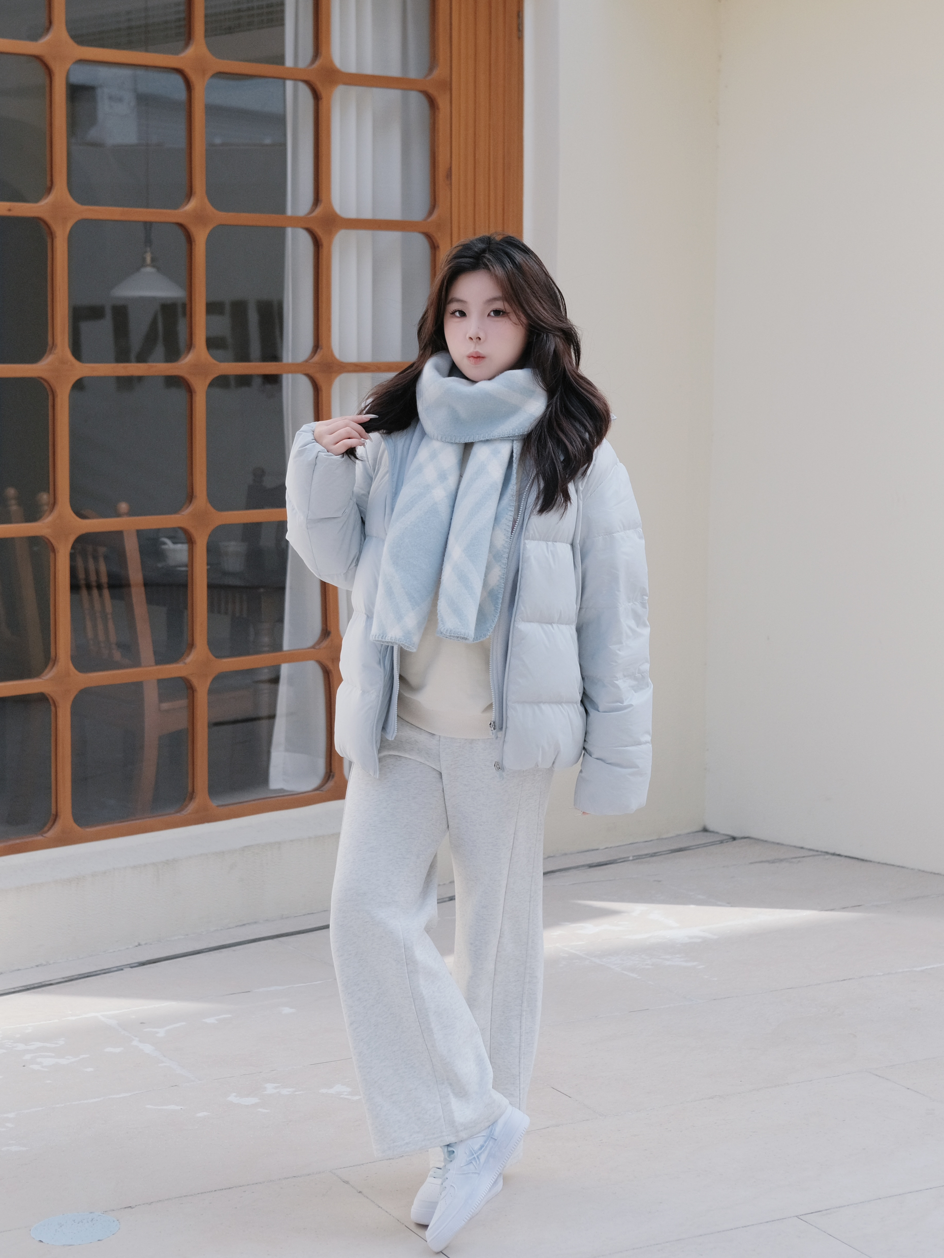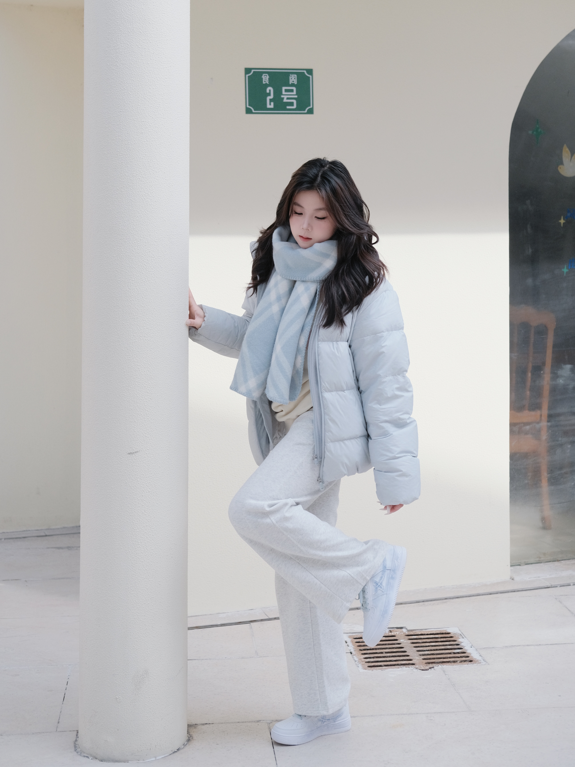 冬日白蓝配一下 蓝色羽绒服+碎冰蓝板鞋 感觉特别有氧气感 这个板鞋是特步定制鞋 走路还是挺轻便的 日常穿搭也能穿出独特的风格