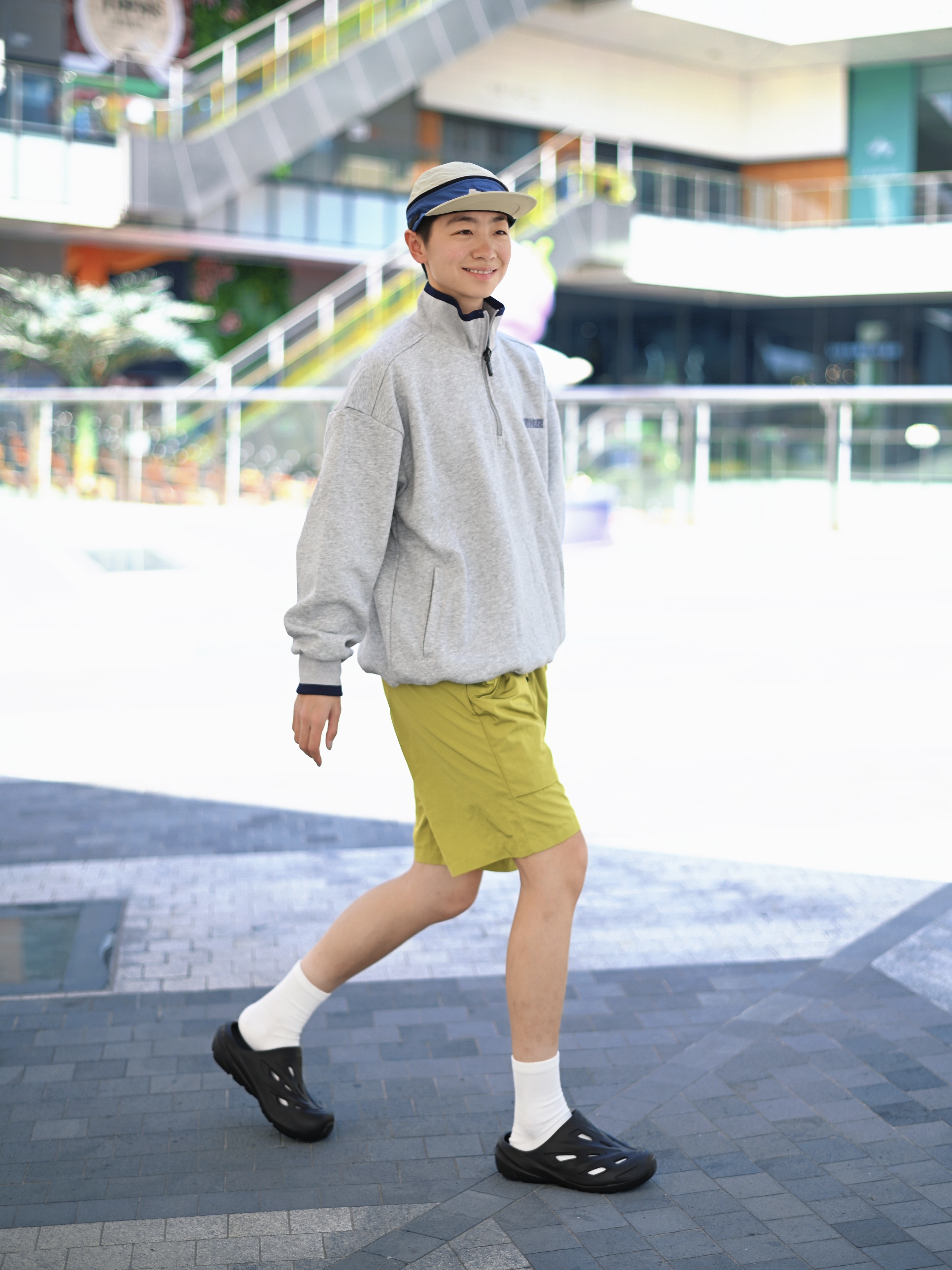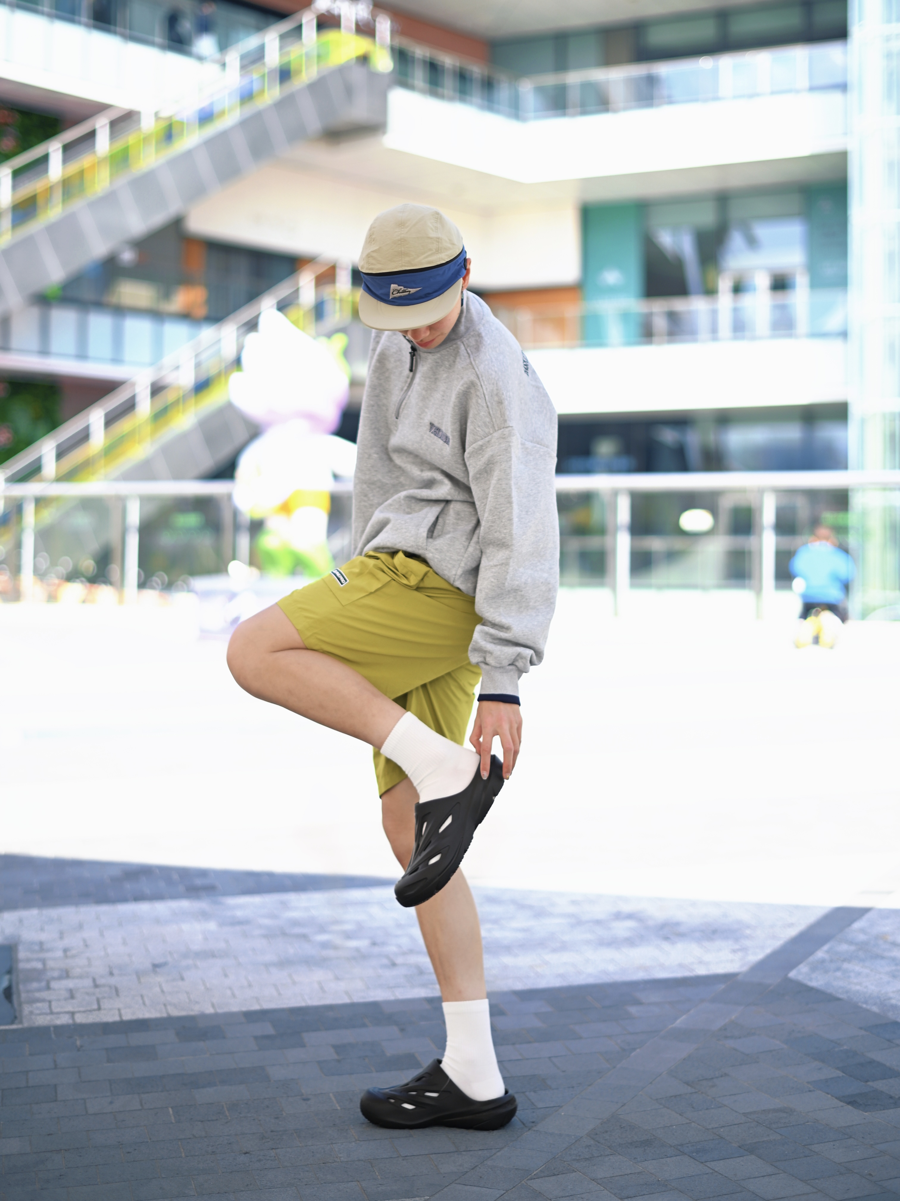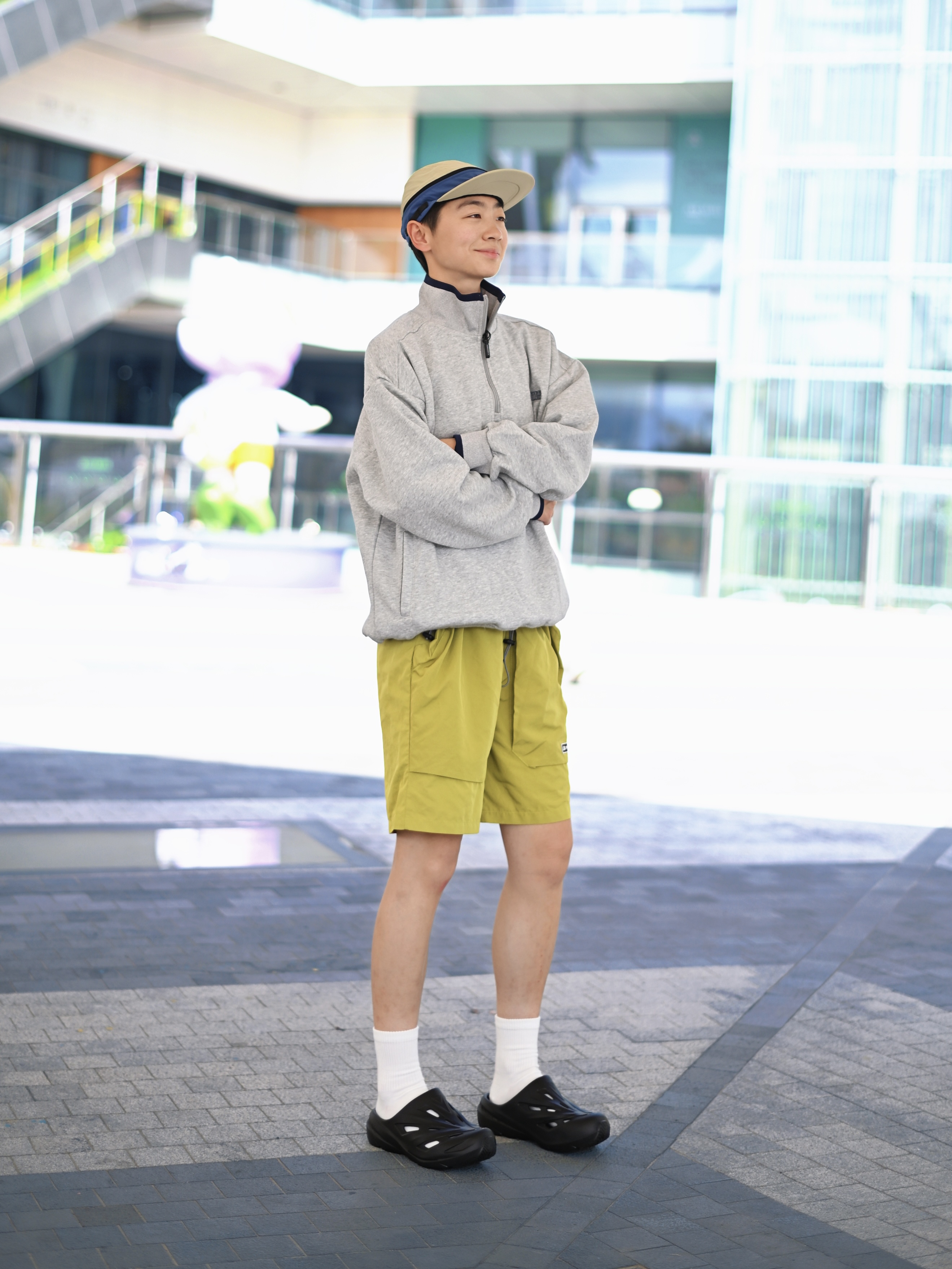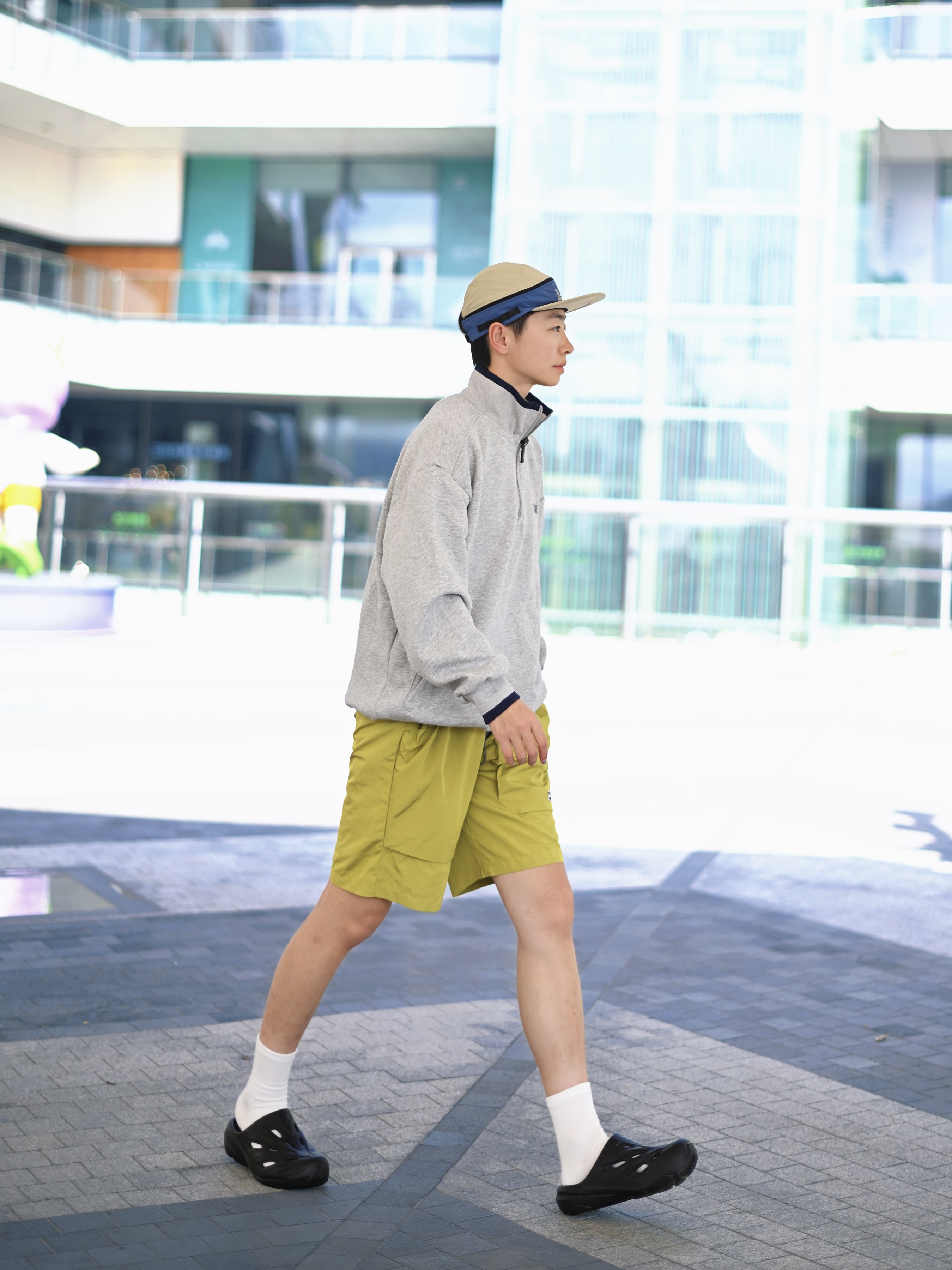 172CM|55KG 👔:m👖:m|👟:39码 滴滴滴,今日份升温穿搭来咯~ 上脚匹克态极经典拖 星舰黑武士 百搭的嘞 机能风设计轻松拿捏街头感 上脚舒适,日常和户外的百搭选择。 上身浅灰色半拉链卫衣 下装配一条黄绿色机能短裤 春夏活力感拉满!