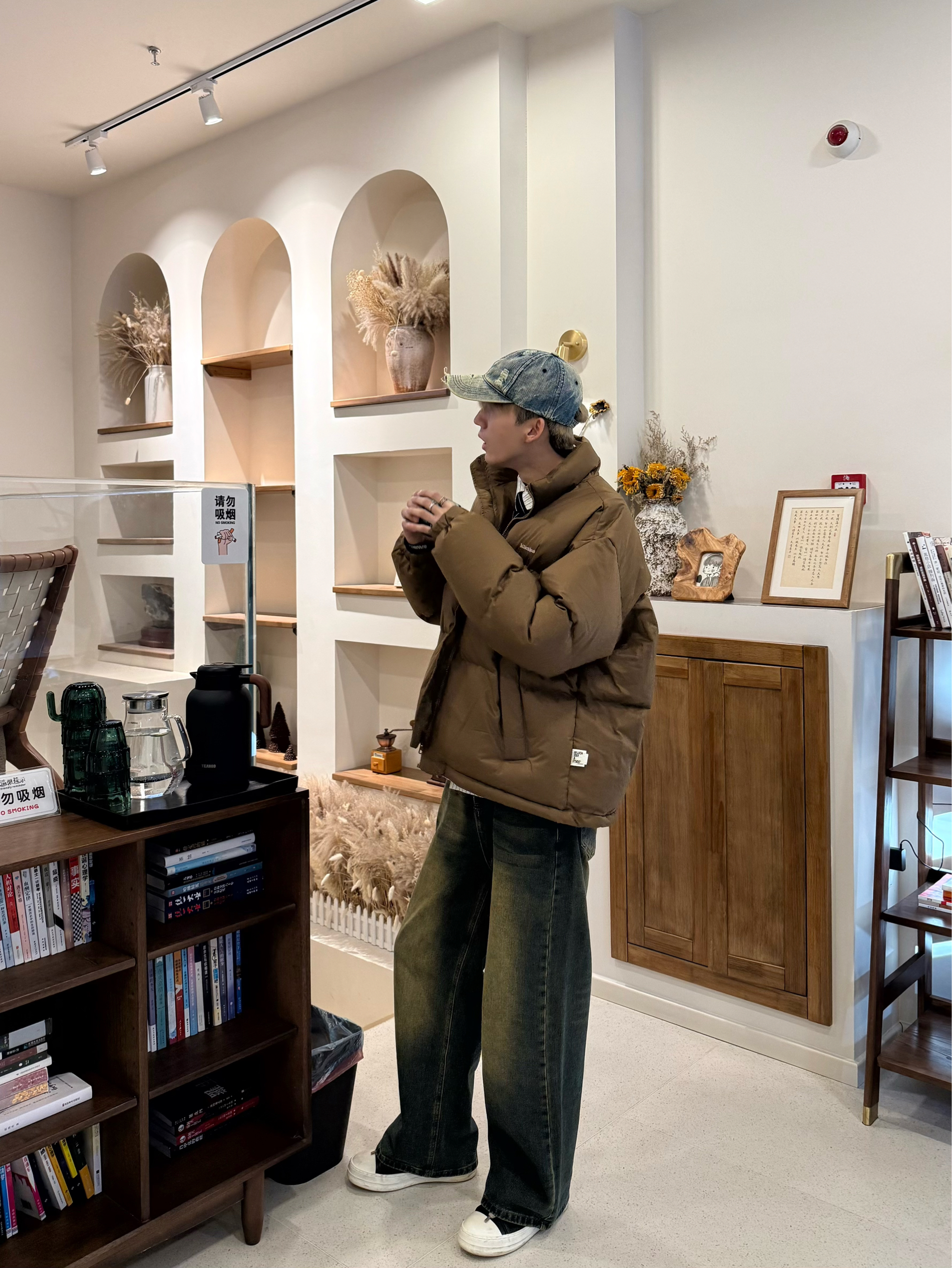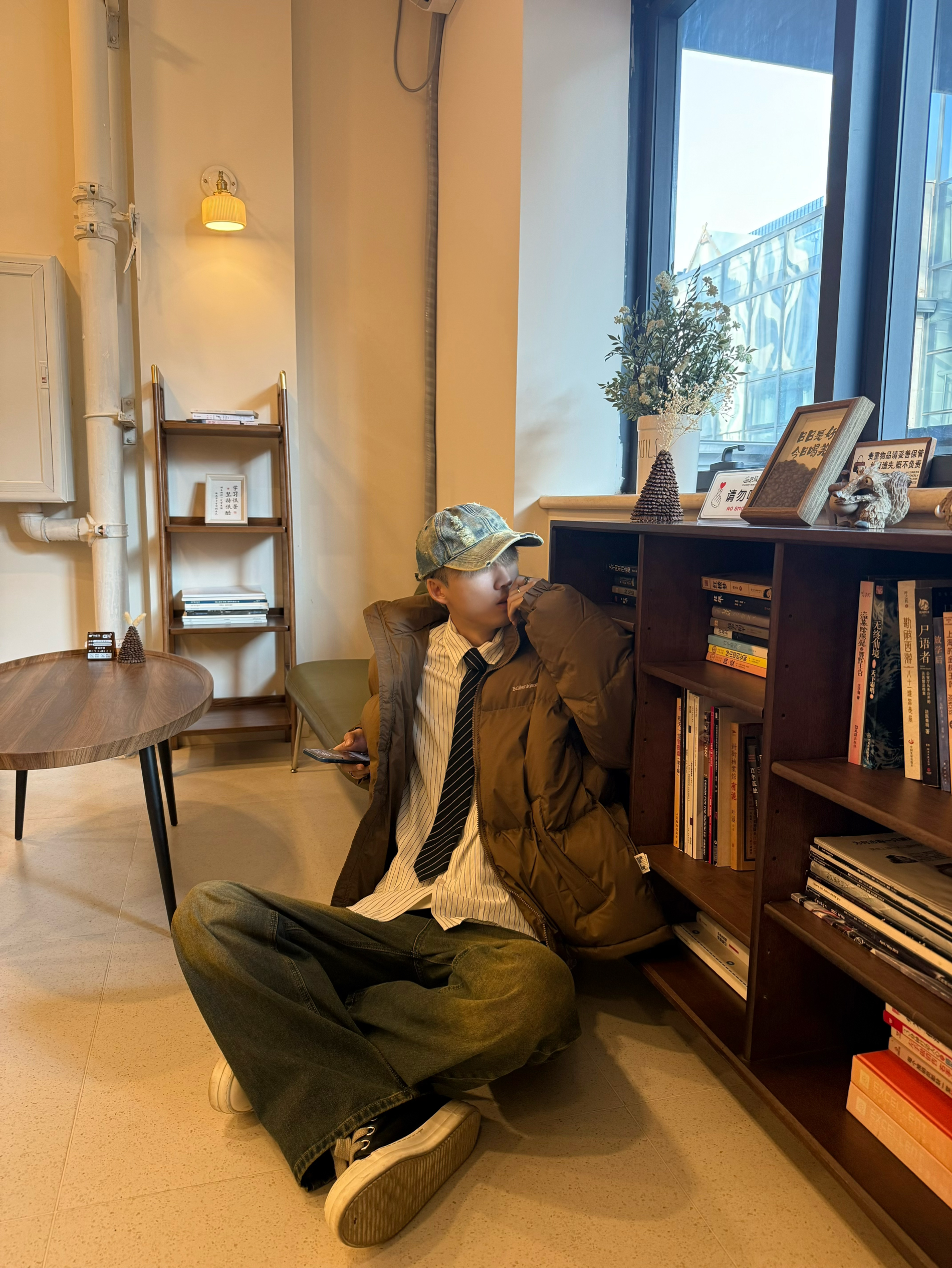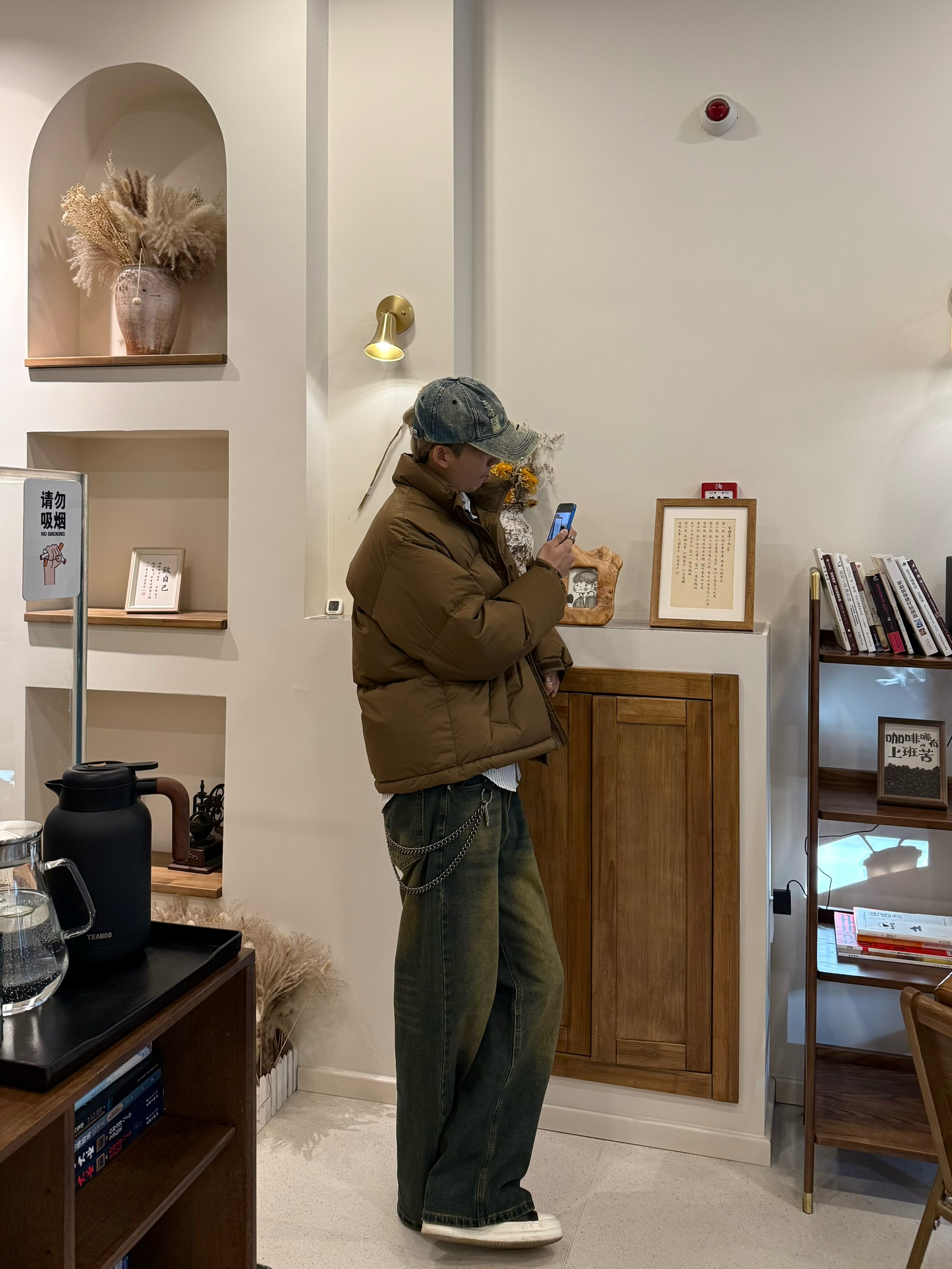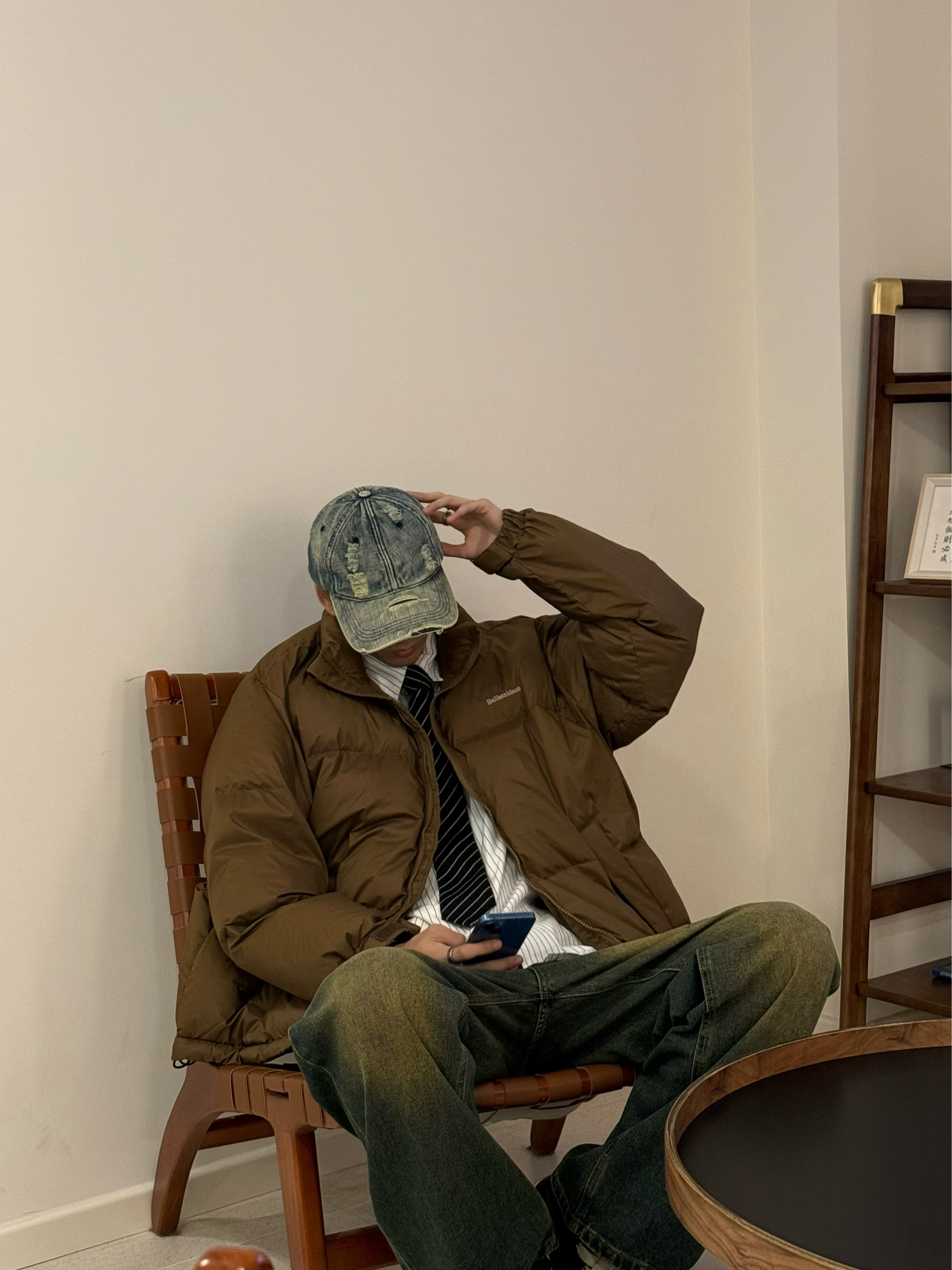上次把数据线落在咖啡店了☕️ 等下还要去一趟 顺便在店里 搞一杯气泡饮吧🍹 今天简单搭了套 冬季“复古校园风” 棕色短款棉服配上黄泥复古牛仔裤 这种轻微做旧风 还蛮耐看的✅ 内搭了件学院风的衬衫 增添一下层次 整体淡淡的美拉德色调 蛮柔和的😎 出门时顺便搞了顶做旧牛仔帽🧢来呼应下身 刚好提升一下复古的韵味↑ 不得不说 这种复古调调的穿搭 还蛮配店里的氛围 松弛又懒散哈哈哈
