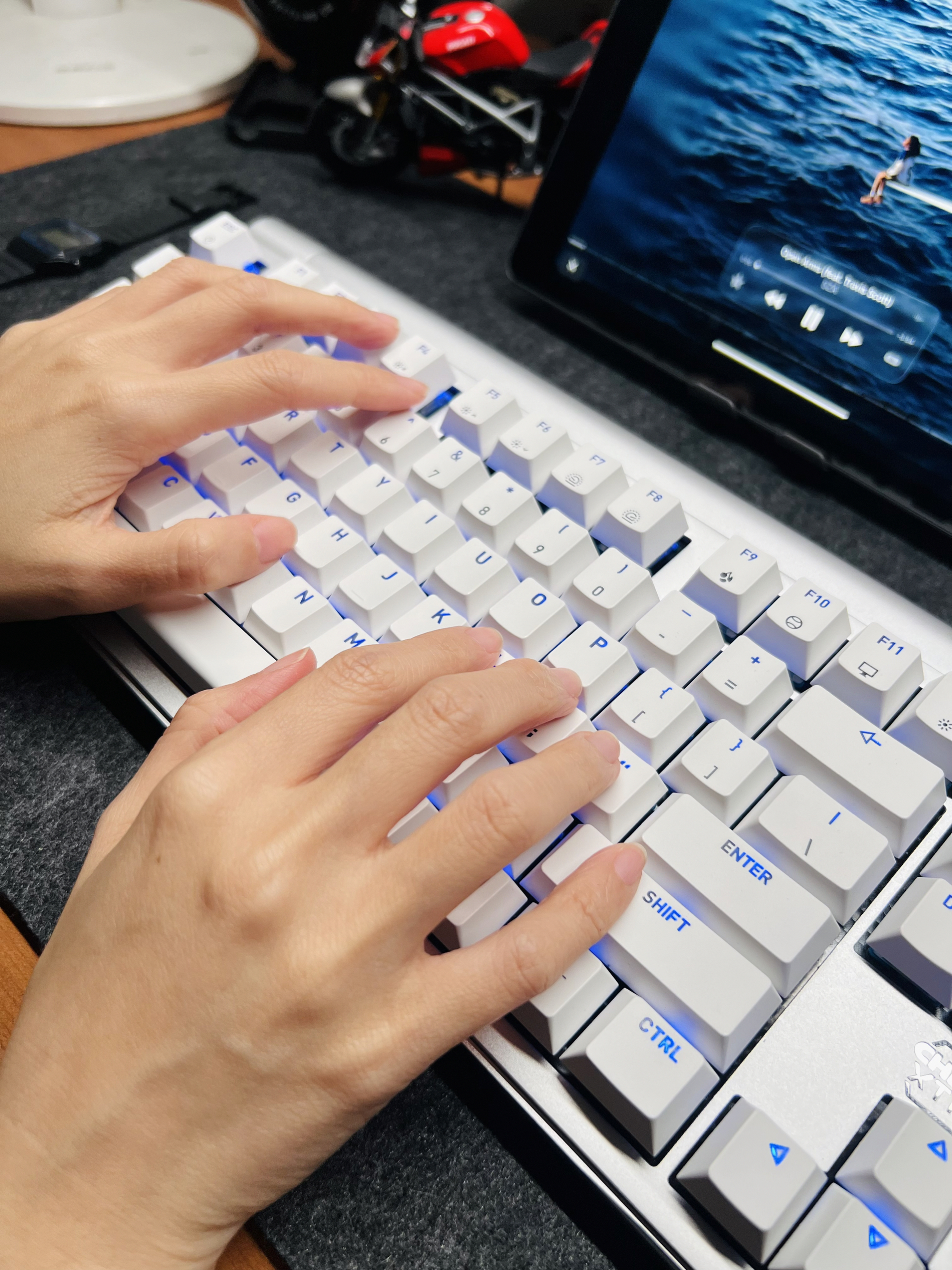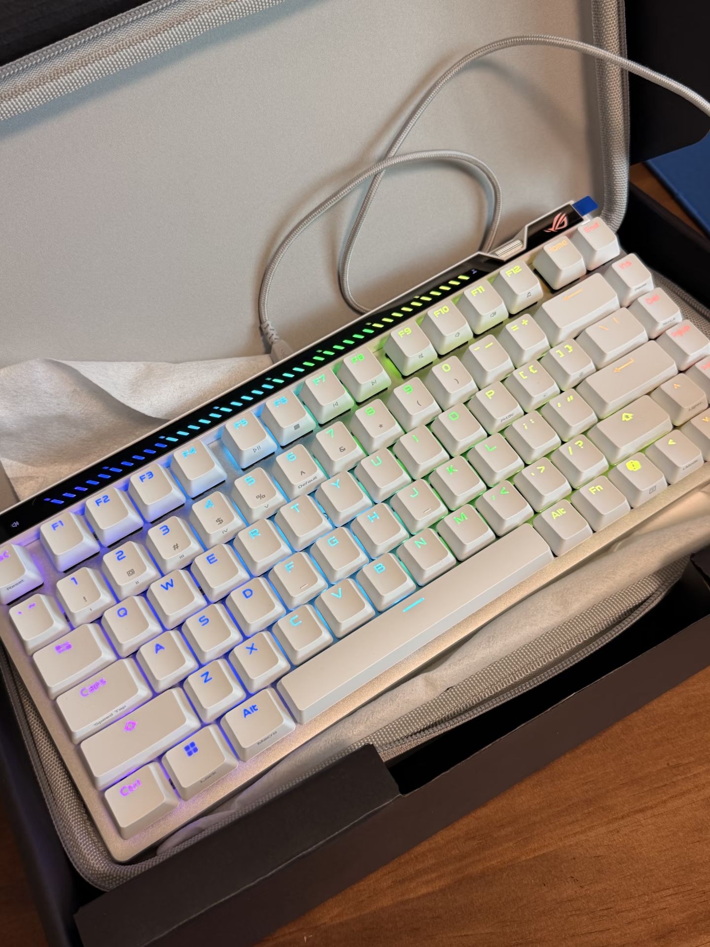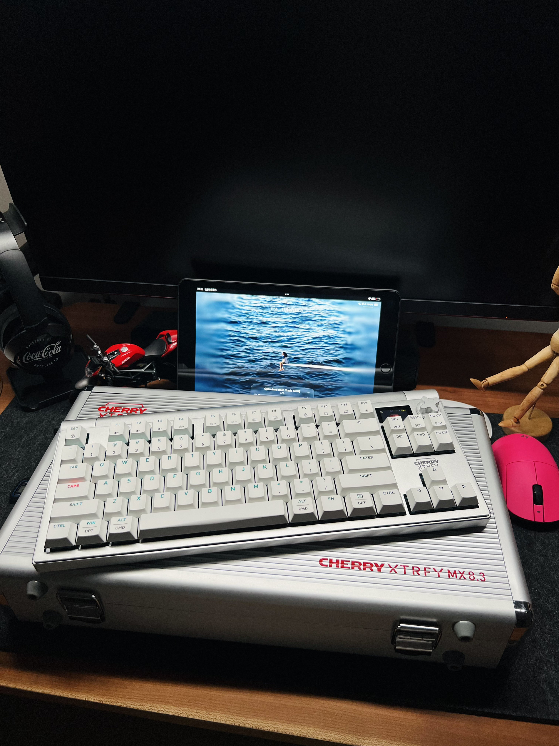 这个铝合金军火箱,真的一眼就戳中我的审美,放在房间也是一件桌搭 铝合金CNC机身加180目阳极氧化表面,摸上去冰凉细腻,边缘弧面处理完全不会割手 作为静音线性轴,极光轴的45cN触发压力比红轴更轻,按压过程像在揉捏一块软糯的年糕——直上直下毫无段落感,但回弹又足够跟手 机身设计延续了MX8.0的风格,双层上盖及悬浮式键帽 右上角屏幕跟旋钮可以用来设置大部分功能,金属旋钮单指转动阻尼感高级,听歌时调...