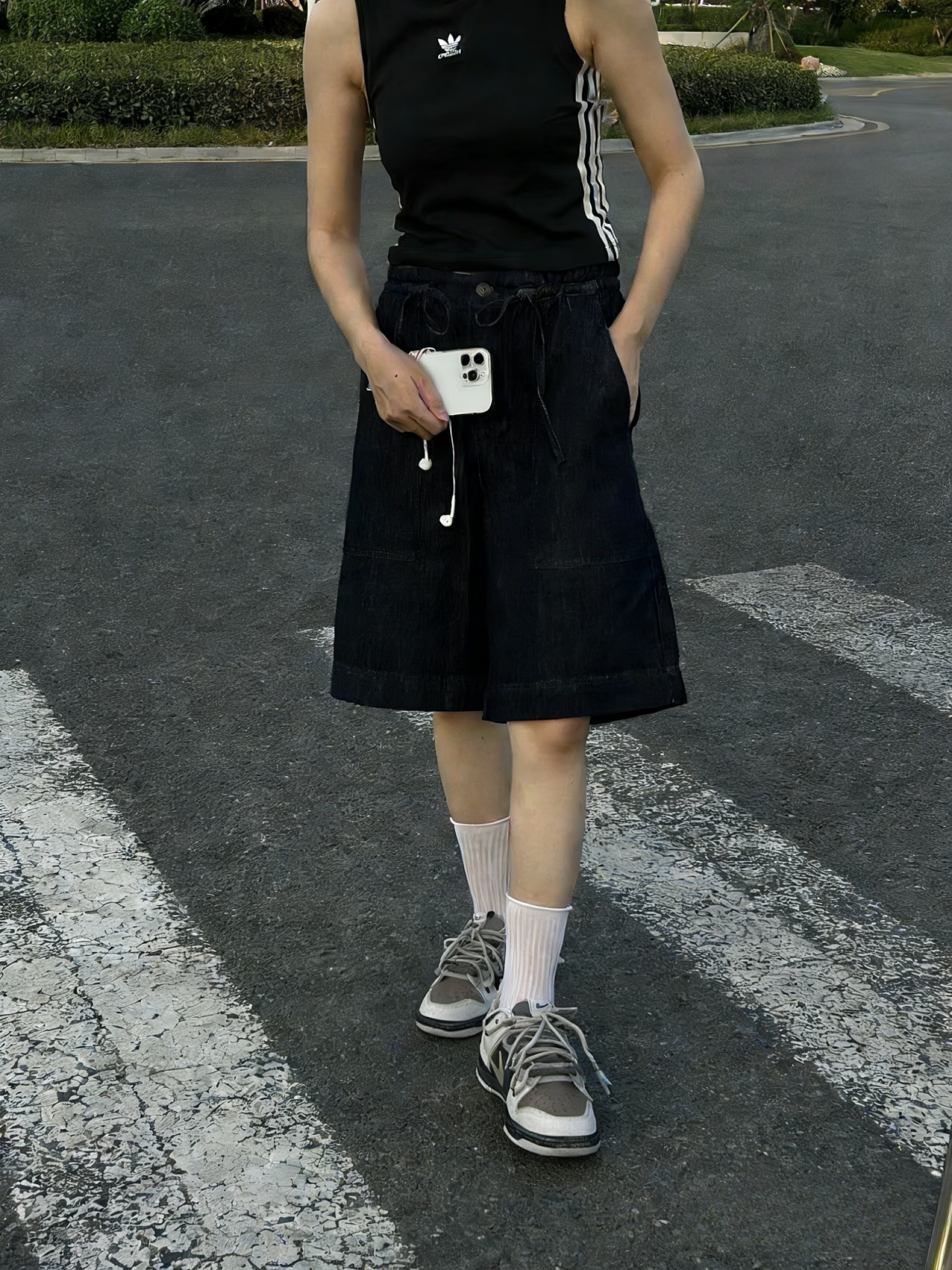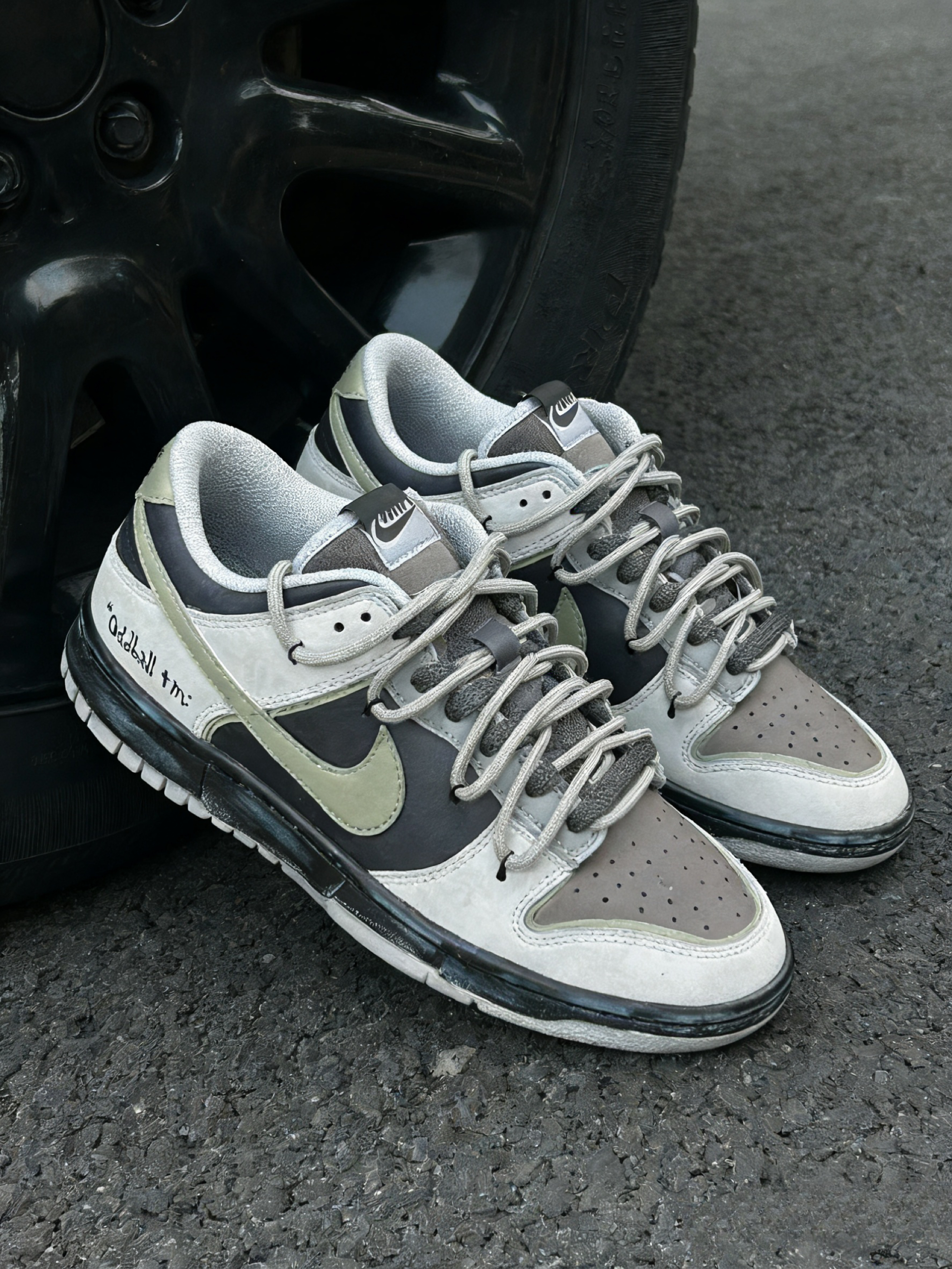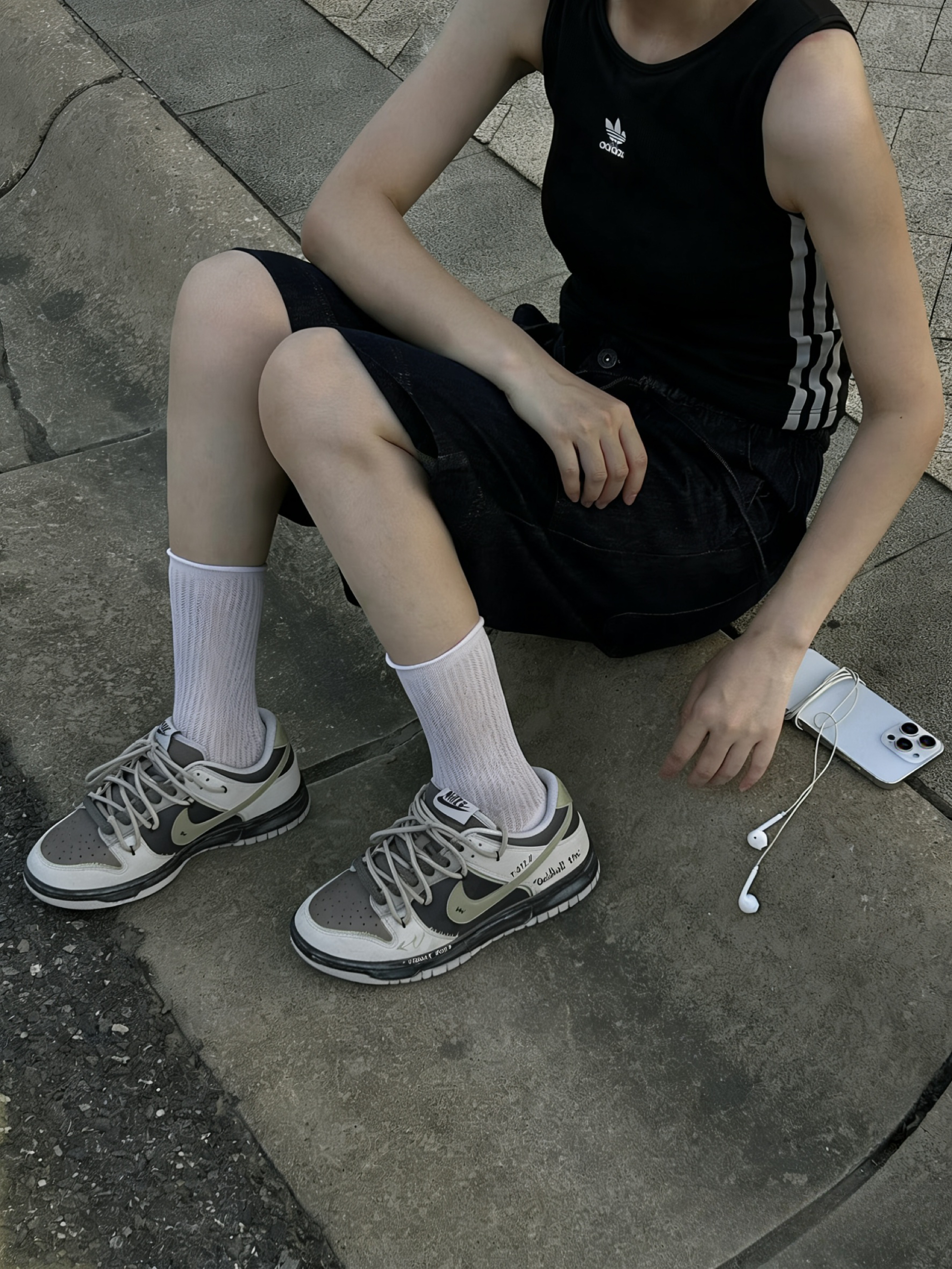终于蹲到一双不挑人的复古球鞋! 做旧工艺真的戳中我,灰绿拼色自带岁月感,完全不用心疼氧化变旧。 脚感比普通Dunk软太多,全掌气垫踩开后通勤暴走无压力👟 搭配黑色背心+牛仔中裤,经典黑白配,鞋子就是全身的视觉重心。 这种低饱和的大地色系,春夏配短裤,秋冬配工装裤都能打,属于闭眼入的万能款。