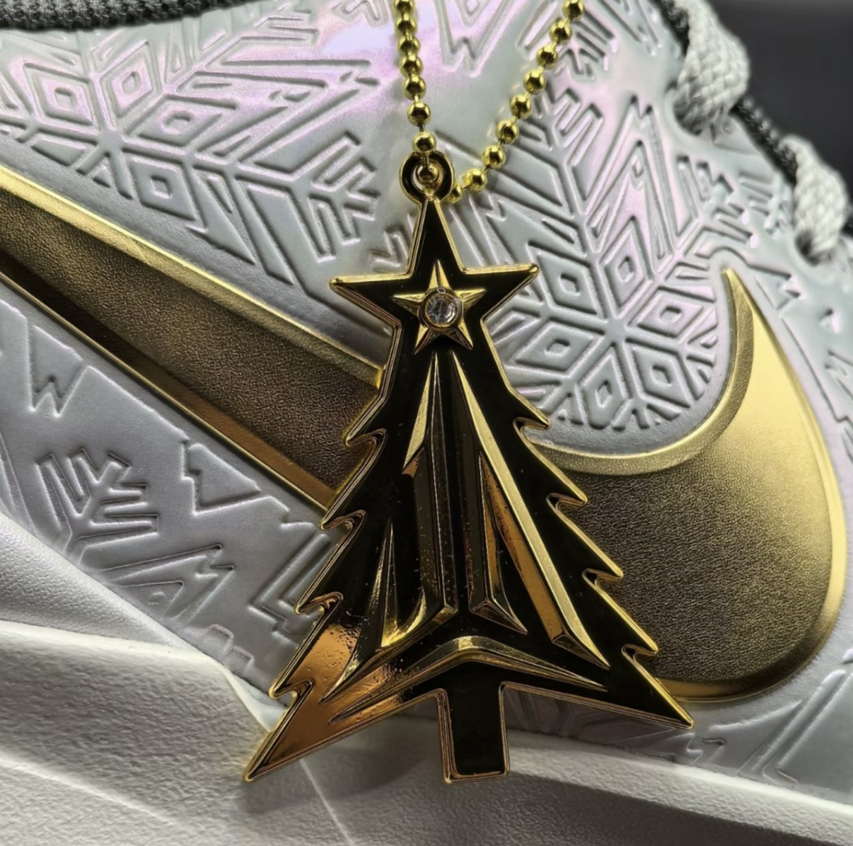 浅灰色鞋身的纹理肌理很有层次,金色勾形装饰提亮了整体,鞋面的镭射纹理在光下还会变彩,鞋底的透明部分还撒了金粉,太会设计了吧😯