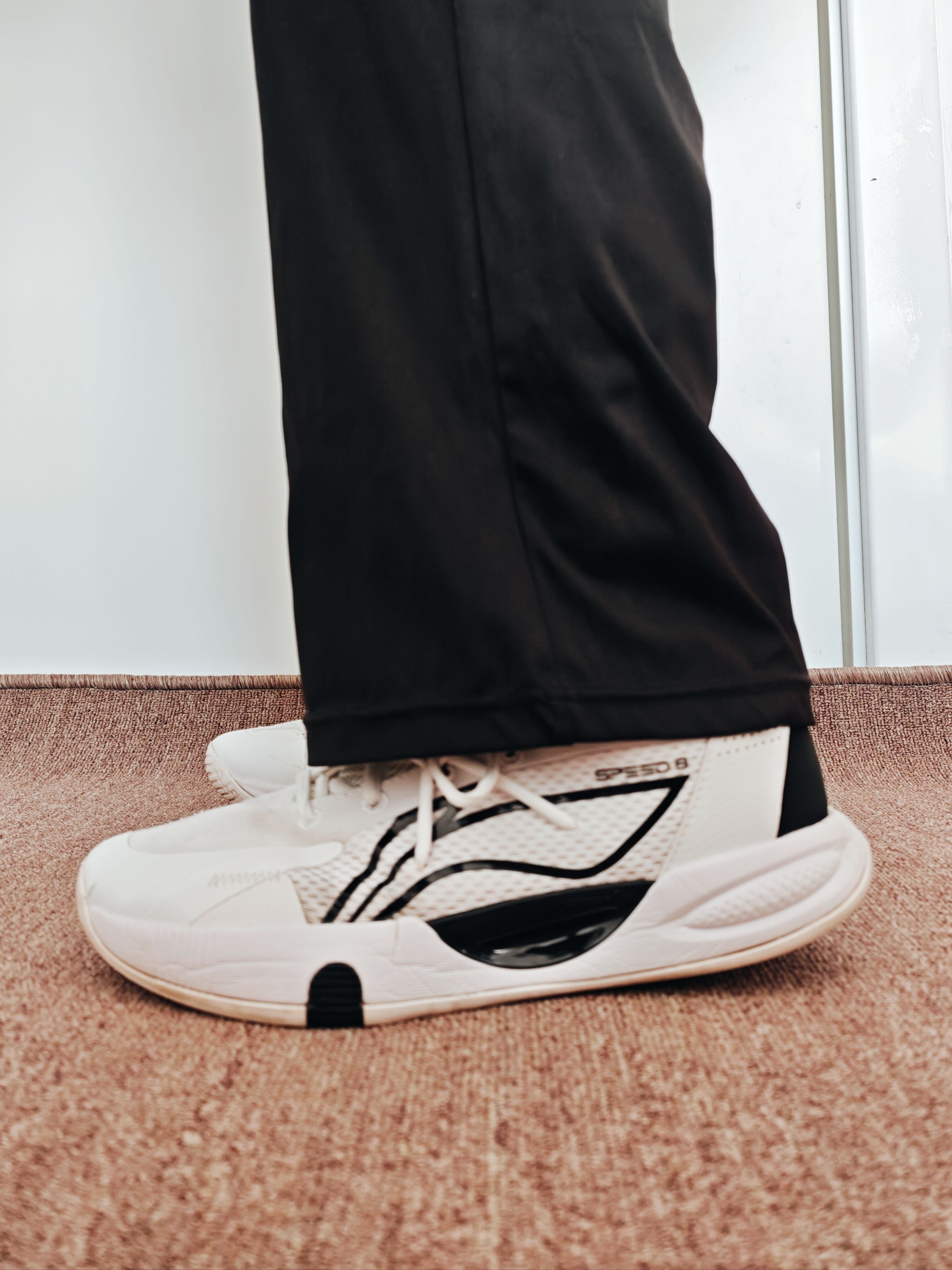 闪击8TD上脚舒适度很在线,网面鞋面透气不闷脚,夏天打球也不会捂脚。鞋带系紧后包裹感很足,脚踝活动灵活不卡脚。中底LightFoam搭配后跟䨻科技,缓震够用,日常起跳落地不震脚,前掌贴地感明显,突破启动响应快。中足TPU支撑稳定,变向、急停不拖沓,外底纹路深,室内外场抓地都靠谱。低帮版型利落,搭运动卫裤、短裤都很协调,球场实战、日常出门都能穿,学生党、后卫打法的朋友可以直接冲