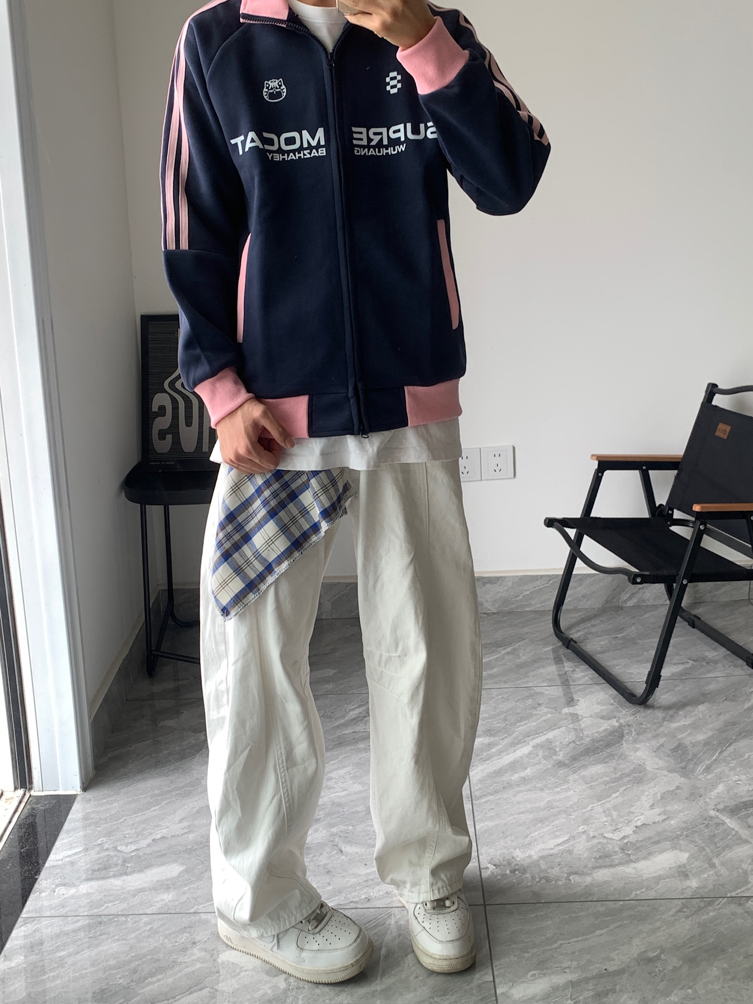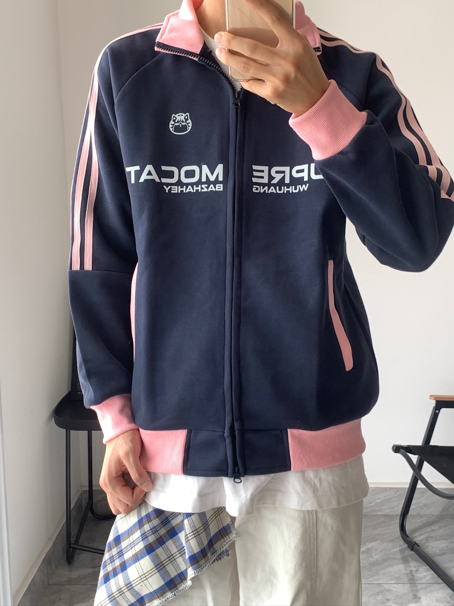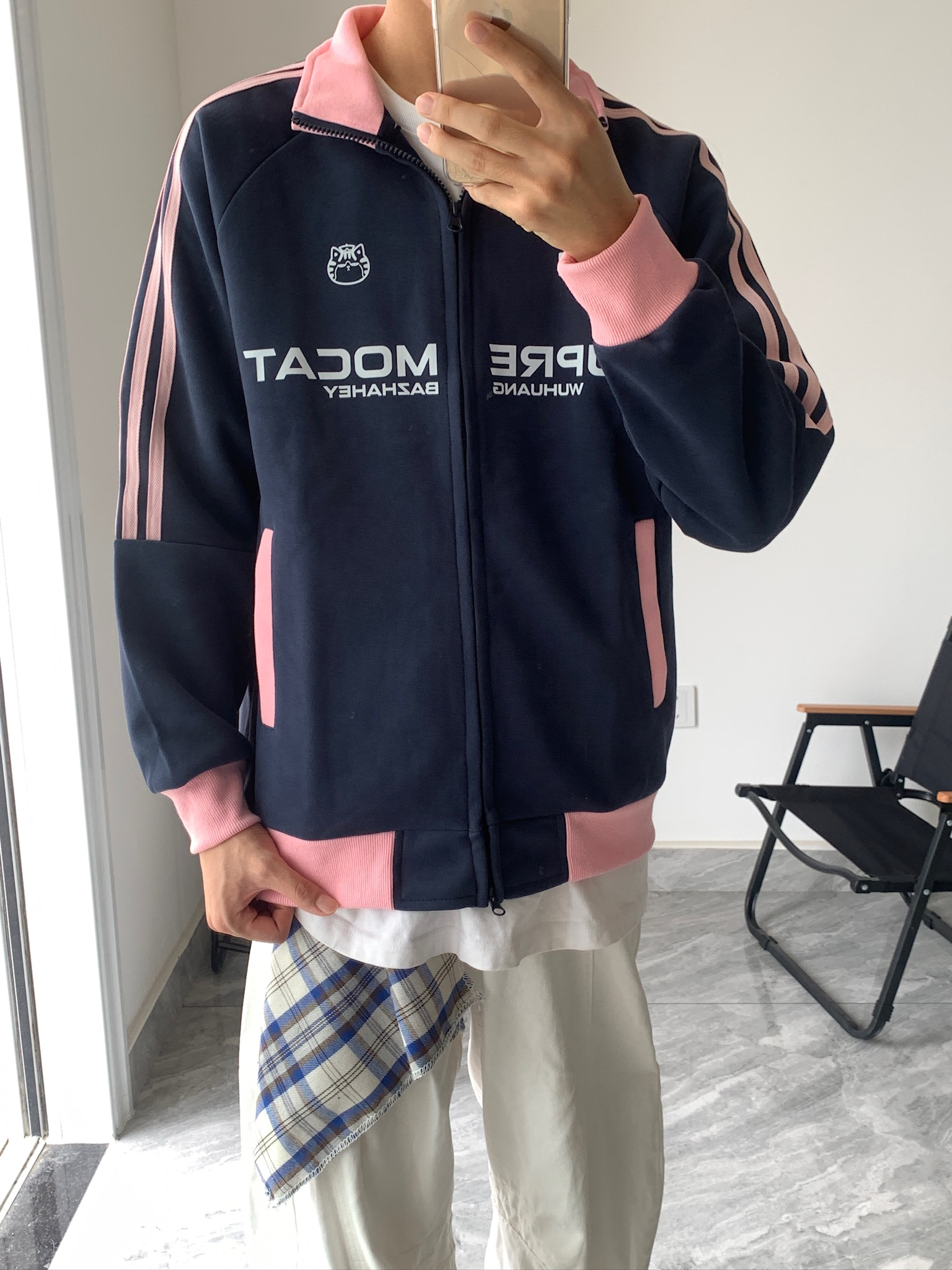 这件藏青+粉边的运动外套,我真的爱了💖 摸起来软软的,春天穿不冷不热刚刚好。里面搭个白T,下面配条白裤子,随便一套就很干净。上次和朋友去咖啡店,还被问了链接,说我穿得像韩剧里的学长,哈哈~
