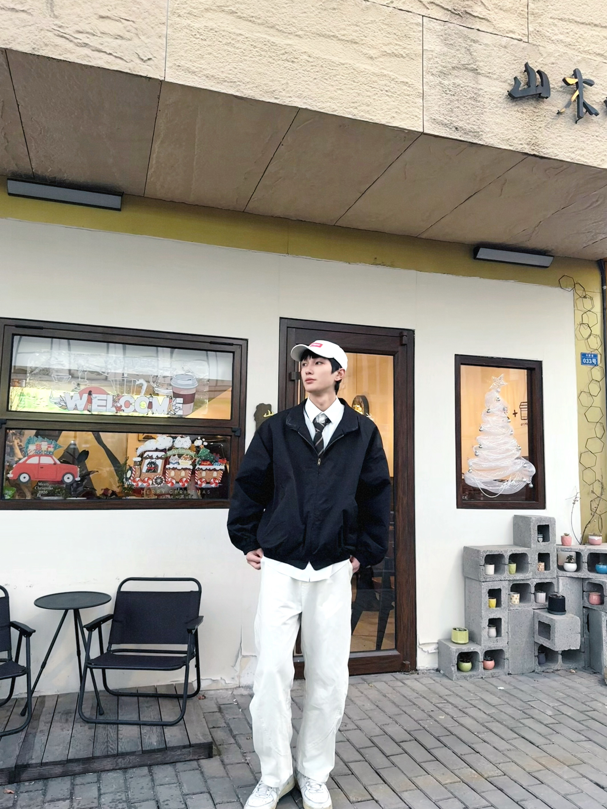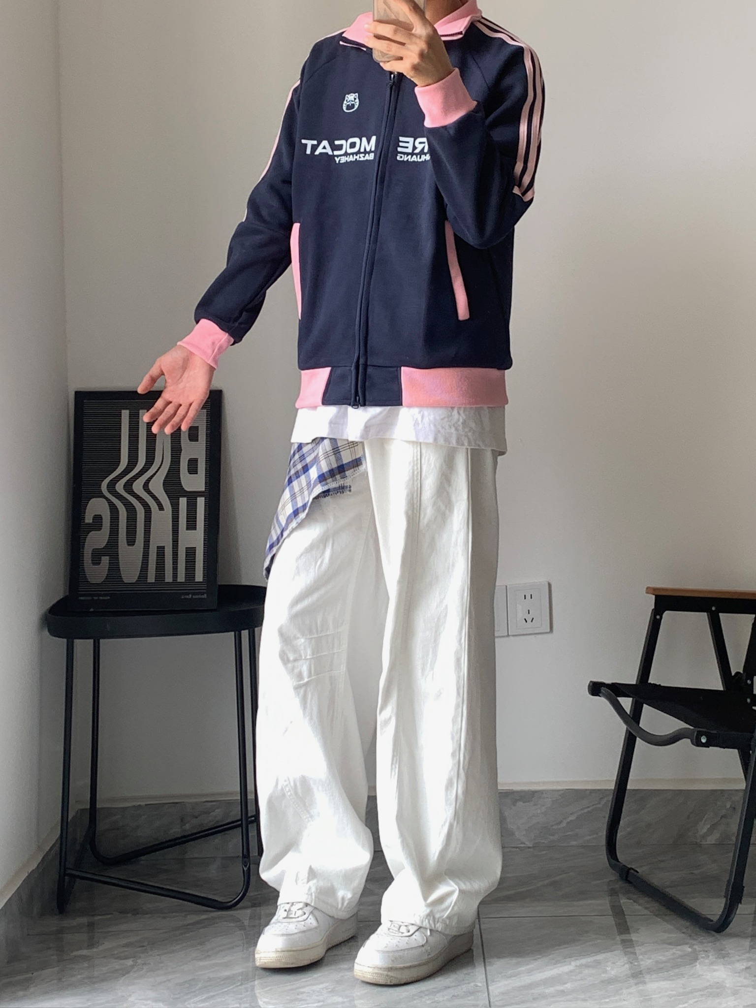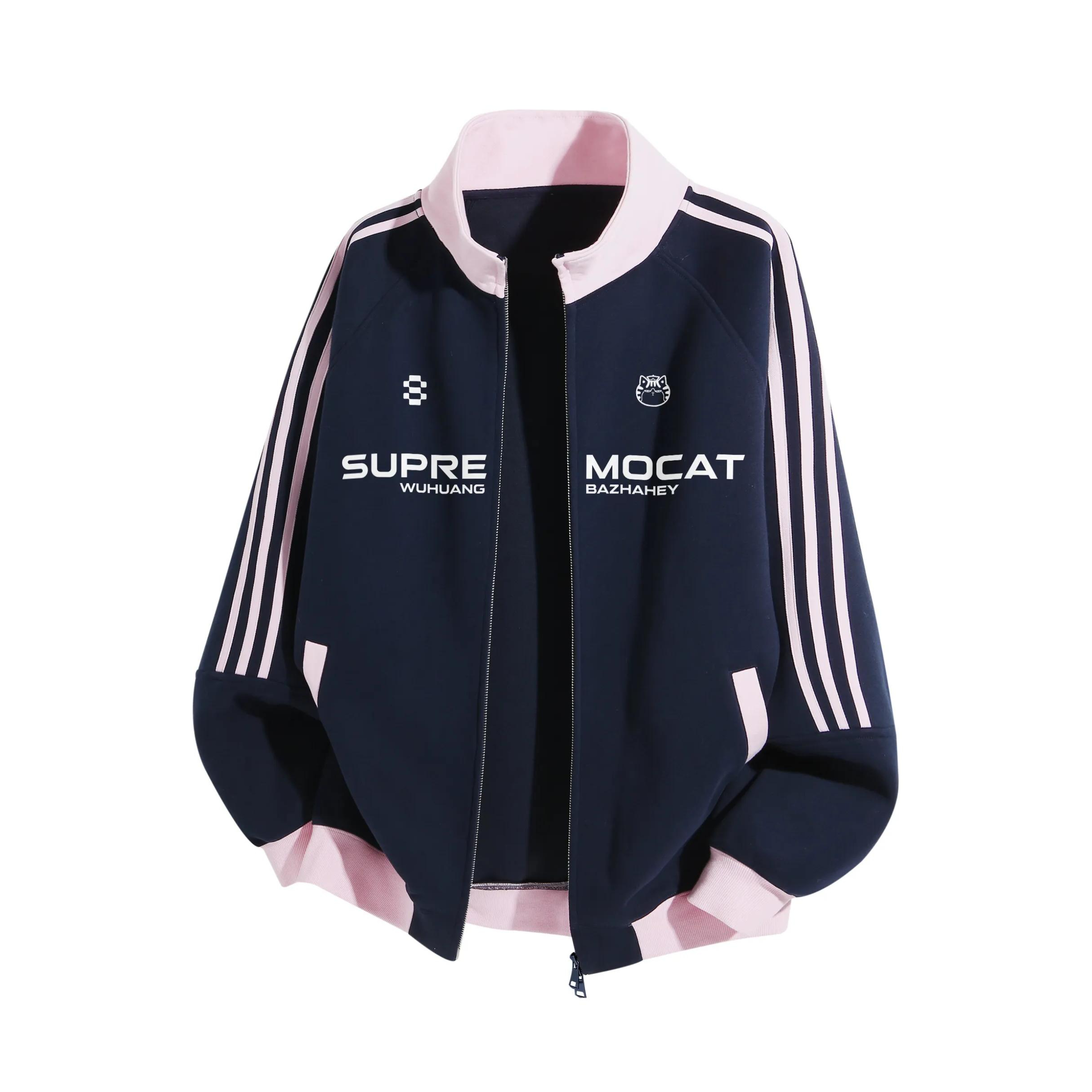 这件藏青+粉边的运动外套,我真的爱了💖 摸起来软软的,春天穿不冷不热刚刚好。里面搭个白T,下面配条白裤子,随便一套就很干净。上次和朋友去咖啡店,还被问了链接,说我穿得像韩剧里的学长,哈哈~