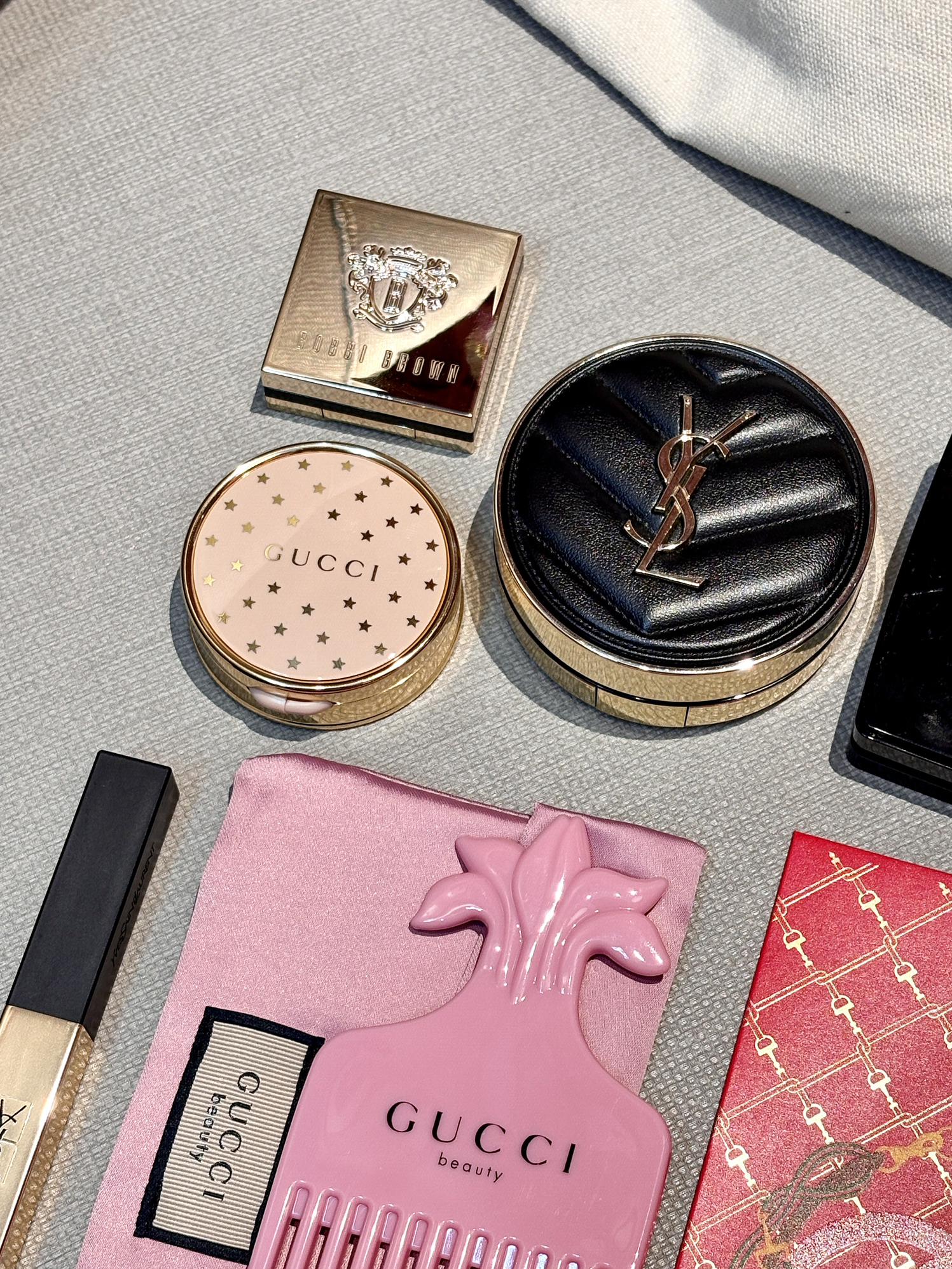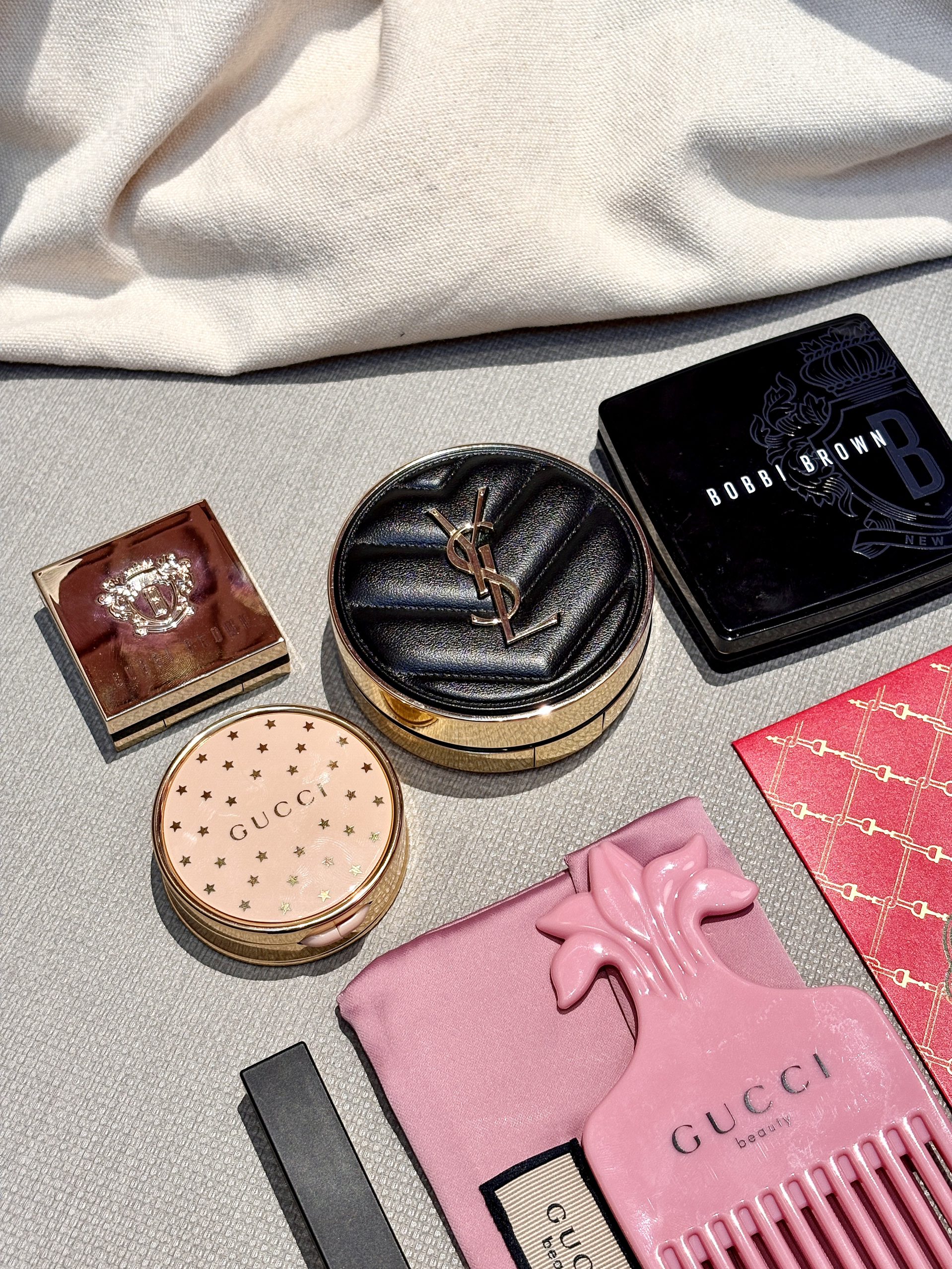 今年过年回家化妆包大公开 主打一个精简又显贵~ 挑了几样我常用的化妆品 底妆是用的YSL气垫 干皮姐妹冬日出门也扒得牢 补妆方便还不卡粉 搭配小金条一整个好气色 还有gucci粉嫩嫩的01腮红 甜美氛围感全都靠它啦 精简的一套搞定全脸自然 回家过年主打一个轻松美喽