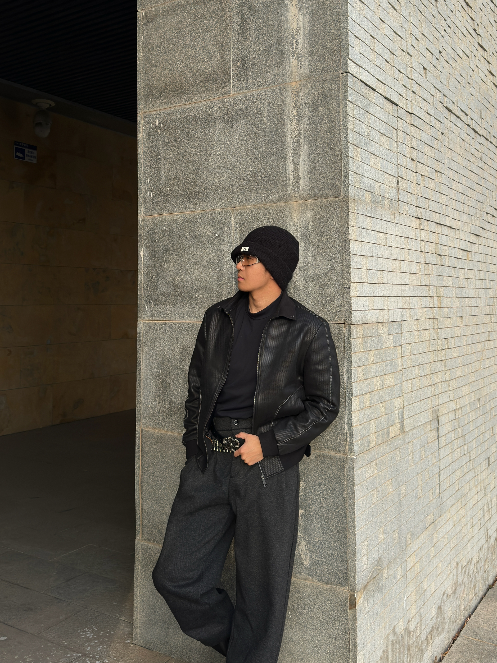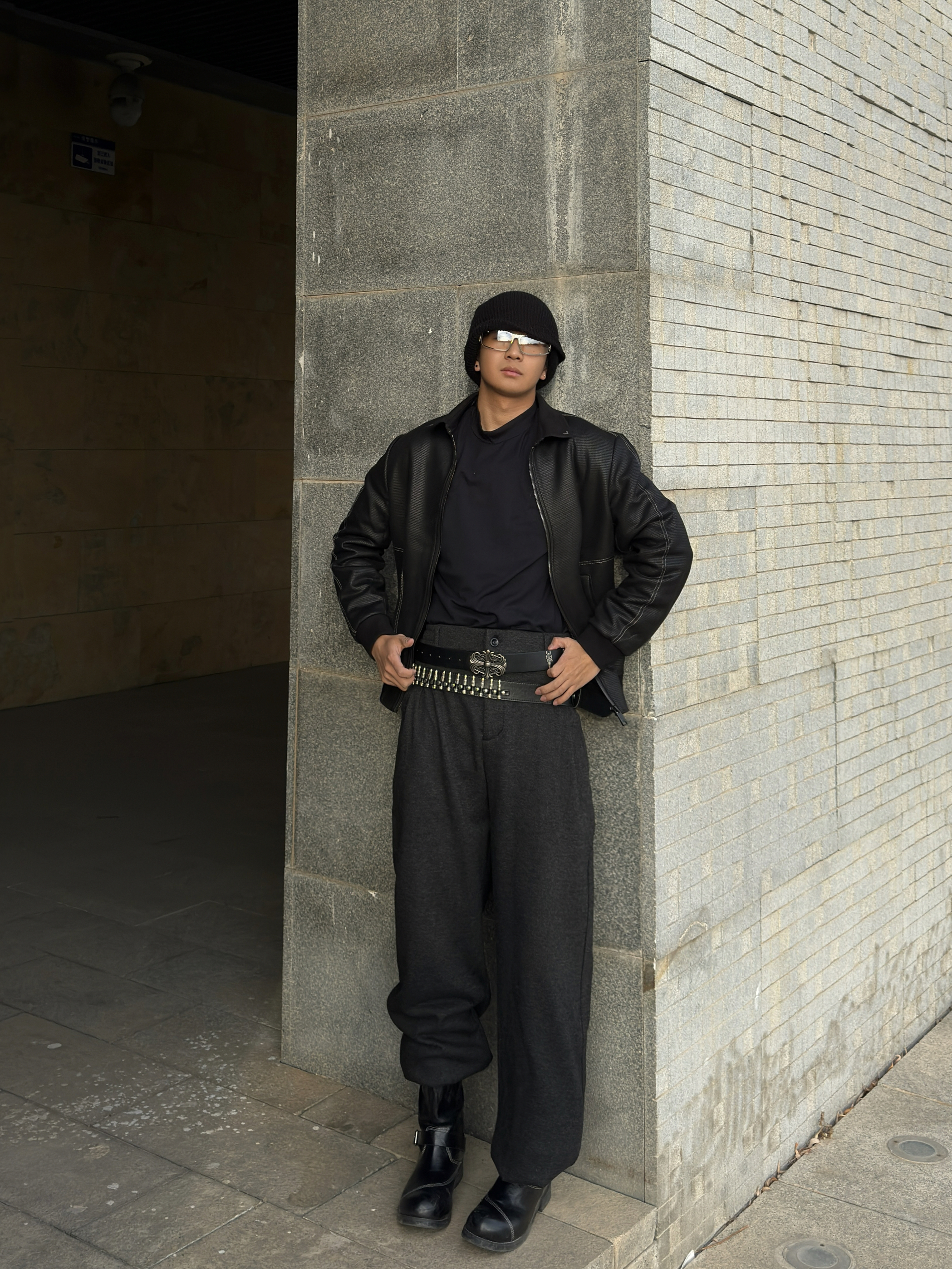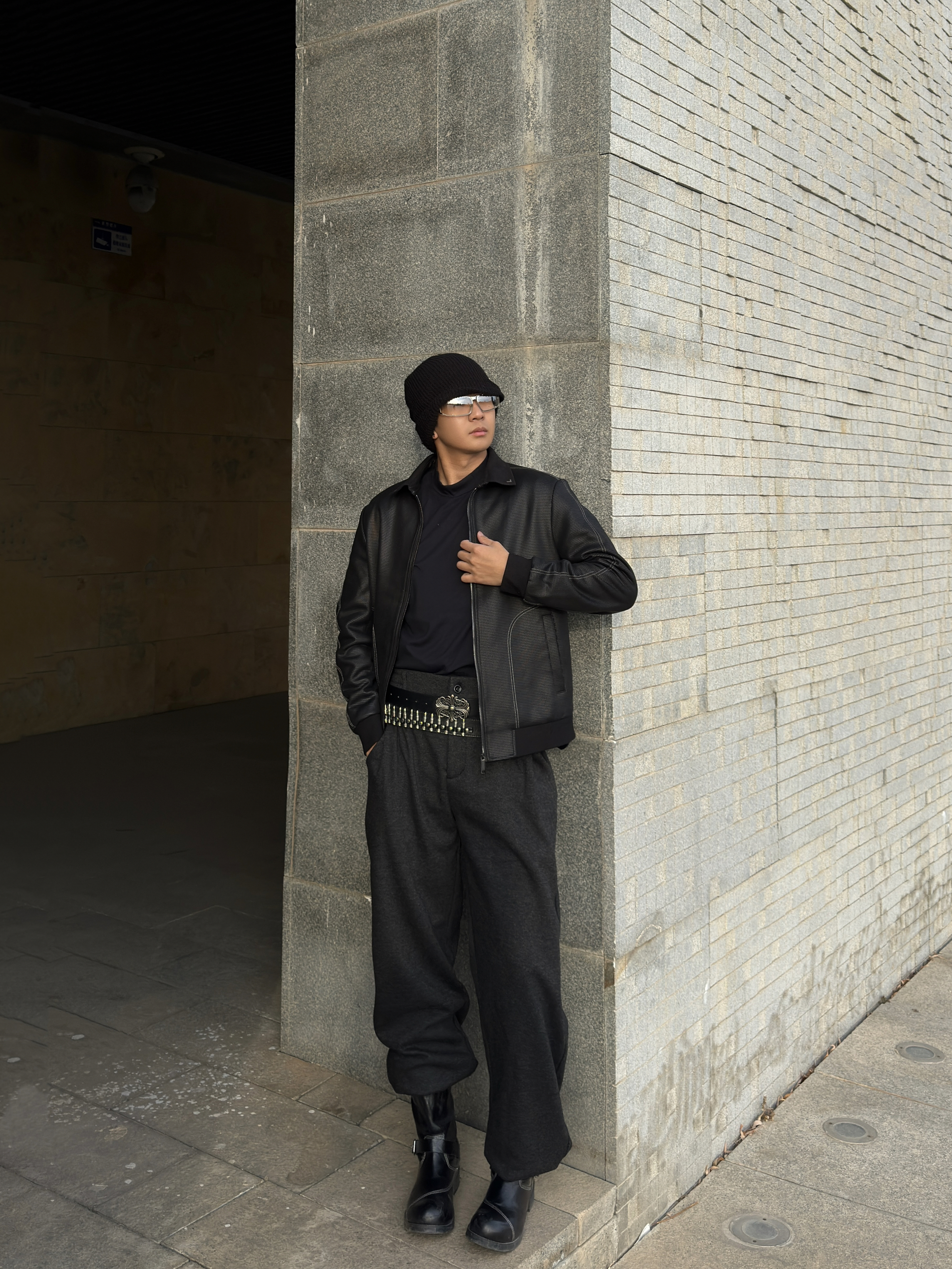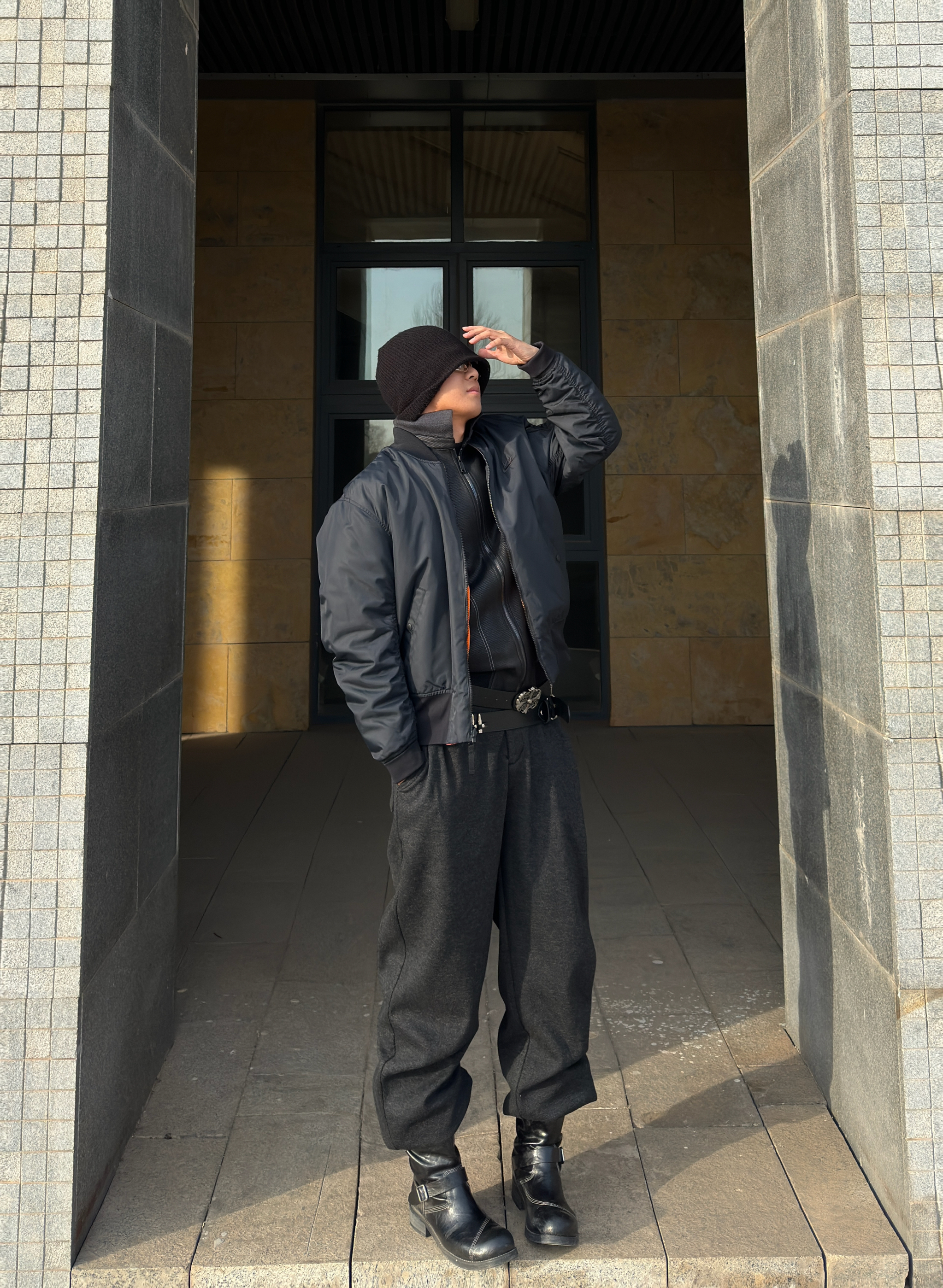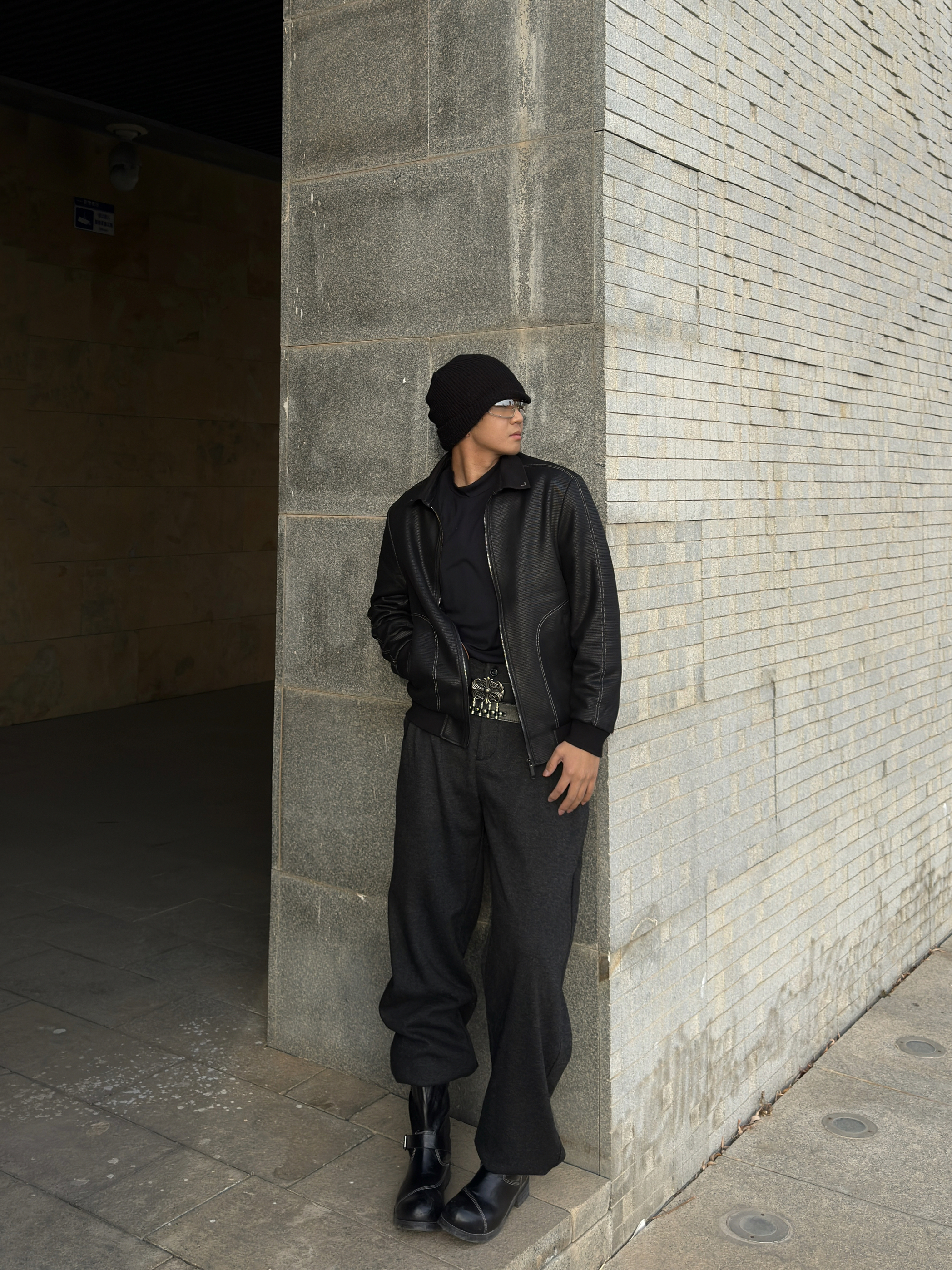 黑针织冷帽+飞行员夹克,内搭皮质感打底,层次感直接拉满 金属铆钉腰带+宽松束脚西裤,把比例和气场都拿捏住 厚底马丁靴踩出利落线条,冷天也能又酷又有型 阳光斜切的瞬间,黑调穿搭自带电影感滤镜