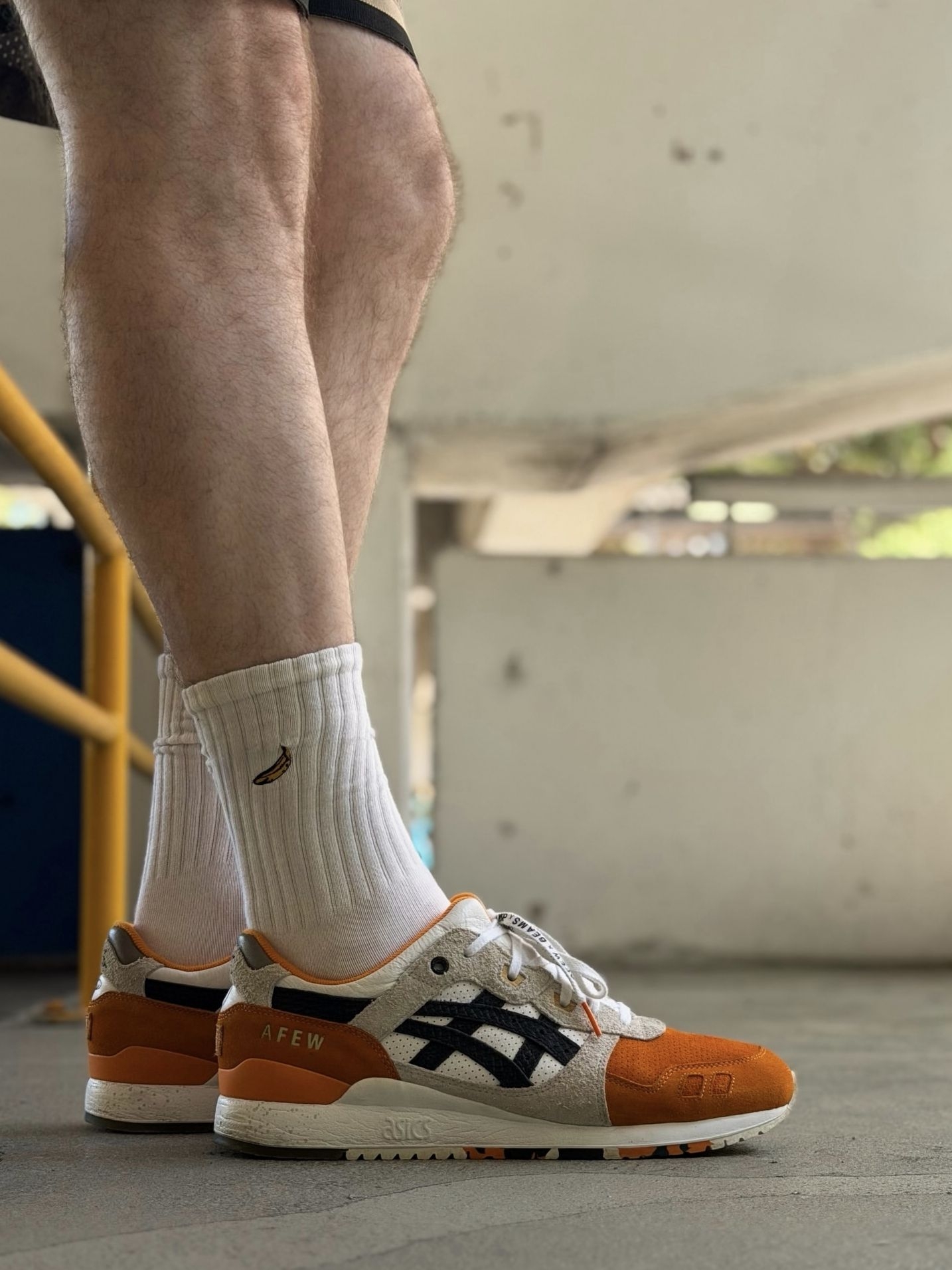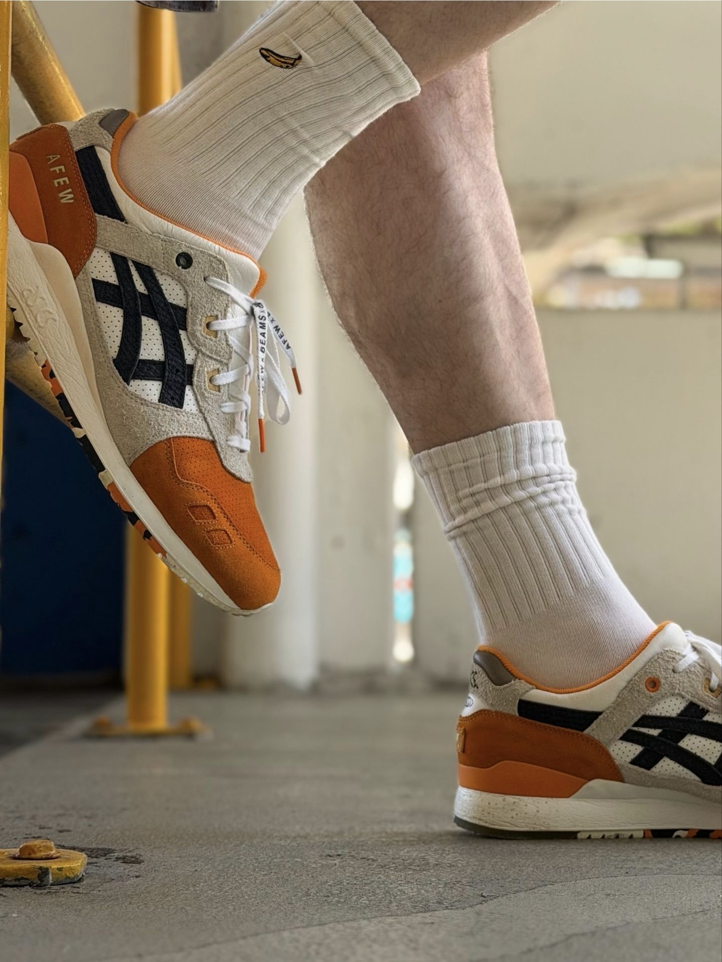 我越看越爱,这双beams x AFEW x Asics Gel-Lyte 3的白橙配色太戳我了。翻毛皮和网眼拼接的质感很细腻,橙色点缀复古又亮眼,配白长袜拍照特别出片。Gel缓震脚感软弹,日常通勤走一天也不累,鞋型利落不臃肿,搭工装裤和牛仔裤都很和谐。唯一要注意的是翻毛皮容易沾灰,但为了这颜值,我愿意多花点心思打理。