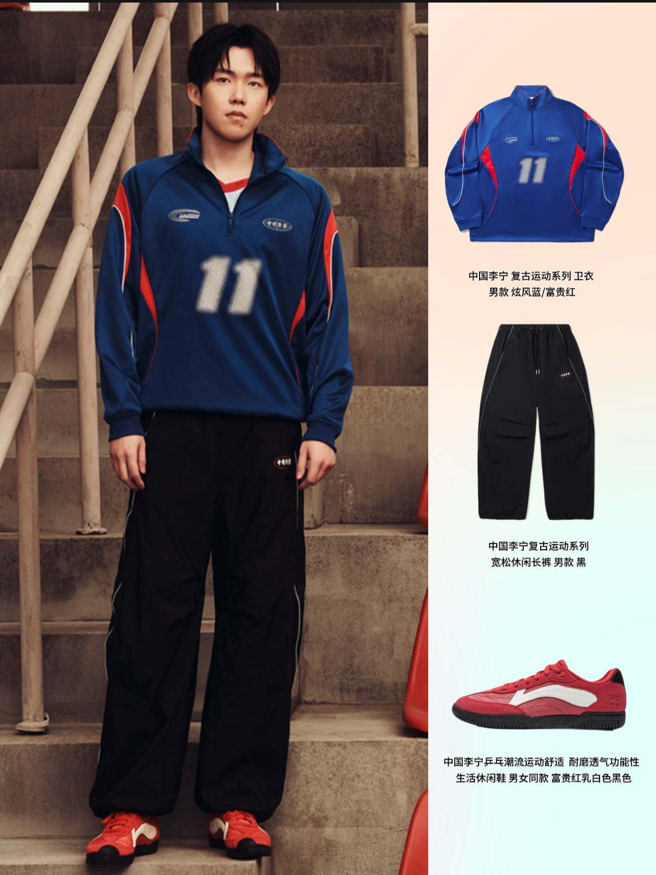 本篇笔记关联了Li Ning/李宁 复古运动系列套头插肩印花立领长袖卫衣 AWDVN41 蓝、【王楚钦同款】 李宁 乒乓 运动休闲鞋 情侣低帮系带薄底德训鞋 富贵红/乳白色/黑色、Li Ning/李宁 复古运动系列中腰直筒松紧腰休闲长裤 AYKVB83 黑等商品,为用户提供真实的使用体验和购买参考。