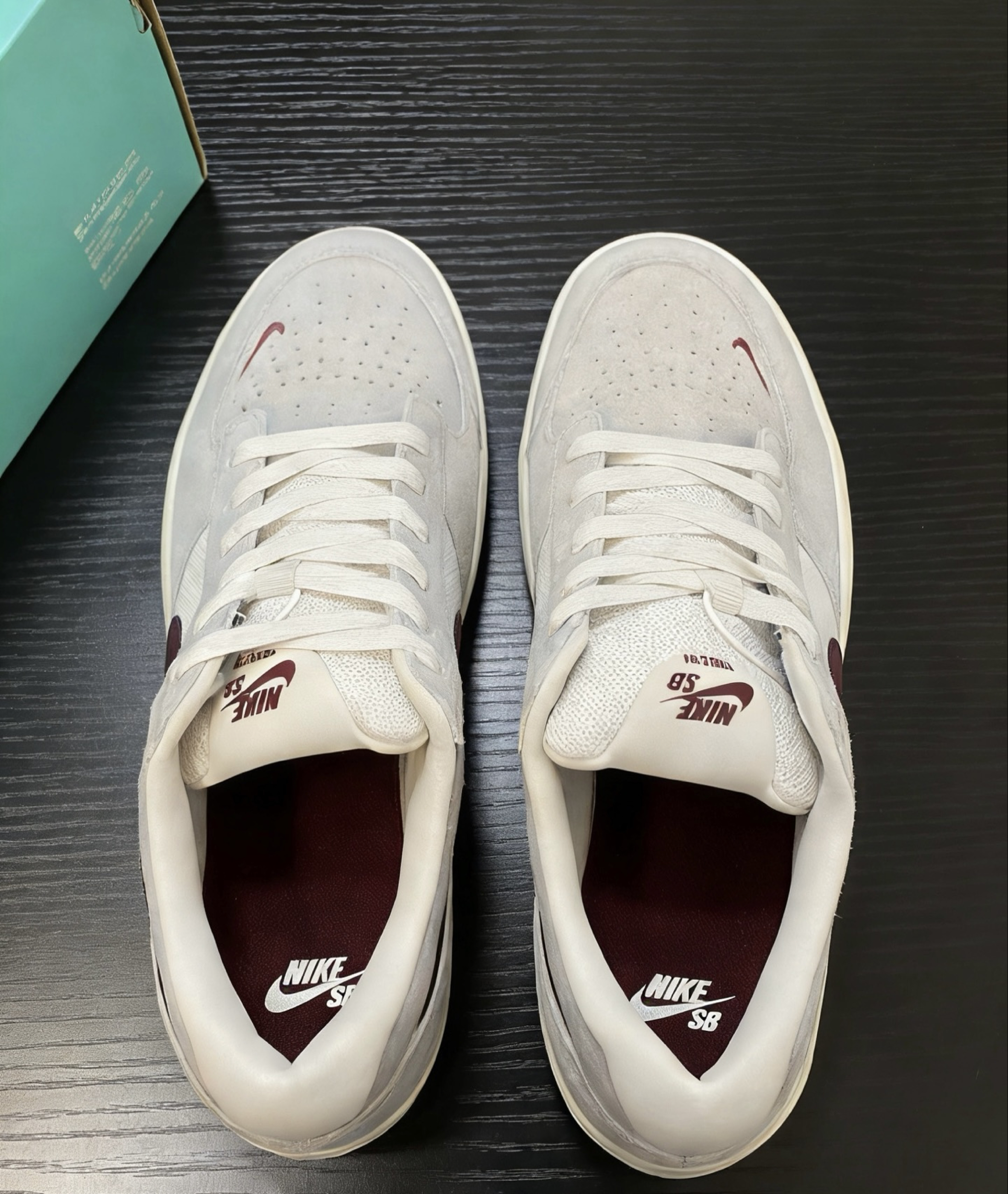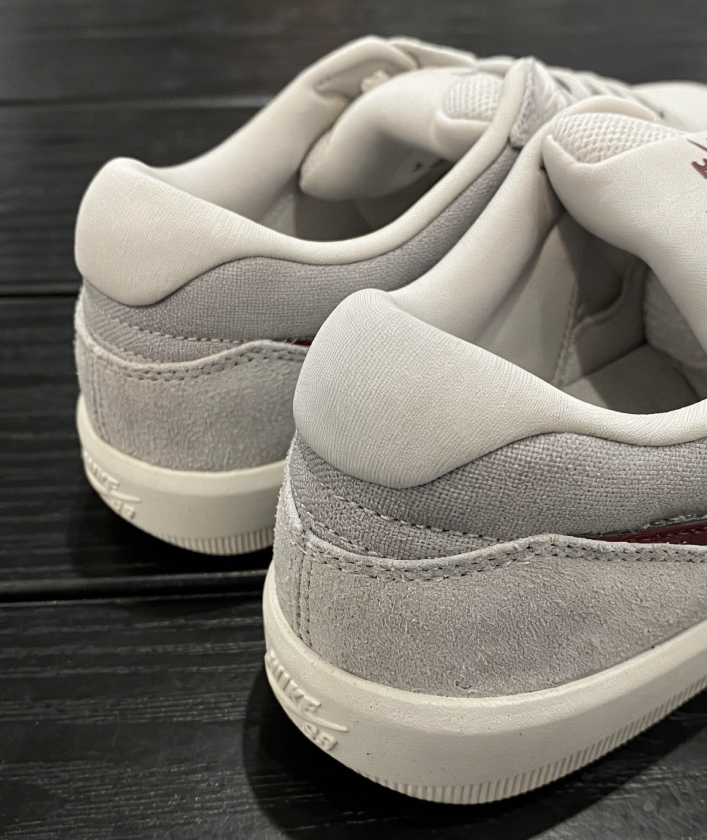 • 经典滑板鞋型:Nike SB Force 58 复古鞋型,翻毛皮与帆布拼接,兼顾滑板性能与潮流颜值。 • 灰白+酒红撞色:浅灰翻毛皮+米白帆布+酒红Swoosh,层次分明,温柔又高级,是开春穿搭的“万能滑板鞋”。 • 舒适脚感:搭载Zoom Air缓震科技,兼顾滑板落地缓冲与日常脚感,久穿不累。 • 百搭属性:无论是搭配牛仔裤、工装裤还是运动裤,都能轻松驾驭,男女通吃,滑板日常双在线。