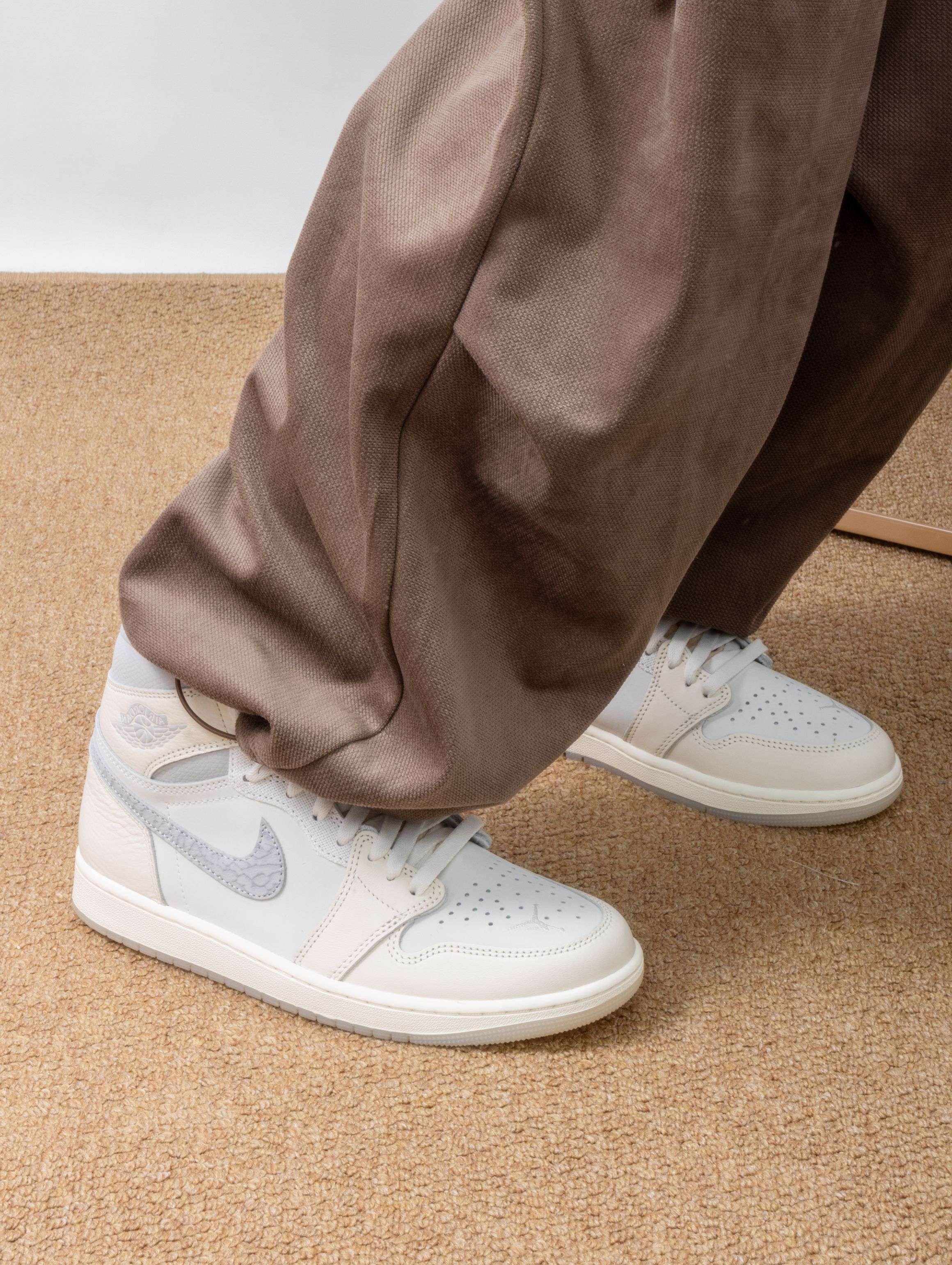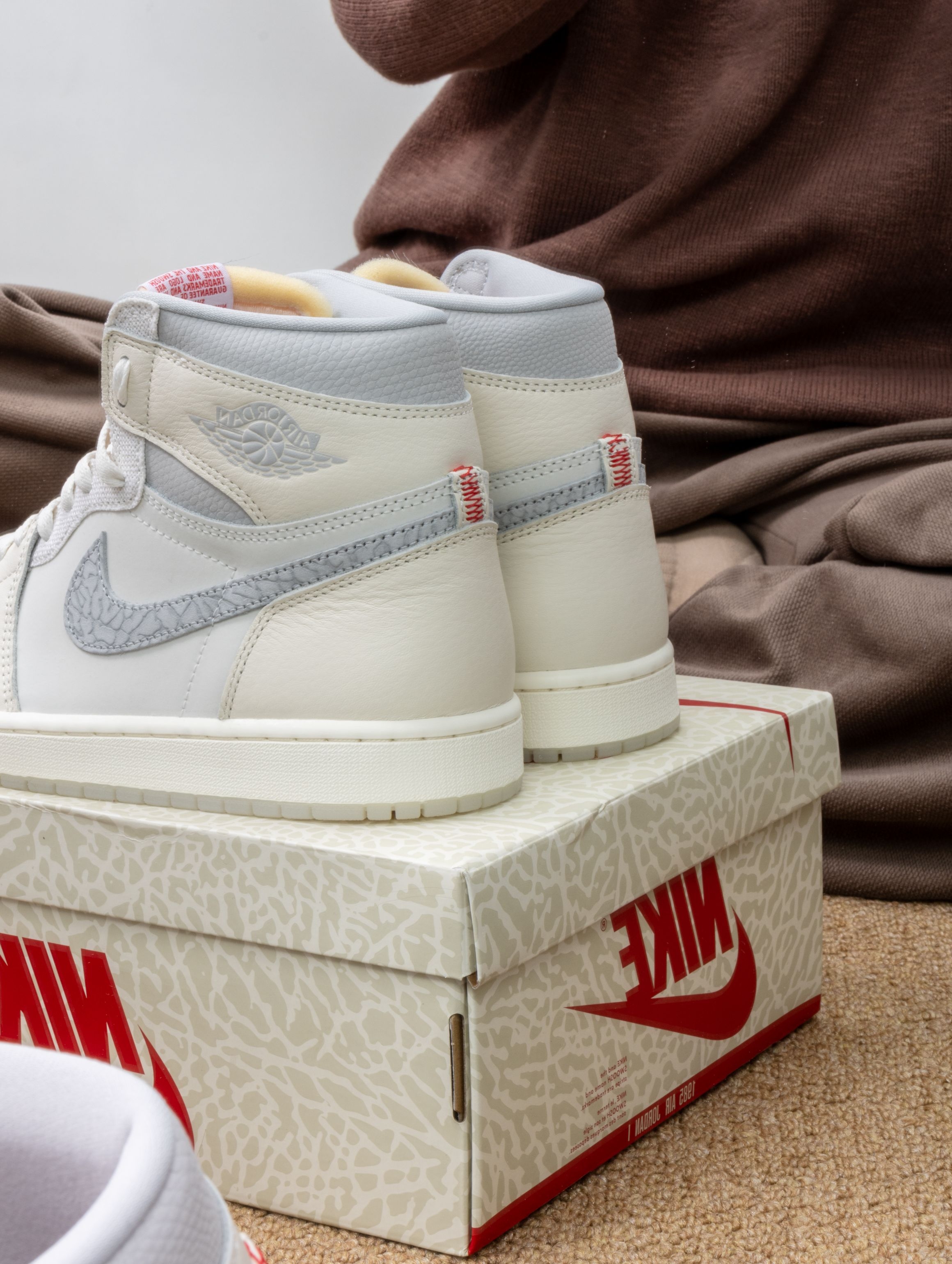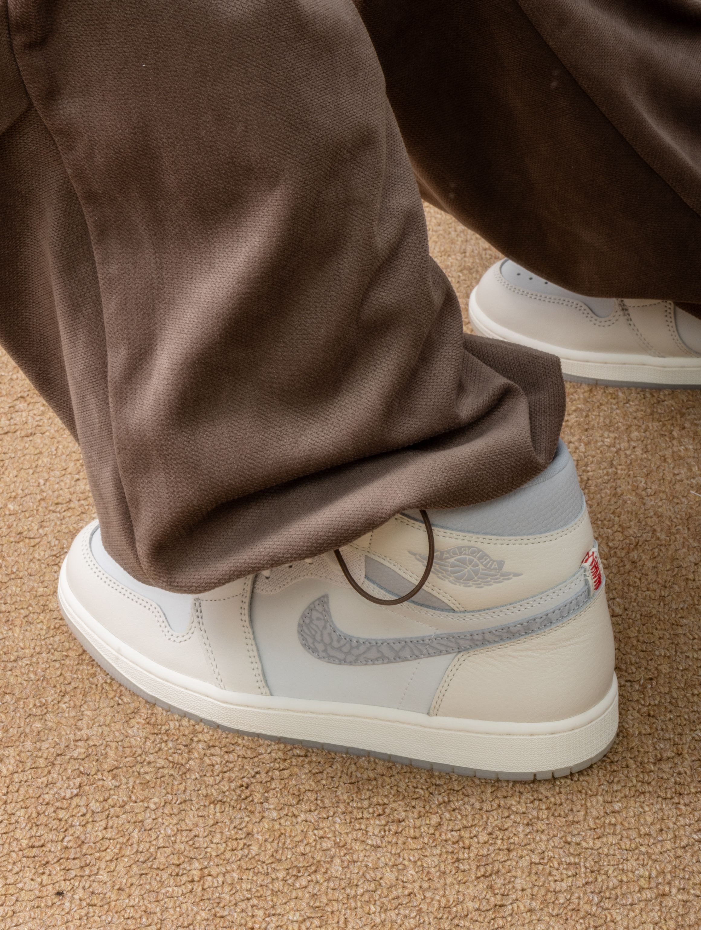AJ1这双白灰真的属于“拿到手才懂系列”!实物比网图干净太多,Sail色鞋头配浅灰鞋帮,麂皮质感软得像刚开封的奶油。 上脚完全不需要磨合期,高帮裹住脚踝却一点也不勒,下午逛街几个小时脚底板都没抗议。 最近出门不知道穿什么就摸它出来,衣柜里随便捞件卫衣牛仔都能搭。