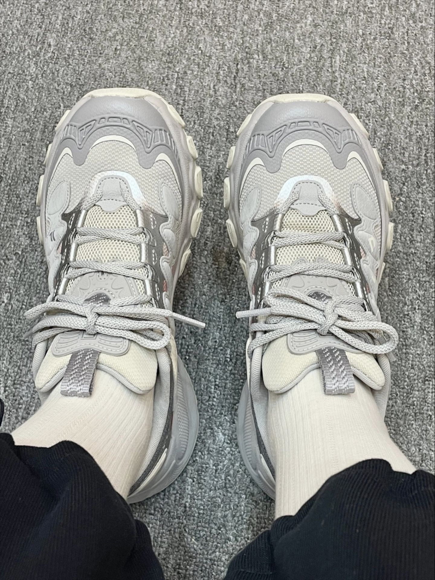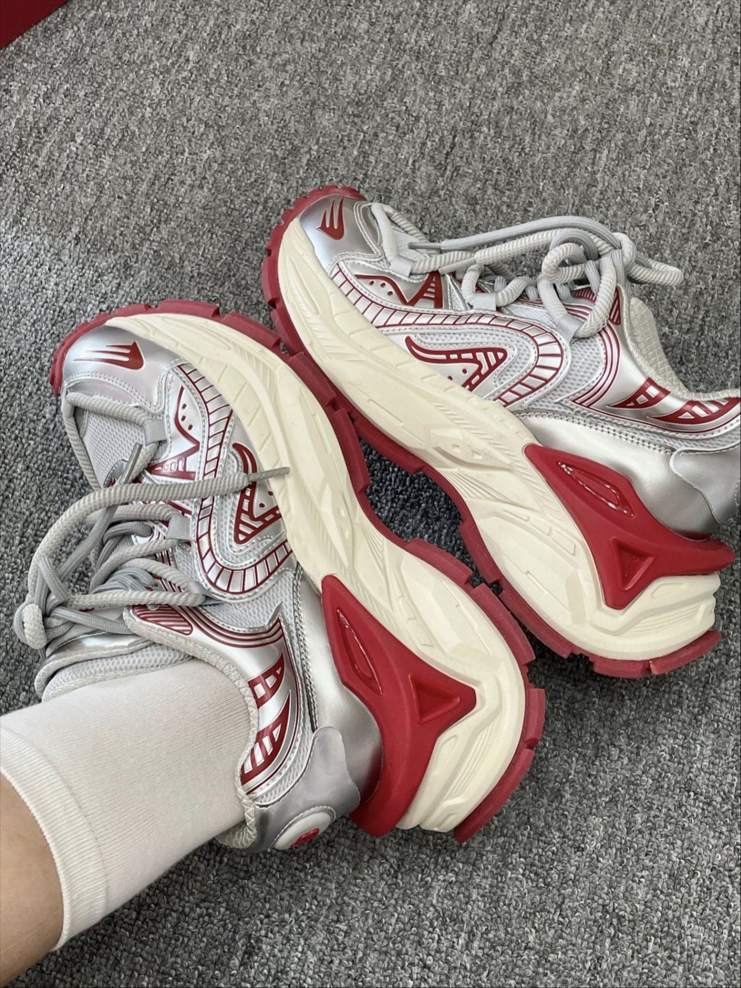 FILA这波复古干禧风我是真服了!蘑菇鞋也泰好穿了吧——灰银拼红的配色一眼击中,银灰基底配亮红点缀,时髦得毫不费力。 上脚感觉:软!厚底回弹超赞,暴走两小时都不累脚。作为小个子女生,这4厘米隐形增高简直救命,比例瞬间拉长,还稳得像踩云朵。 更绝的是百搭属性:搭直筒牛仔裤是慵懒街拍感,配卡其休闲裤又变复古学院风。FILA你小子到底有没有瓶颈期啊?
