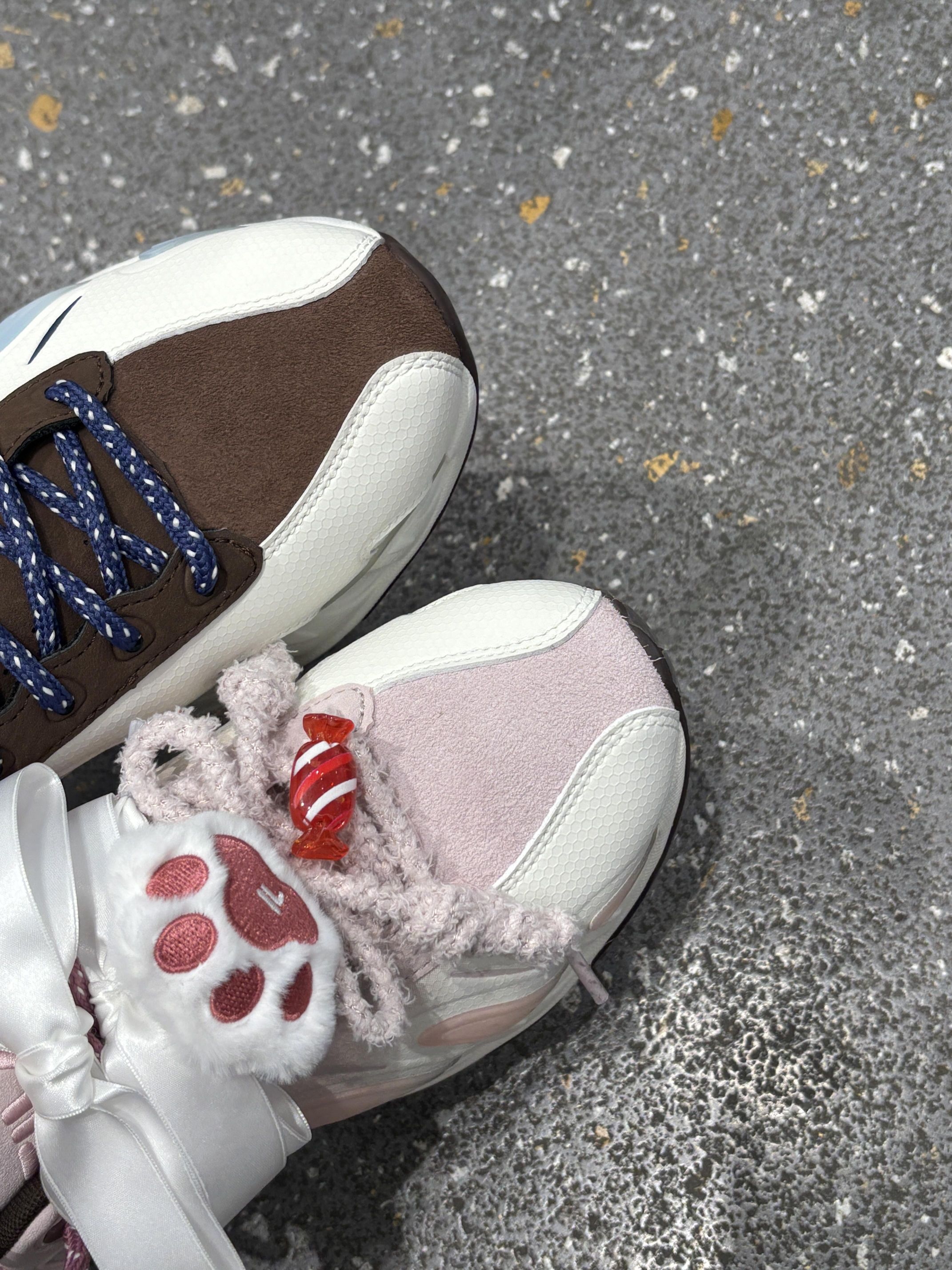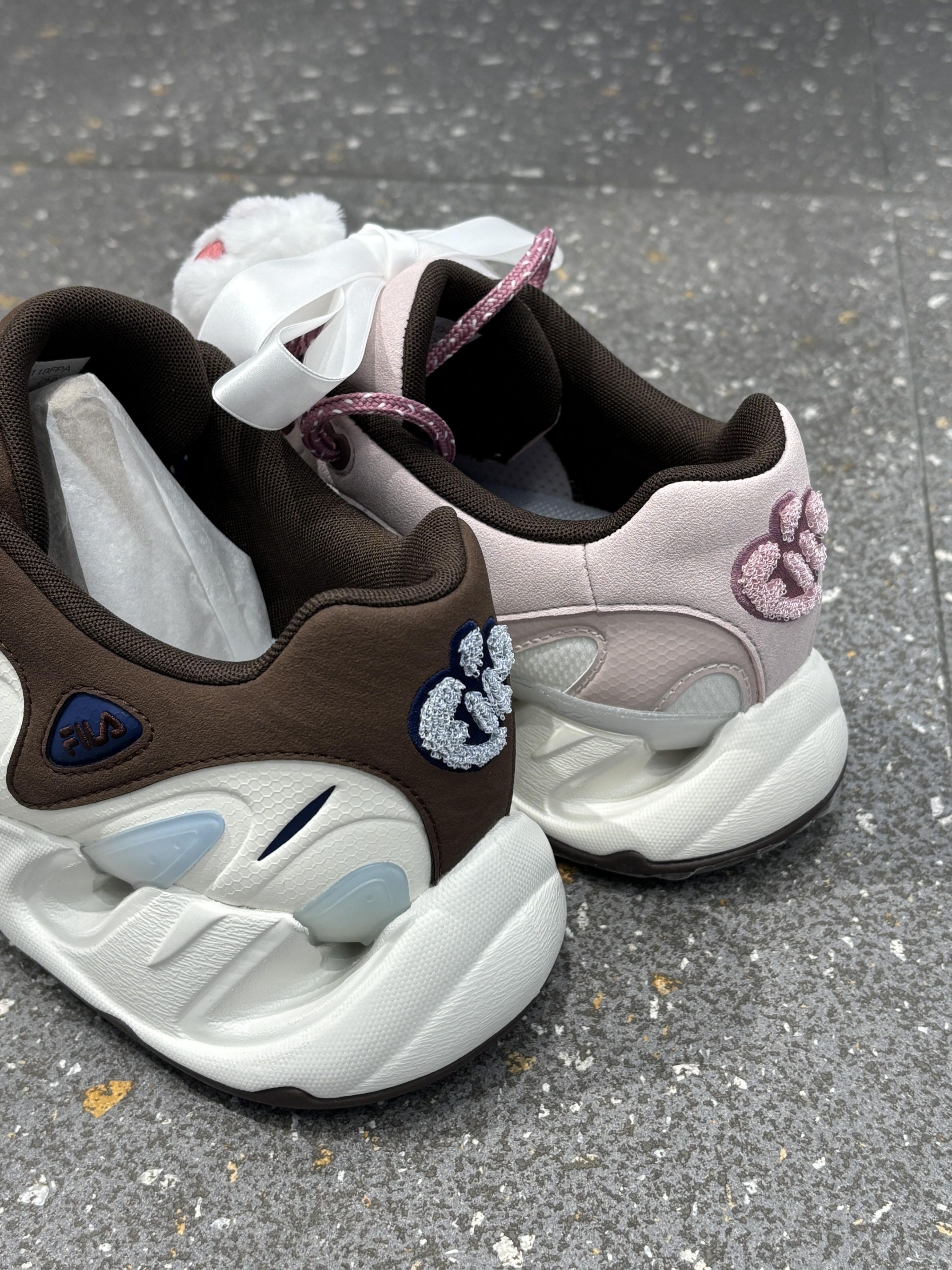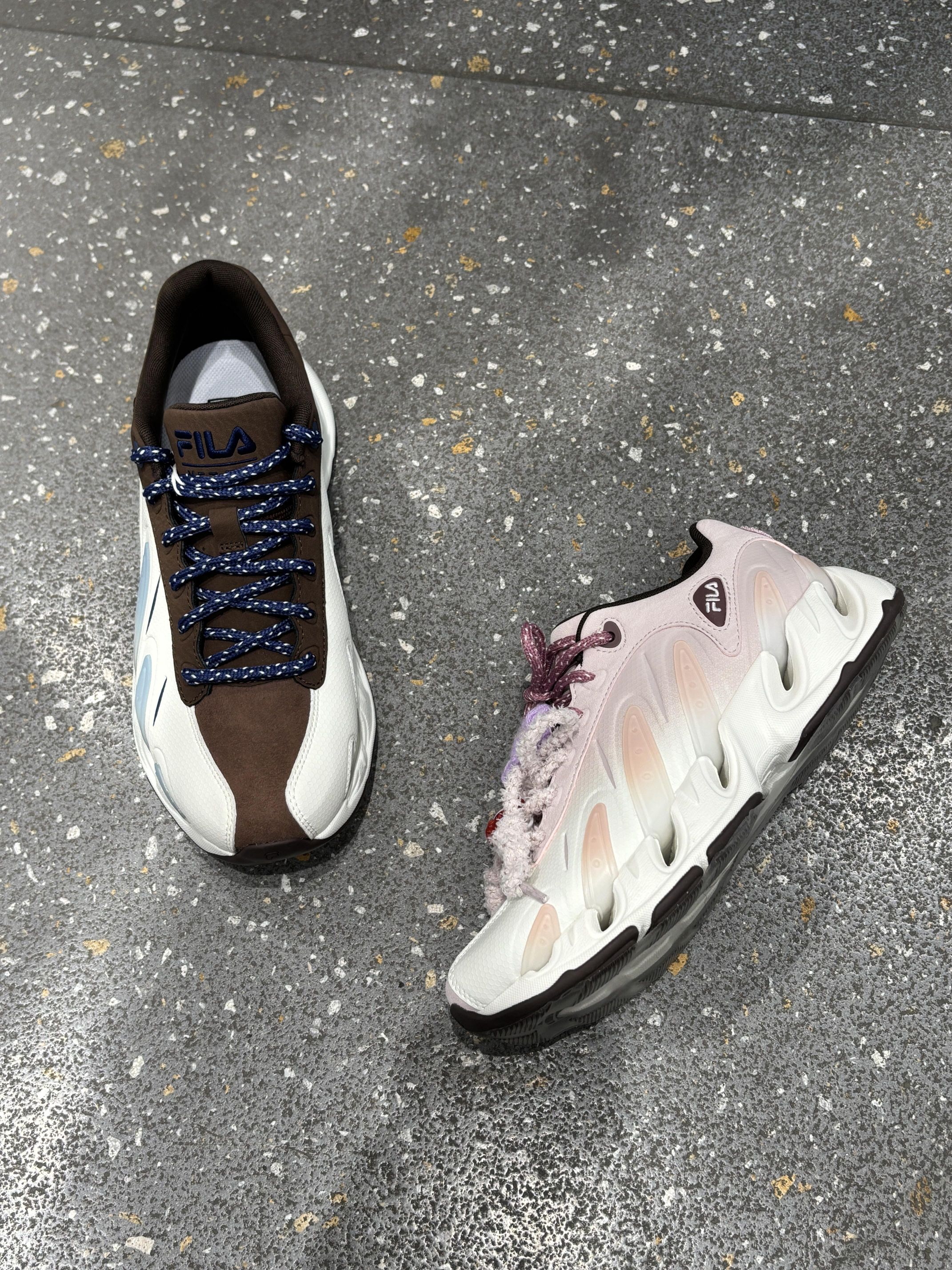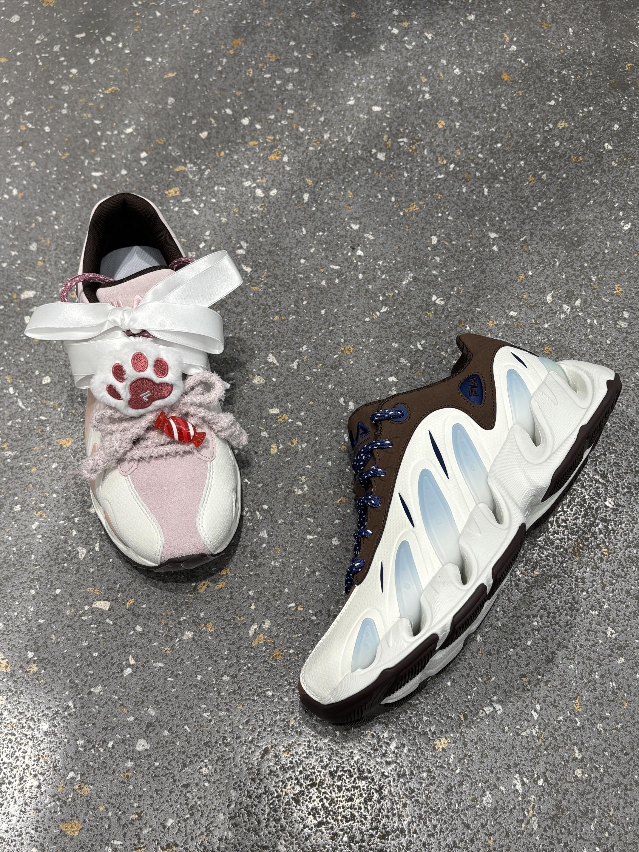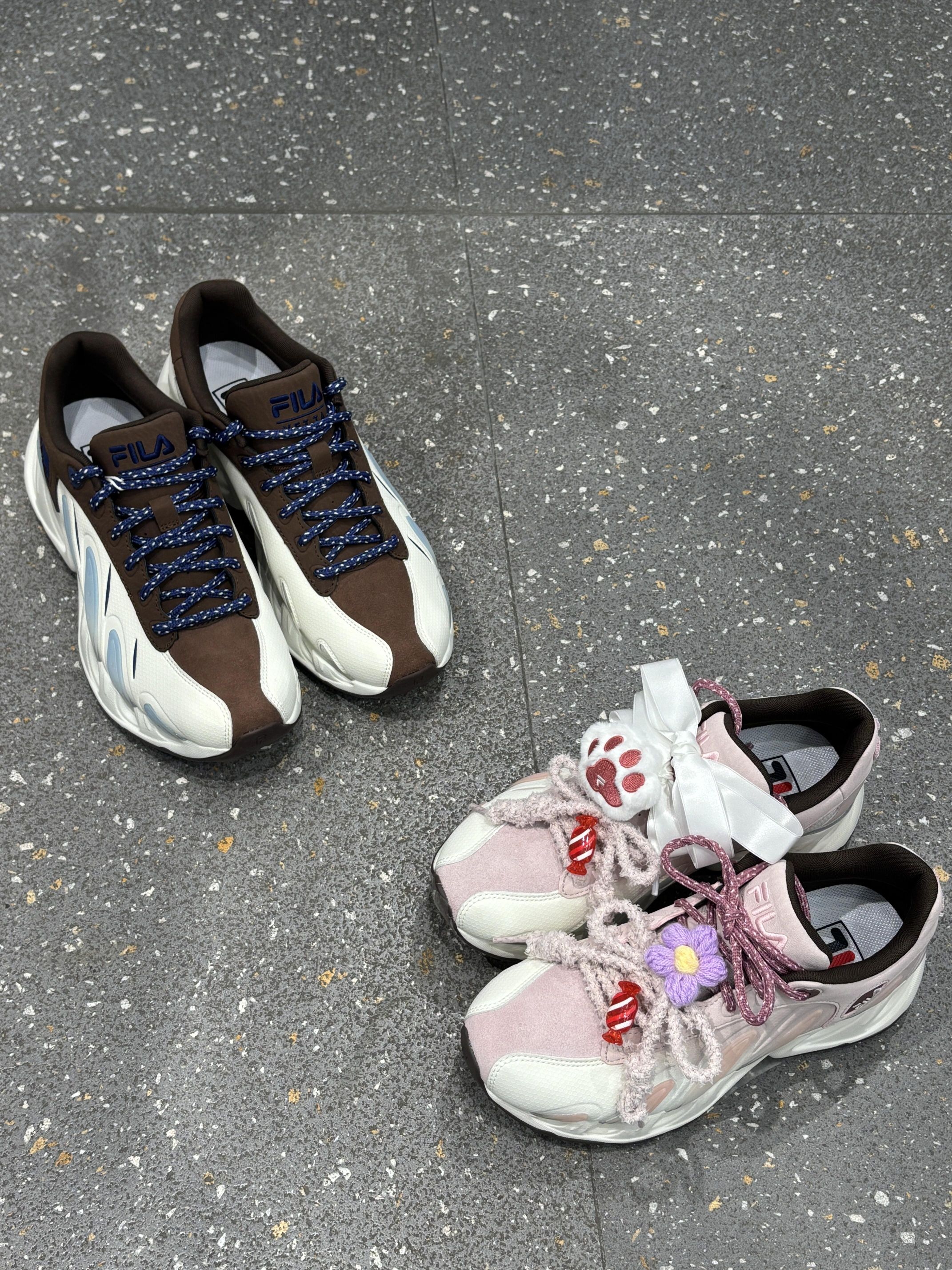 📖总结评价:谁懂啊!这双FILA CP鞋直接把“情侣氛围感”焊在了脚上! 👦🏻男生款是深棕+米白的撞色,搭配藏蓝编织鞋带,硬挺的鞋型自带街头酷感,随便搭牛仔裤或卫裤都超有男友力,走在路上回头率直接拉满! 👧🏻女生款是软fufu的樱花粉+米白拼接,我自己加了毛绒鞋带和小花、猫爪挂饰,甜妹感直接溢出屏幕!鞋后跟的粉色刺绣标和男款的蓝白标还能呼应,细节里全是小心思~ 周末一起压马路、逛展,脚下这双一粉一...