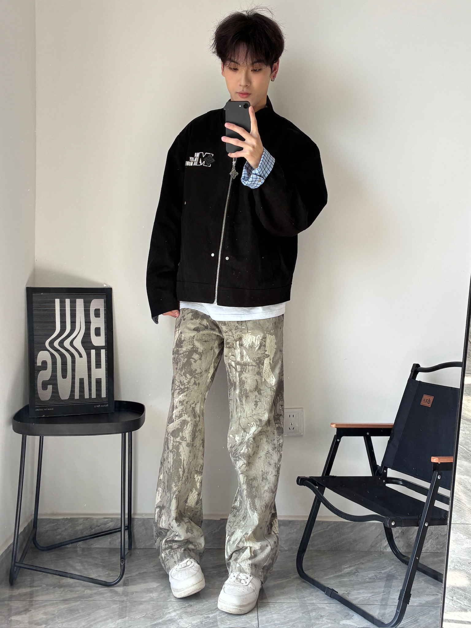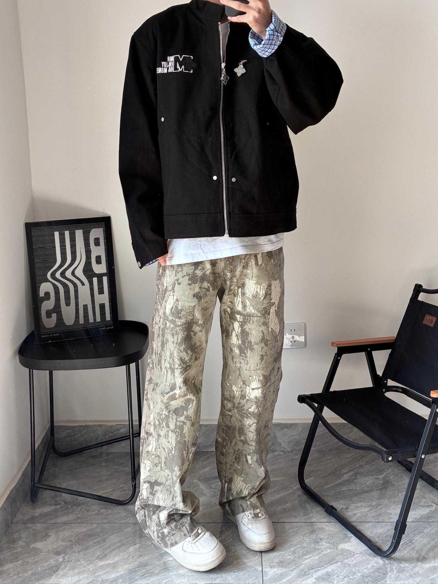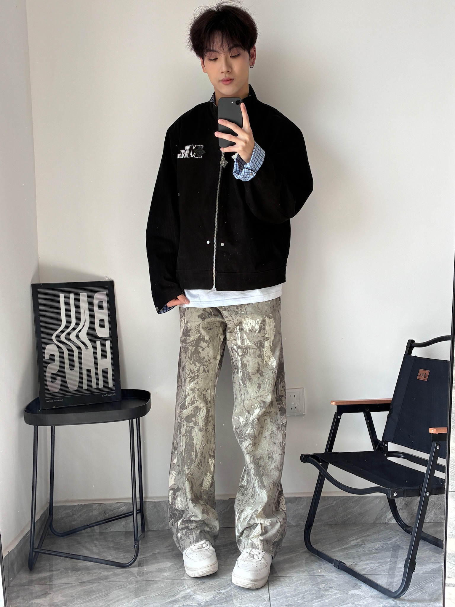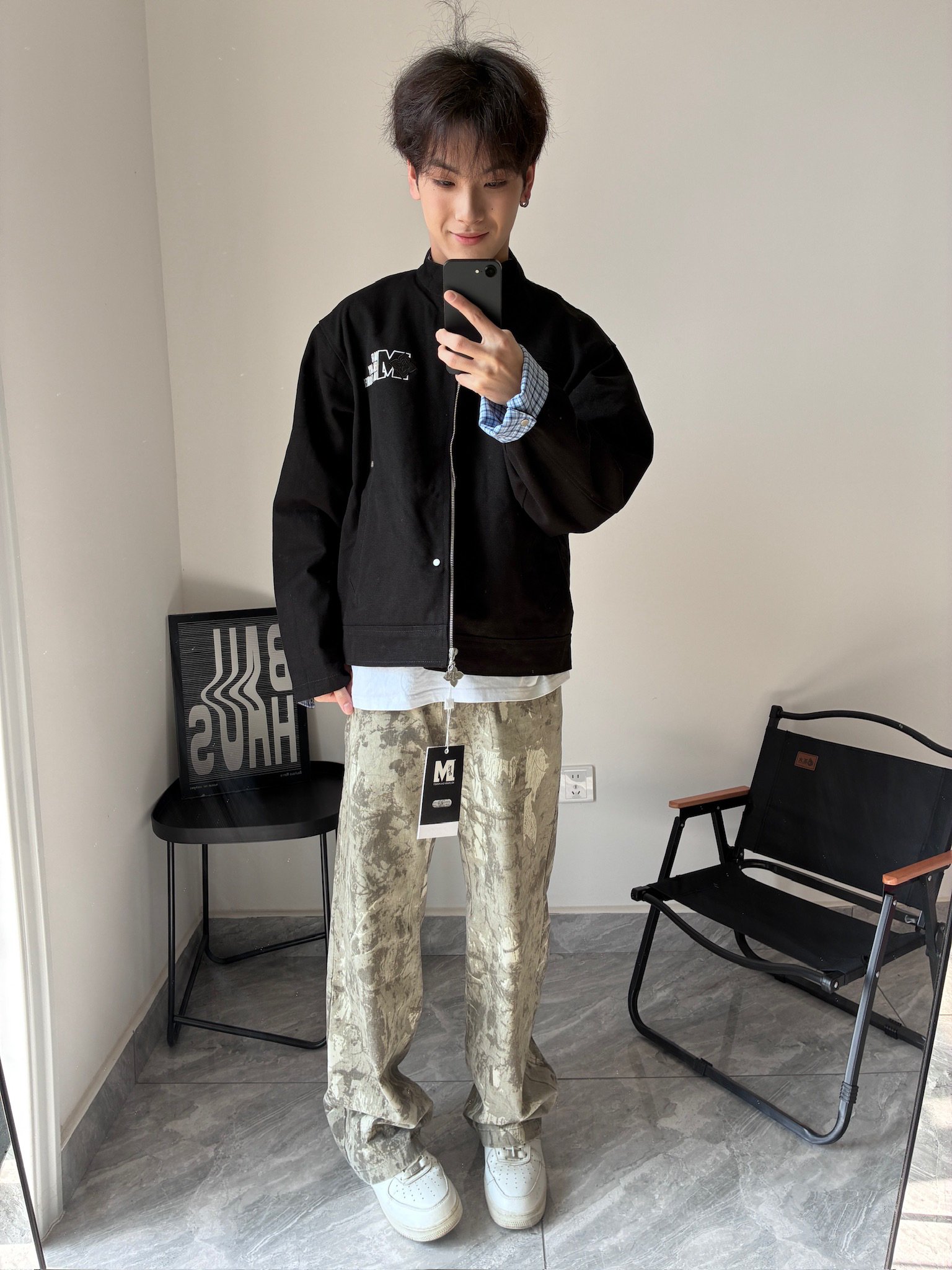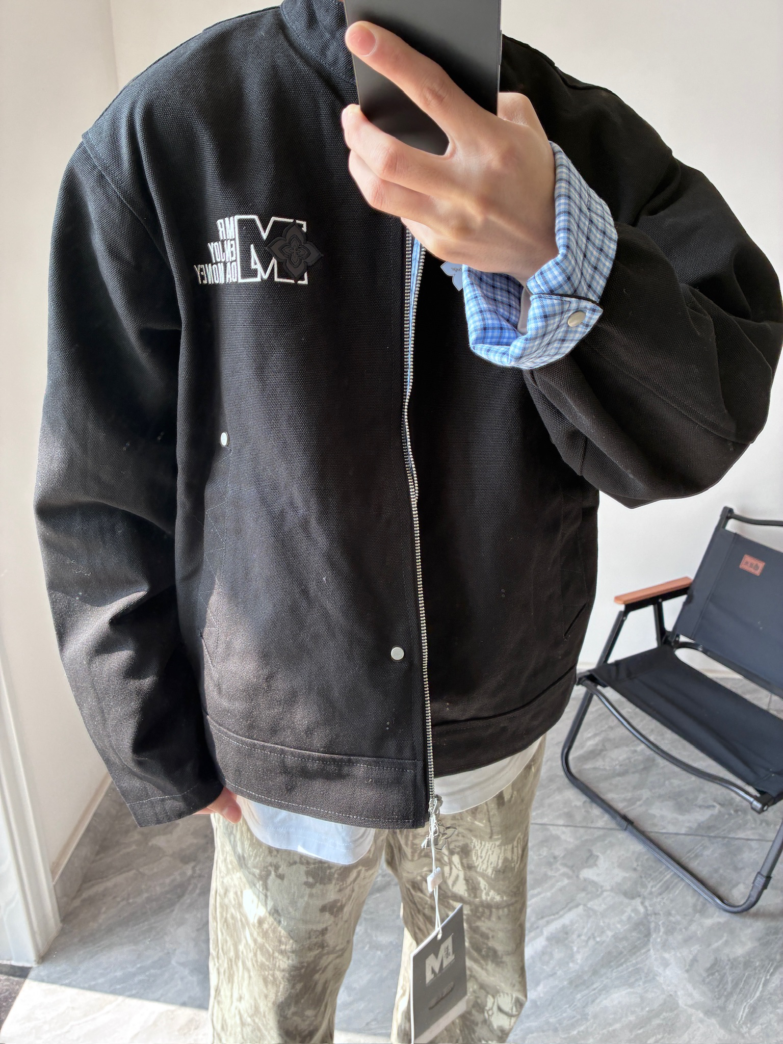 我宣布这是我今年买到最满意的一件外套!🤩 立领设计很显精神,胸前的字母印花也不夸张,低调又有设计感。最绝的是袖口的蓝格纹,不经意间露出来,瞬间让整个穿搭不单调。搭配我的小白鞋,简单又干净,男生这么穿真的很加分!