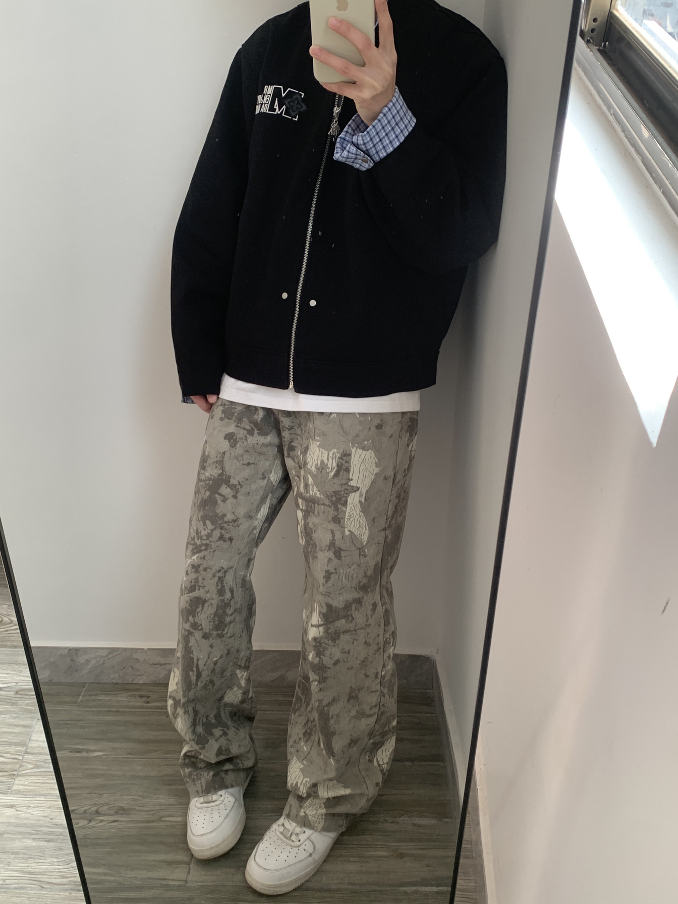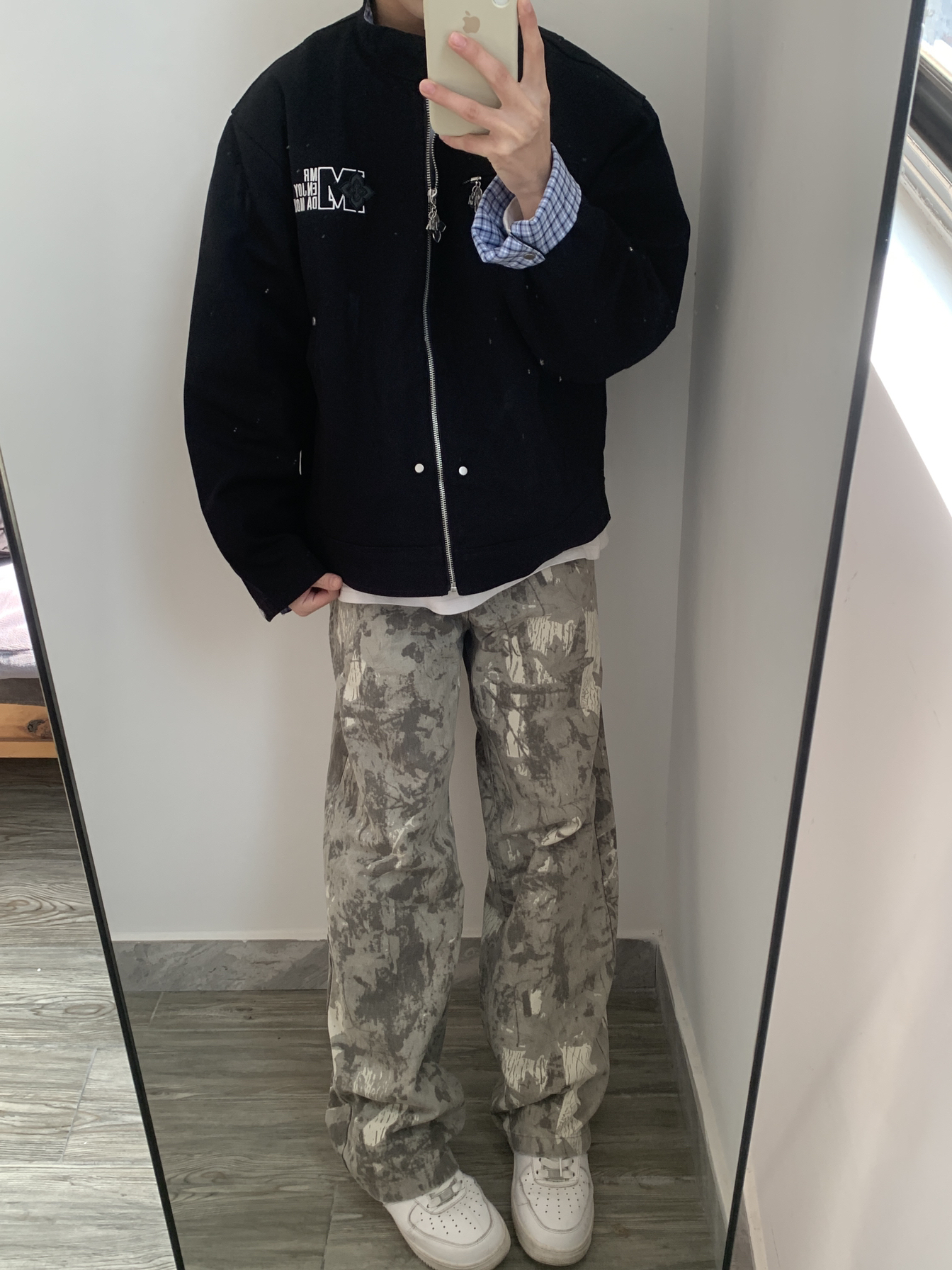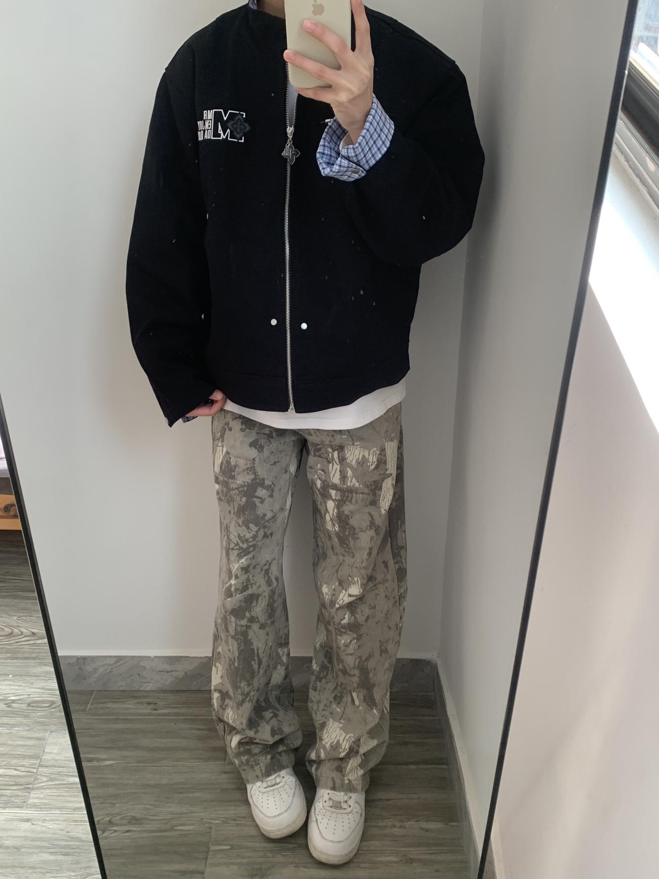 这件黑色棒球夹克真的太百搭了!内搭格纹衬衫增加层次感,春天穿它出门,又酷又保暖。