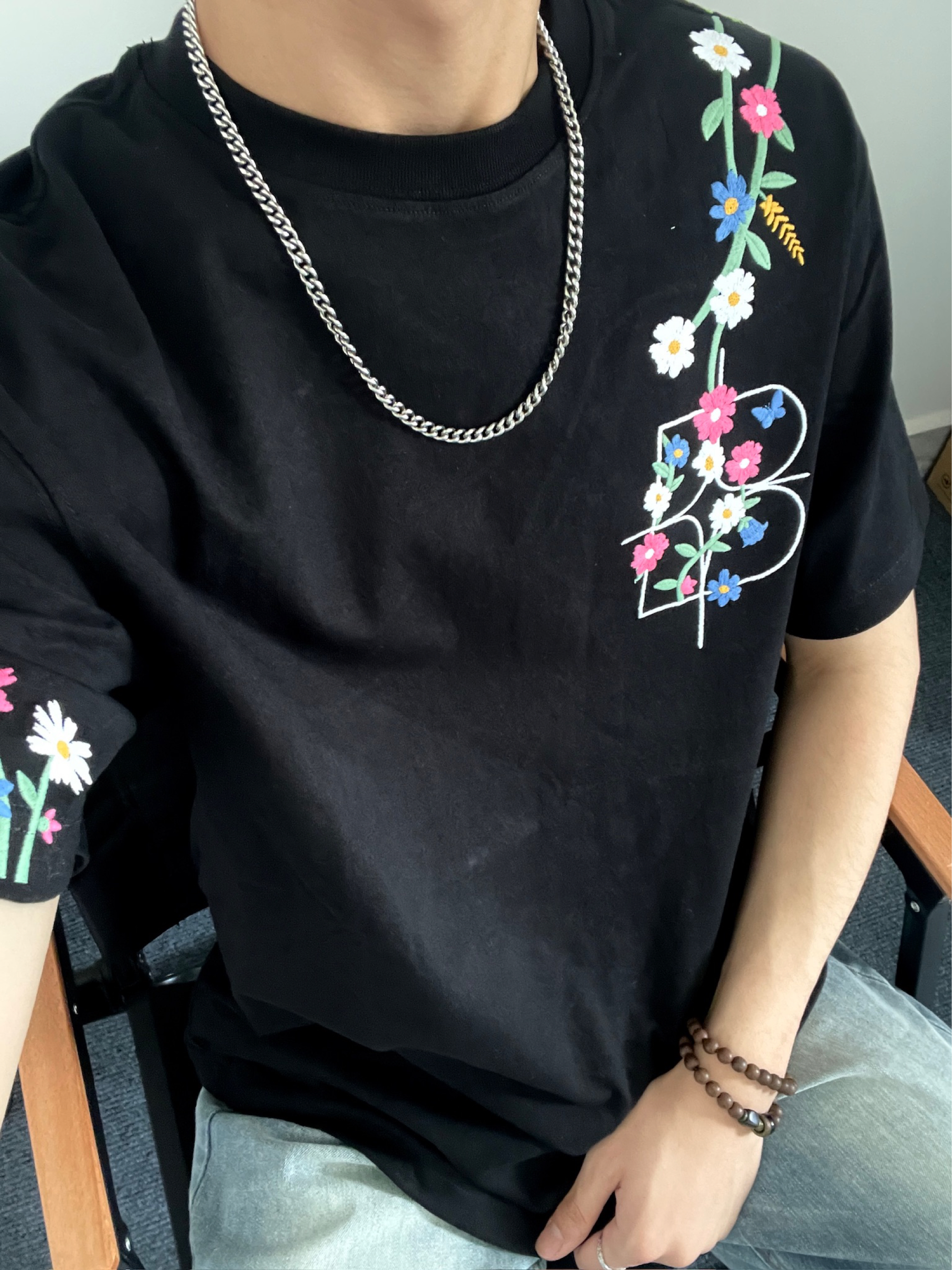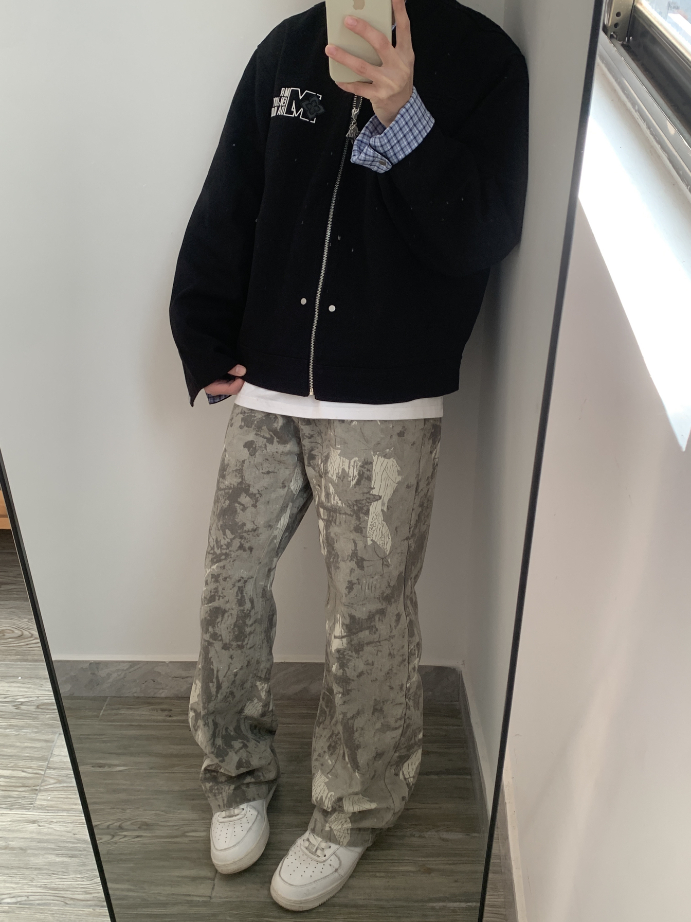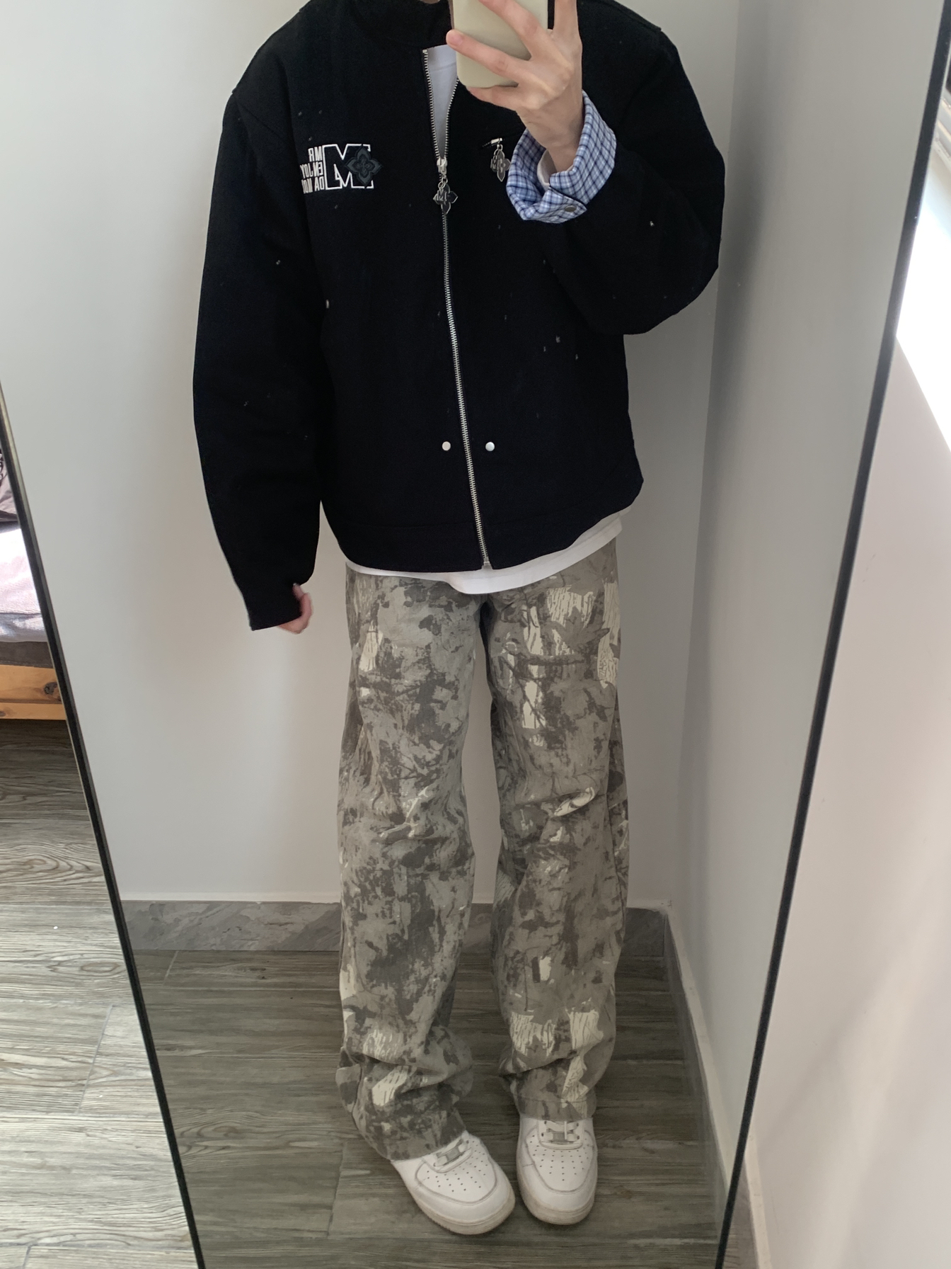 这件黑色棒球夹克真的太百搭了!内搭格纹衬衫增加层次感,春天穿它出门,又酷又保暖。