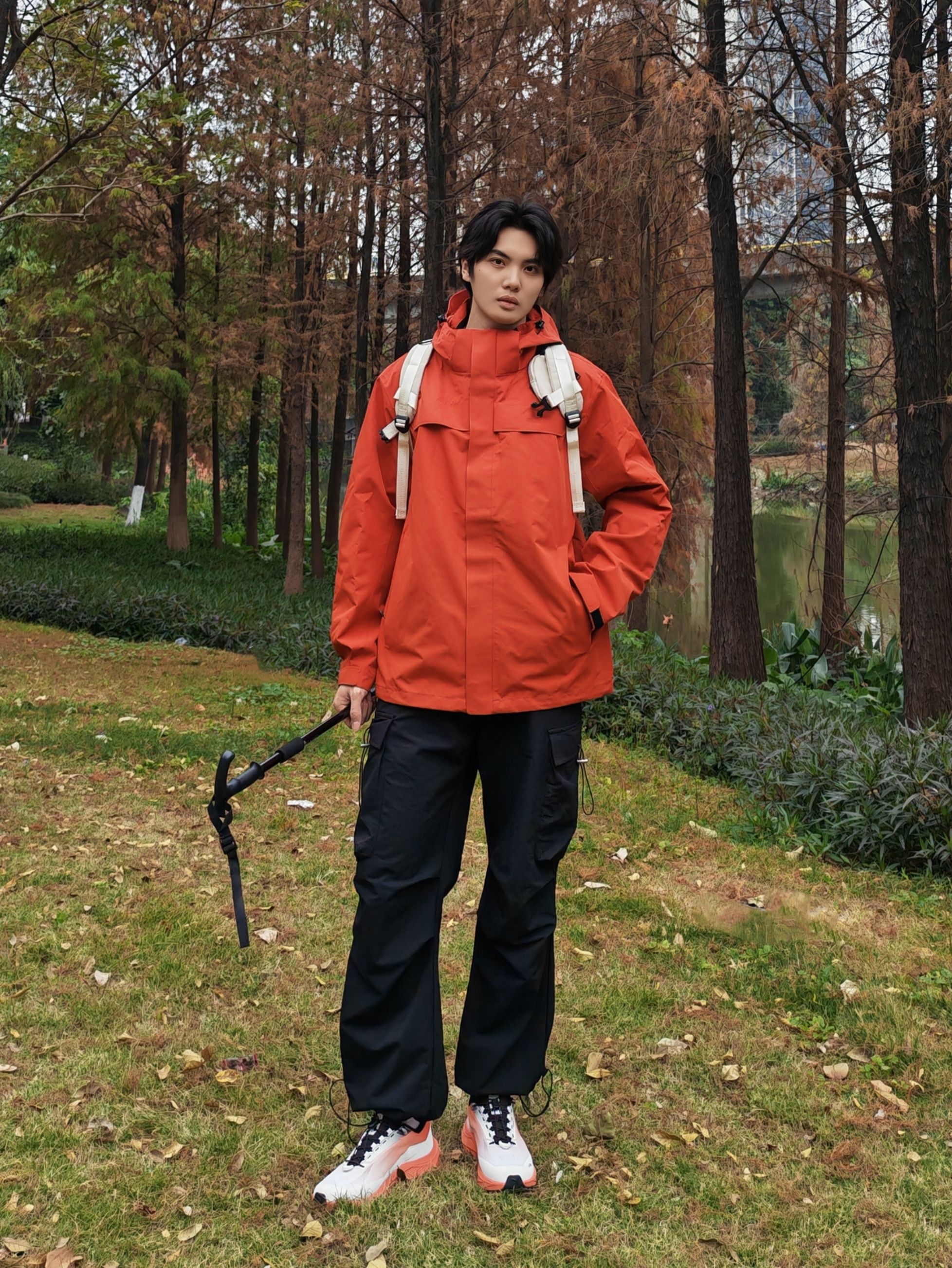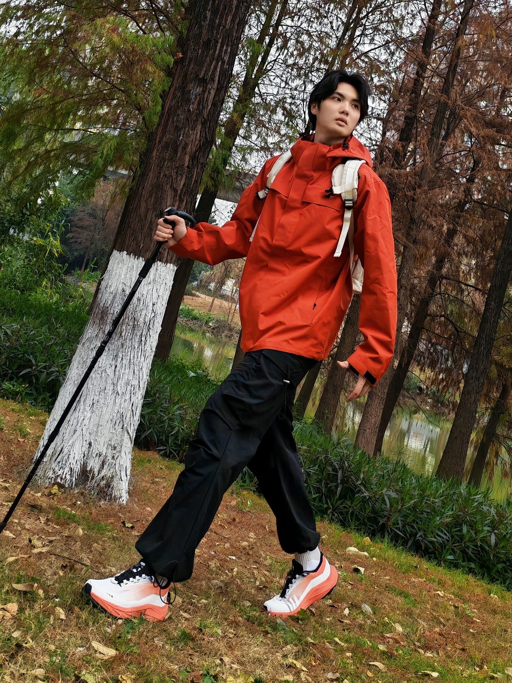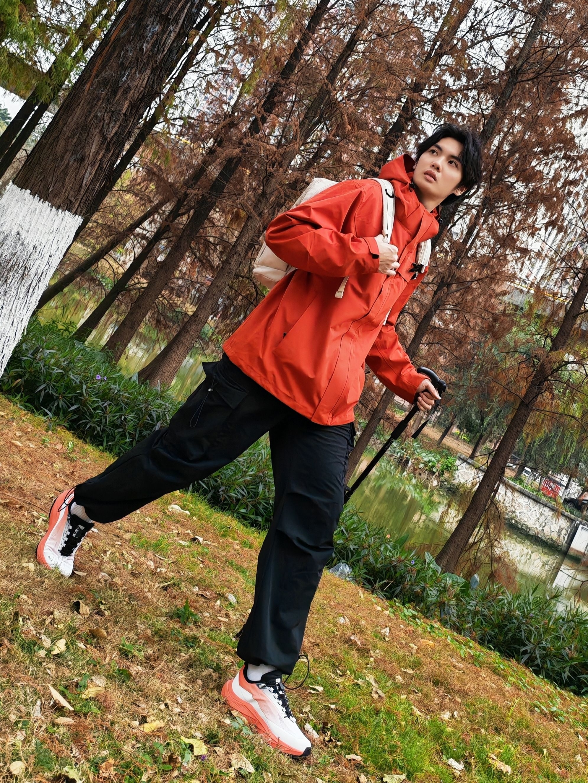 谁懂啊!红黑配色真的太适合户外了,走在林间小道上,整个人都像一团行走的火焰🔥 - 外套:亮红色冲锋衣,防风又吸睛,连帽设计还能应对多变天气 - 裤子:黑色机能工装裤,宽松版型活动超自在,口袋还能装小物件 - 鞋子:橙白渐变户外鞋,抓地力拉满,配色和外套呼应得刚刚好 - 配饰:浅色系双肩包+登山杖,氛围感直接拉满 走在湖边树林里,随便摆摆都很出片,活力感直接溢出屏幕~