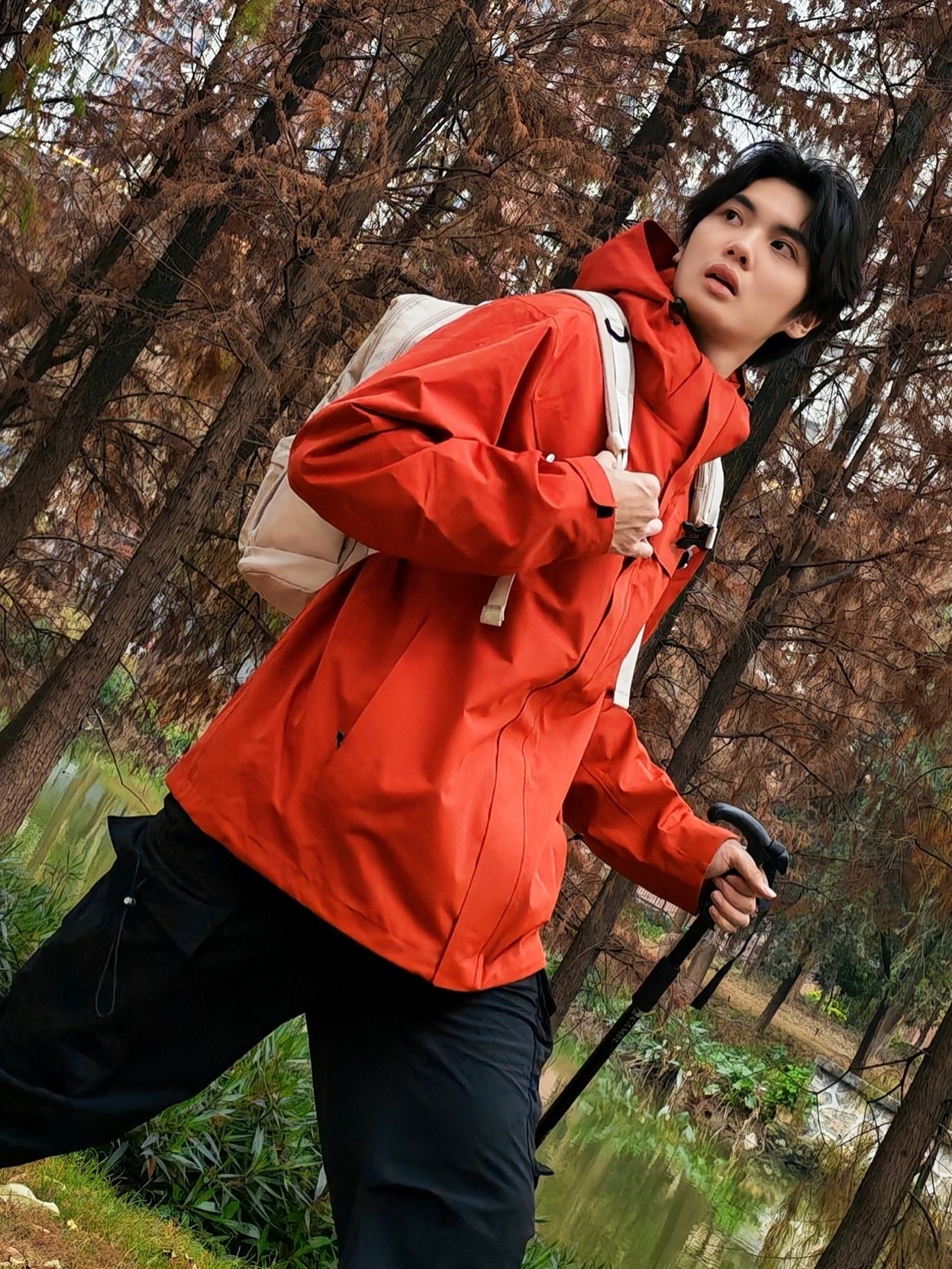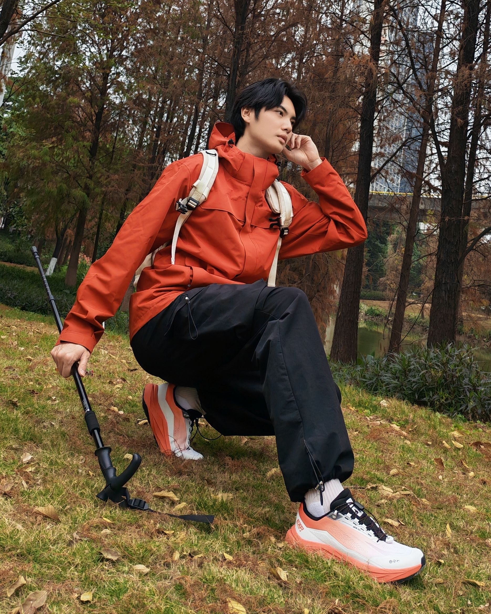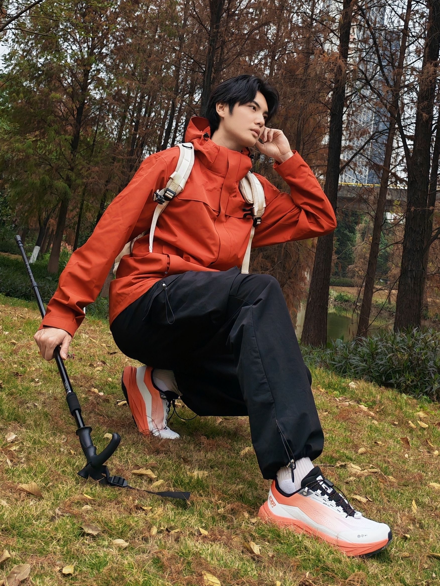 谁懂啊!红黑配色真的太适合户外了,走在林间小道上,整个人都像一团行走的火焰🔥 - 外套:亮红色冲锋衣,防风又吸睛,连帽设计还能应对多变天气 - 裤子:黑色机能工装裤,宽松版型活动超自在,口袋还能装小物件 - 鞋子:橙白渐变户外鞋,抓地力拉满,配色和外套呼应得刚刚好 - 配饰:浅色系双肩包+登山杖,氛围感直接拉满 走在湖边树林里,随便摆摆都很出片,活力感直接溢出屏幕~