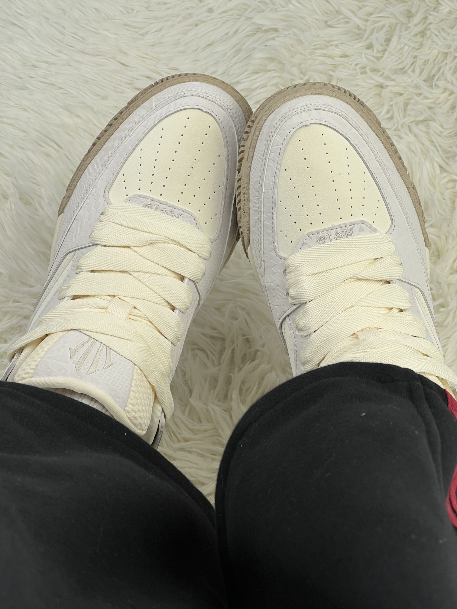 这双安踏欧文密码Hélà CODE米白配色板鞋,拿到手第一感觉就是质感比我想象的要扎实细腻✨。米白+浅灰+生胶底的拼色真的很温柔,配牛仔裤、卫裤、运动裤都不挑,日常出门不用想搭配,这点我真的爱了💯。 在脚感方面,前掌有一点点软弹反馈,但后掌偏硬,长时间逛街还是有点累,毕竟是板鞋属性。宽扁鞋带看着很有质感,但穿脱时容易和鞋舌摩擦,这点算是个小缺点。 然后我上脚感觉鞋头偏窄,如果宽脚的朋友得买...