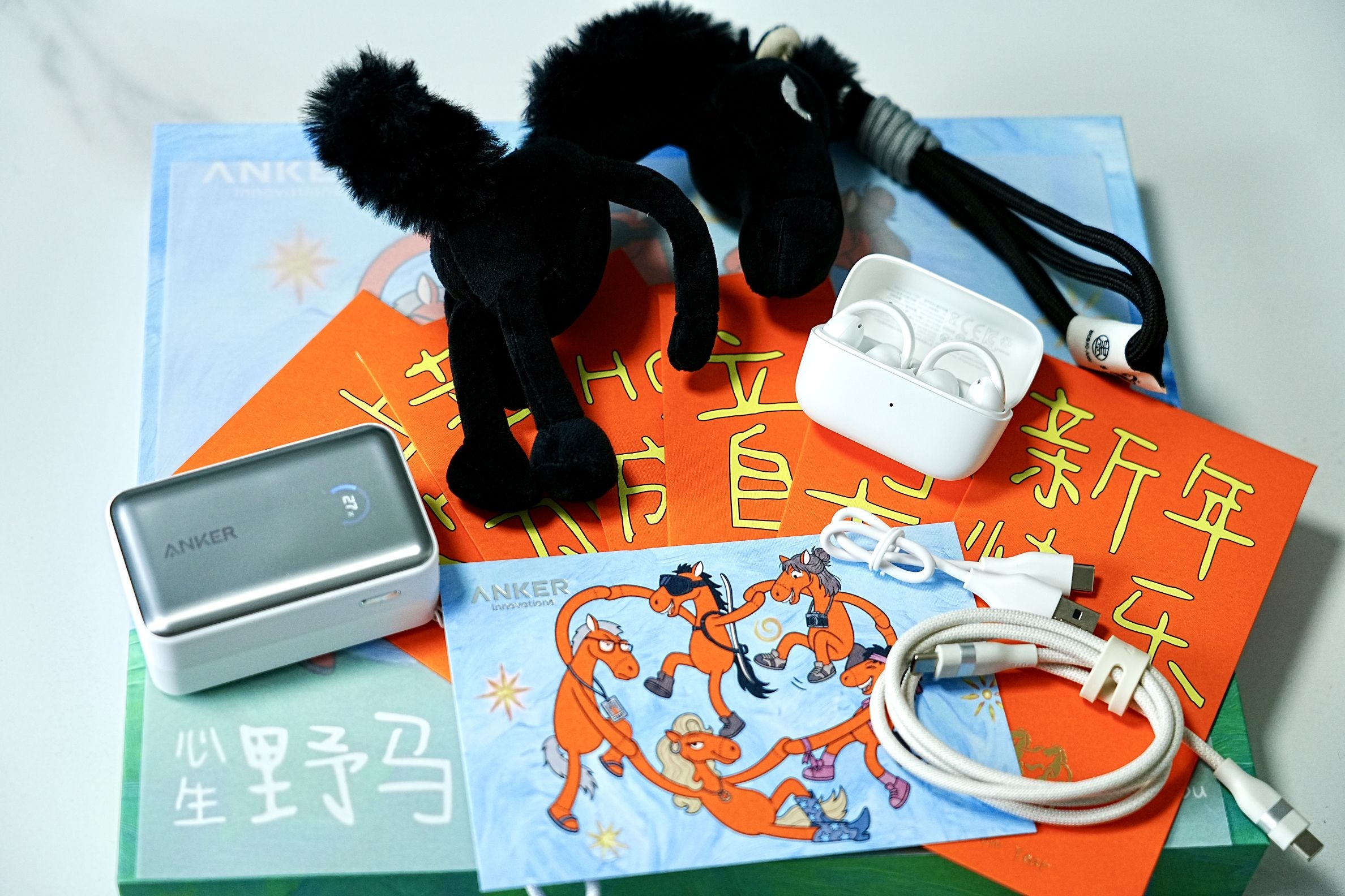 Anker的新春礼盒来了,里面有一匹黑马挂包玩偶,自带线45W充电宝,声阔耳夹式耳机,定制红包,数据线,真的很丰富也很安克,过年回家统统带上。