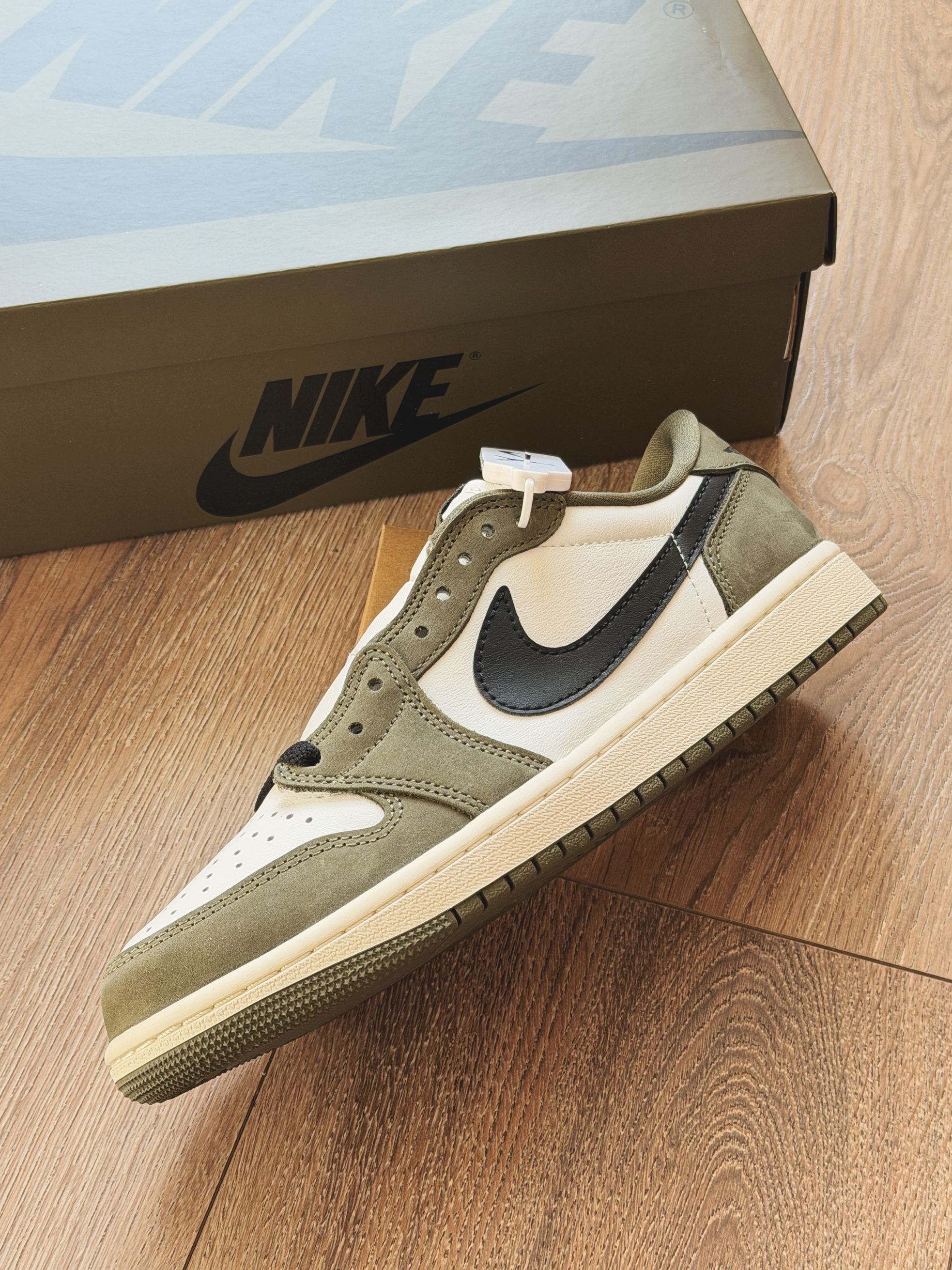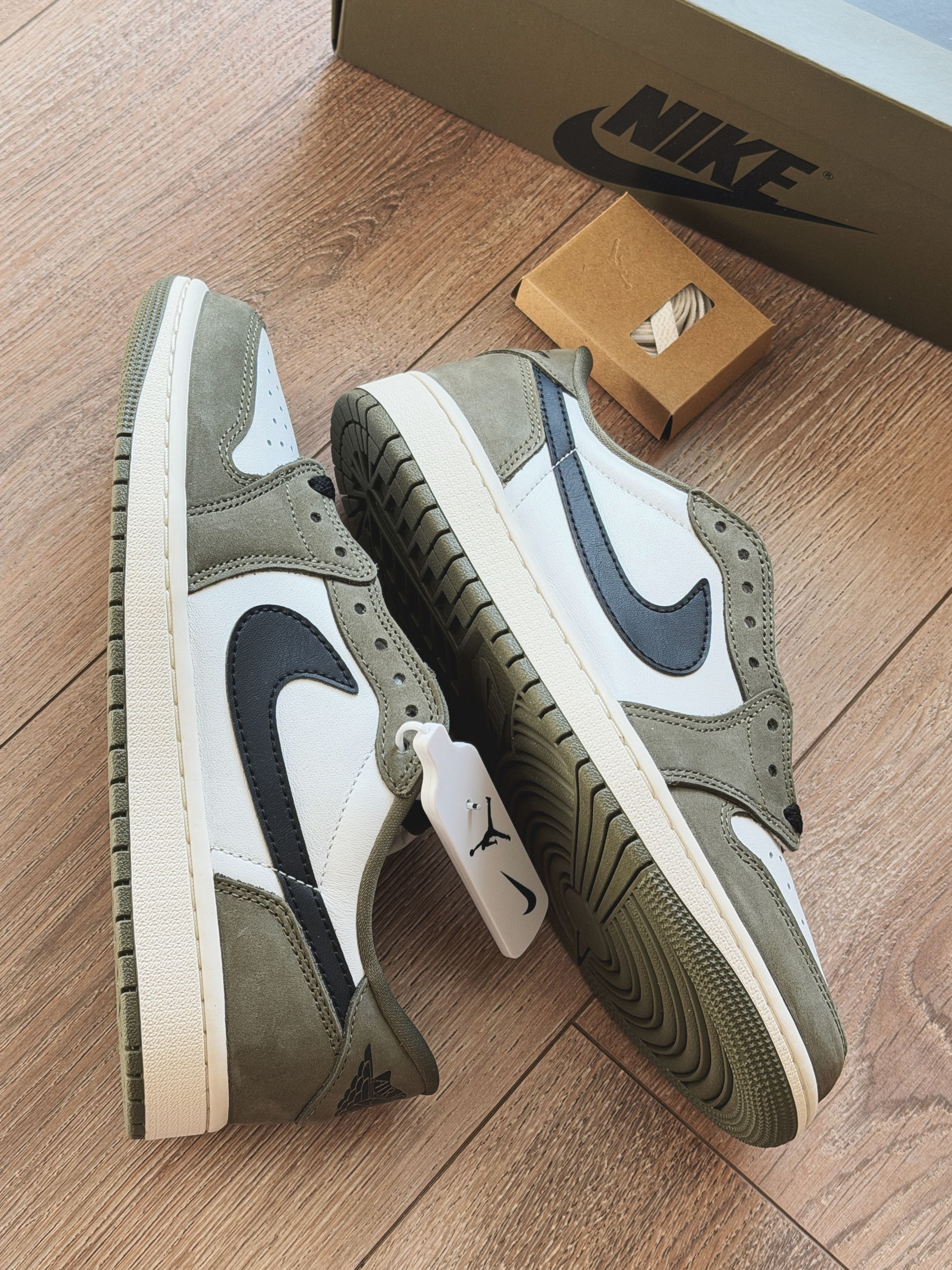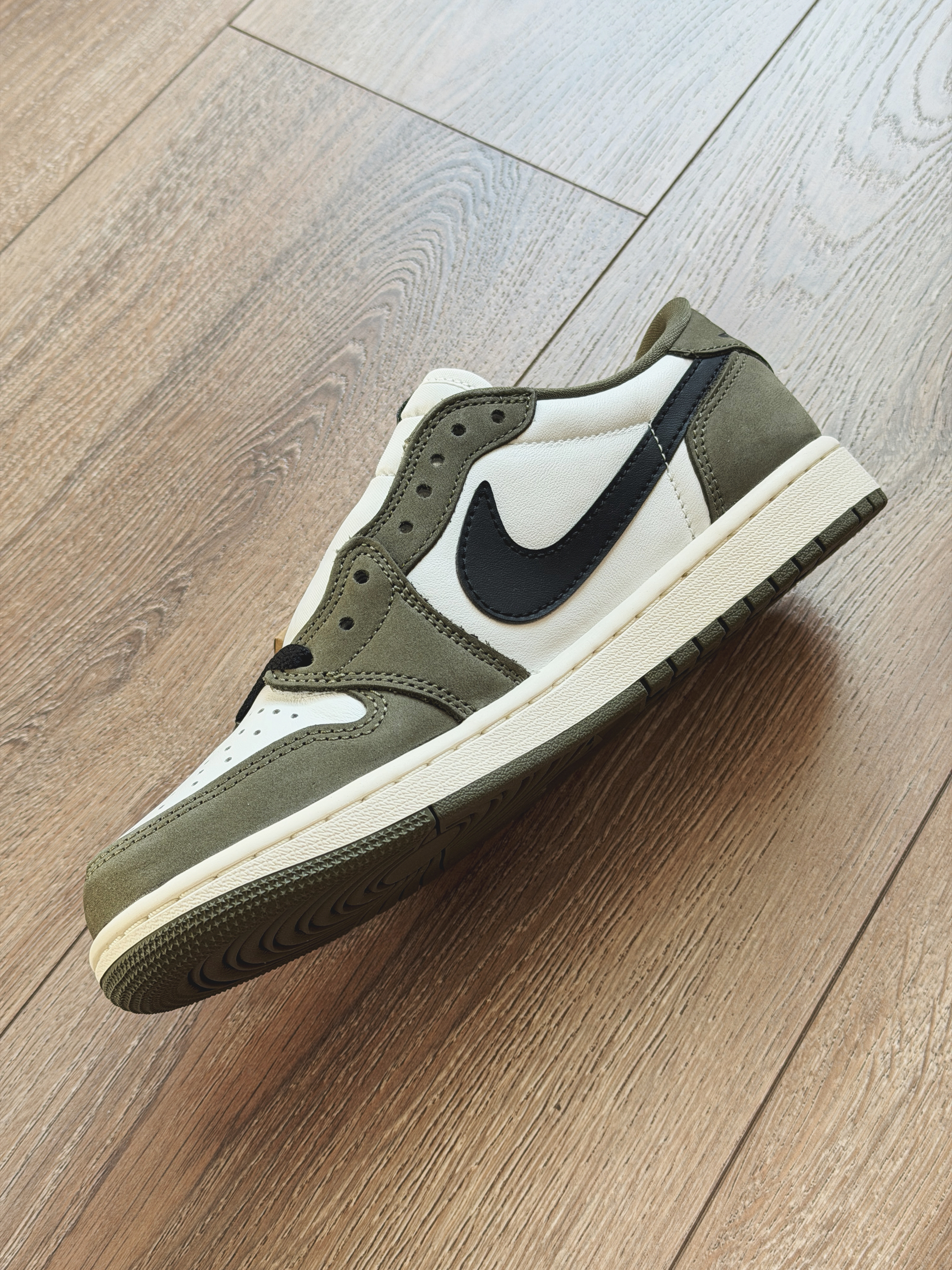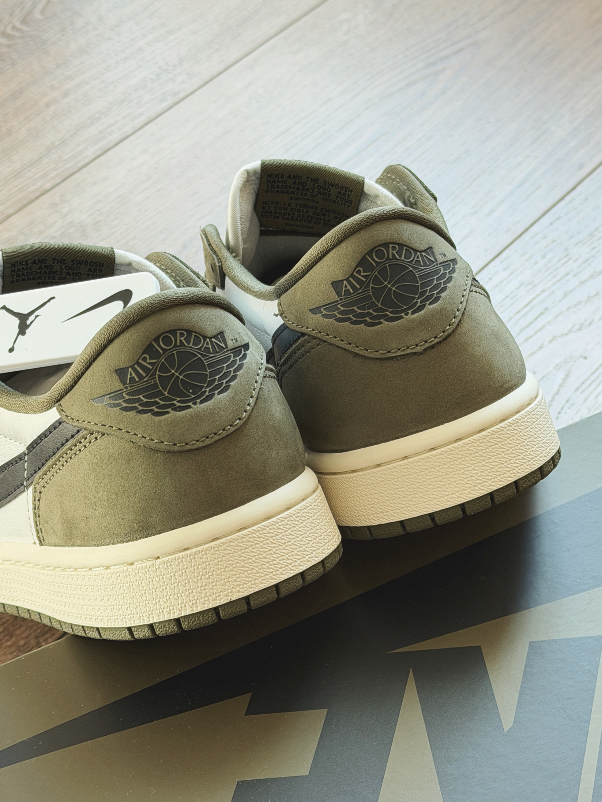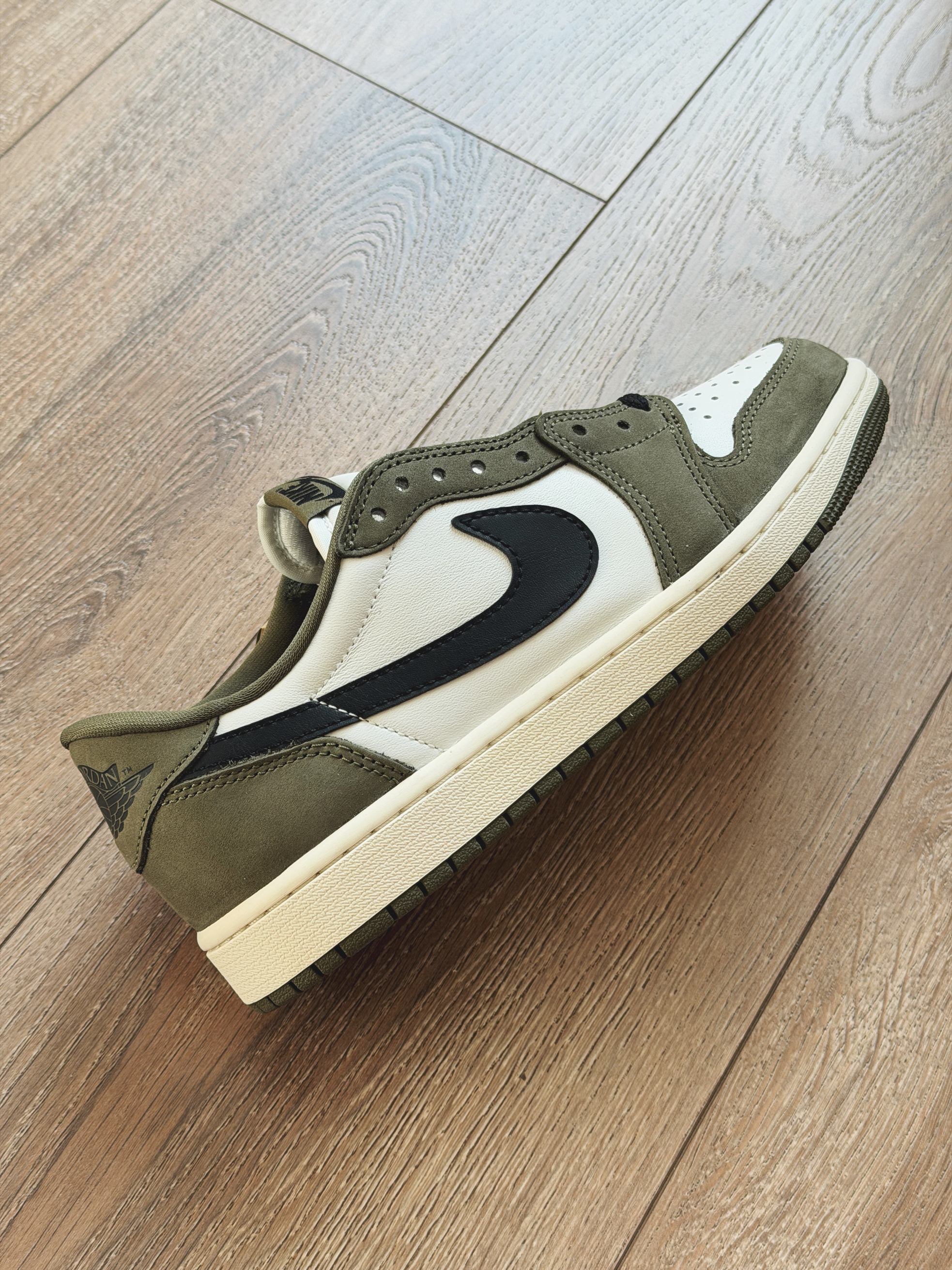 刚刚发售的橄榄绿aj1low真的超级接近倒钩8.0要是帅那肯定还是倒钩!但是自穿来说真的太香了。 全鞋身牛皮革绿色为磨砂质感而白色是光面皮,整体鞋型与之前发售的芝加哥一样都是大大的swoosh!更换了硅胶鞋垫脚感还是不错。穿着这双走路久了也不累,日常搭配休闲装超合适!