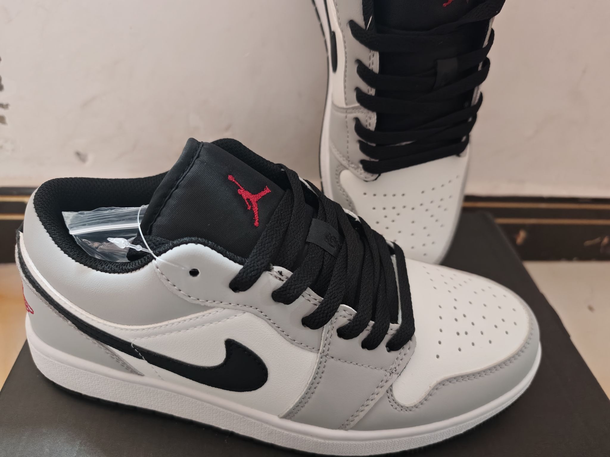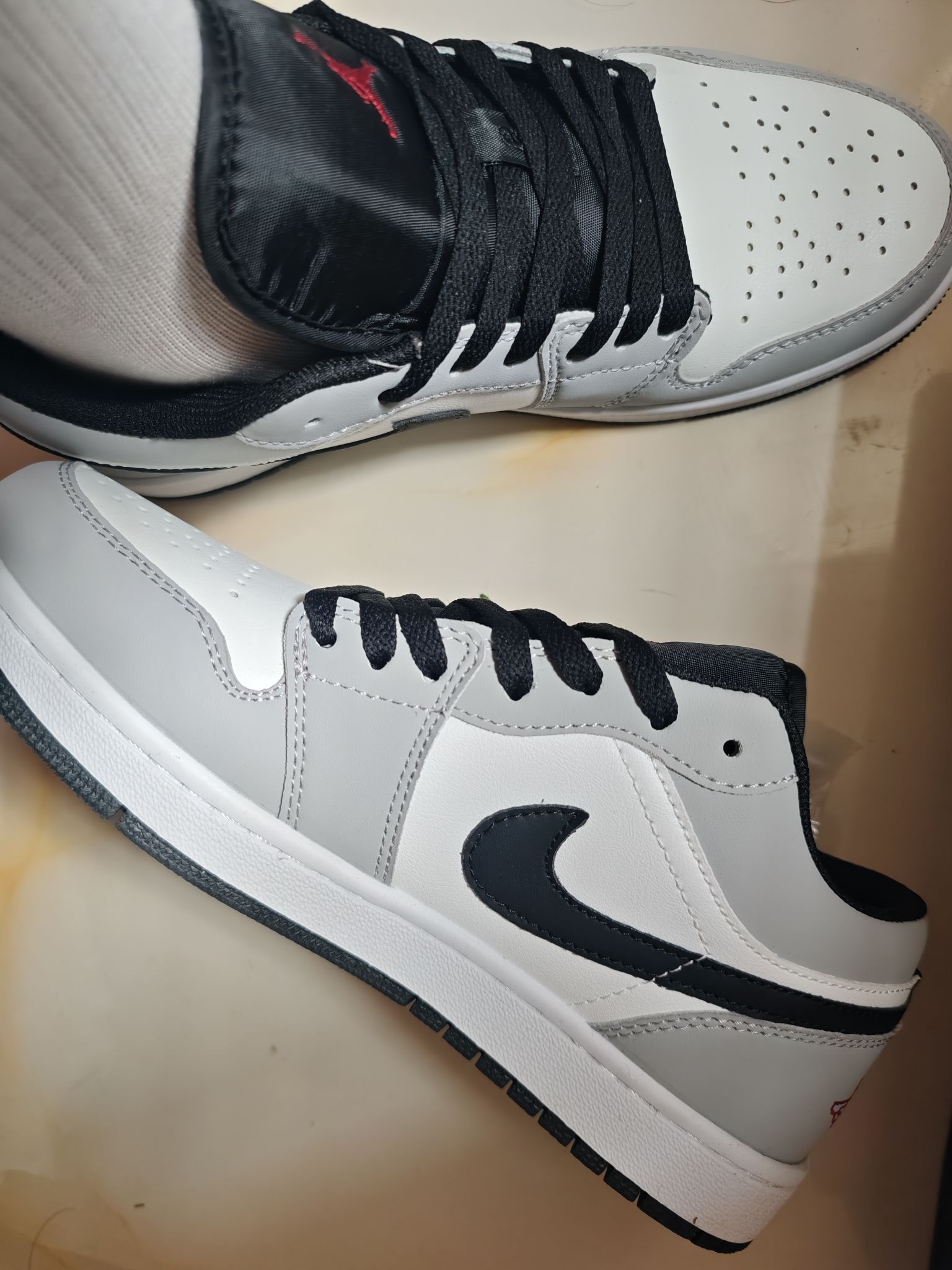 拆开鞋盒瞬间被戳中!灰白黑三色拼接太会了——雾灰鞋面像被晨雾晕染过,搭配纯白鞋头和黑曜石勾子,干净到自带柔光滤镜✨ 低帮设计比高帮更显脚踝细,小个子姐妹也能轻松驾驭~ ✅细节控狂喜:鞋头3D冲孔排列超整齐,夏天穿完全不闷脚;后跟红色飞翼刺绣是点睛之笔,低调中藏着AJ的灵魂DNA! ✅百搭到犯规:配牛仔裤是美式校园风,搭短裙秒变甜酷辣妹,甚至能踩后跟当拖鞋穿,懒人福音实锤! ✅脚感惊喜:鞋垫软...