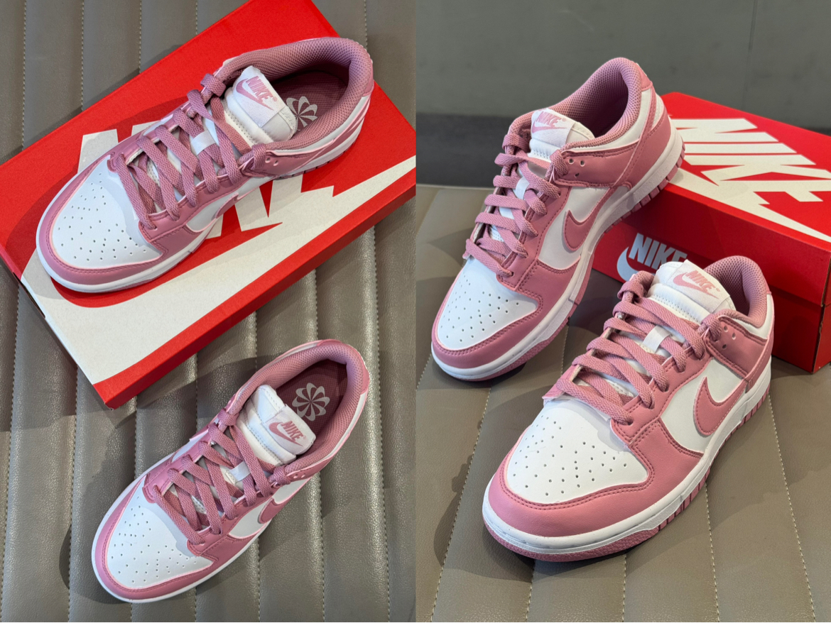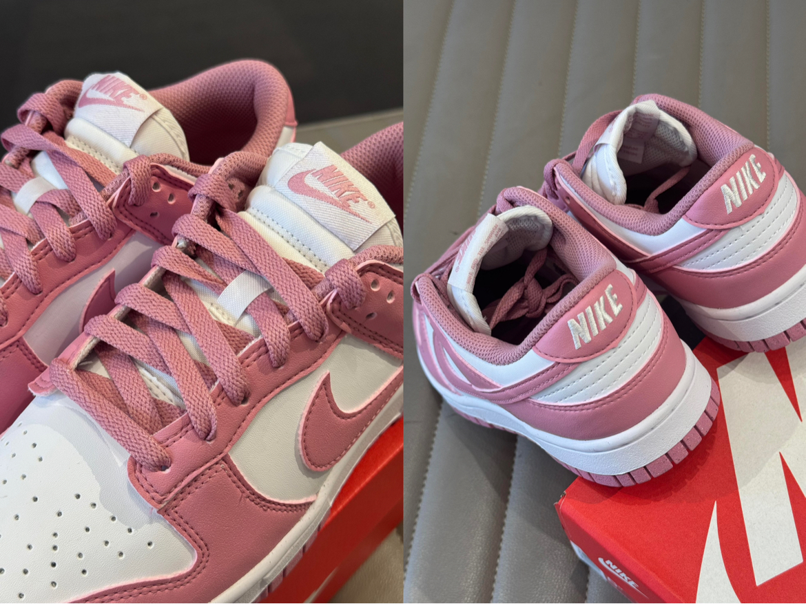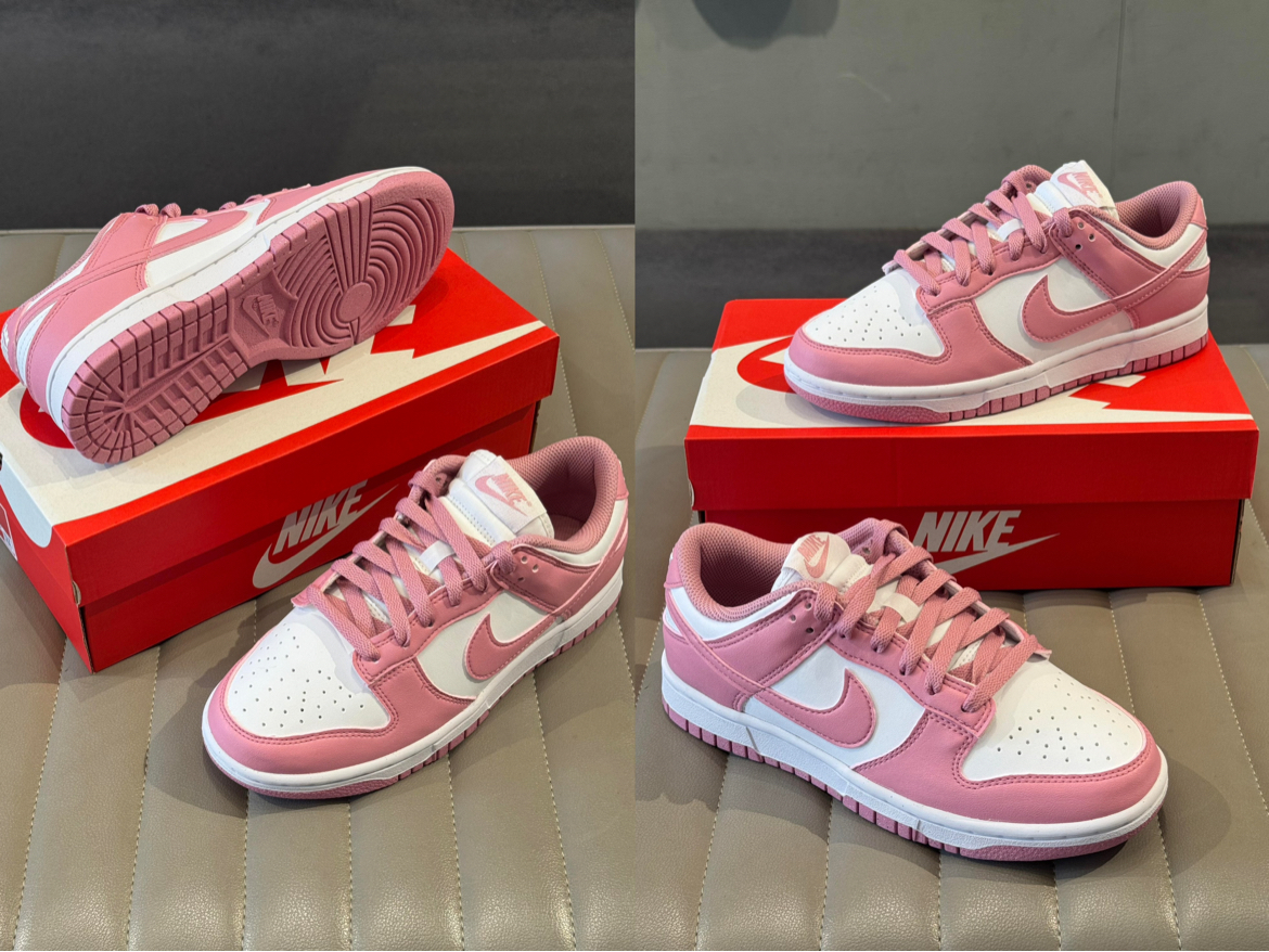 这双Nike Dunk Low粉白配色很柔和,像把樱花穿在脚上。皮革鞋面质感不错,日常打理起来方便,沾到污渍用湿布擦拭即可。鞋舌和后跟的填充适中,长时间走路也不会磨脚。鞋底有一定支撑力,逛街时脚感比较舒适,搭配牛仔裤、百褶裙都很协调。鞋型偏修长,脚宽的朋友可以考虑大半码,会更舒适。