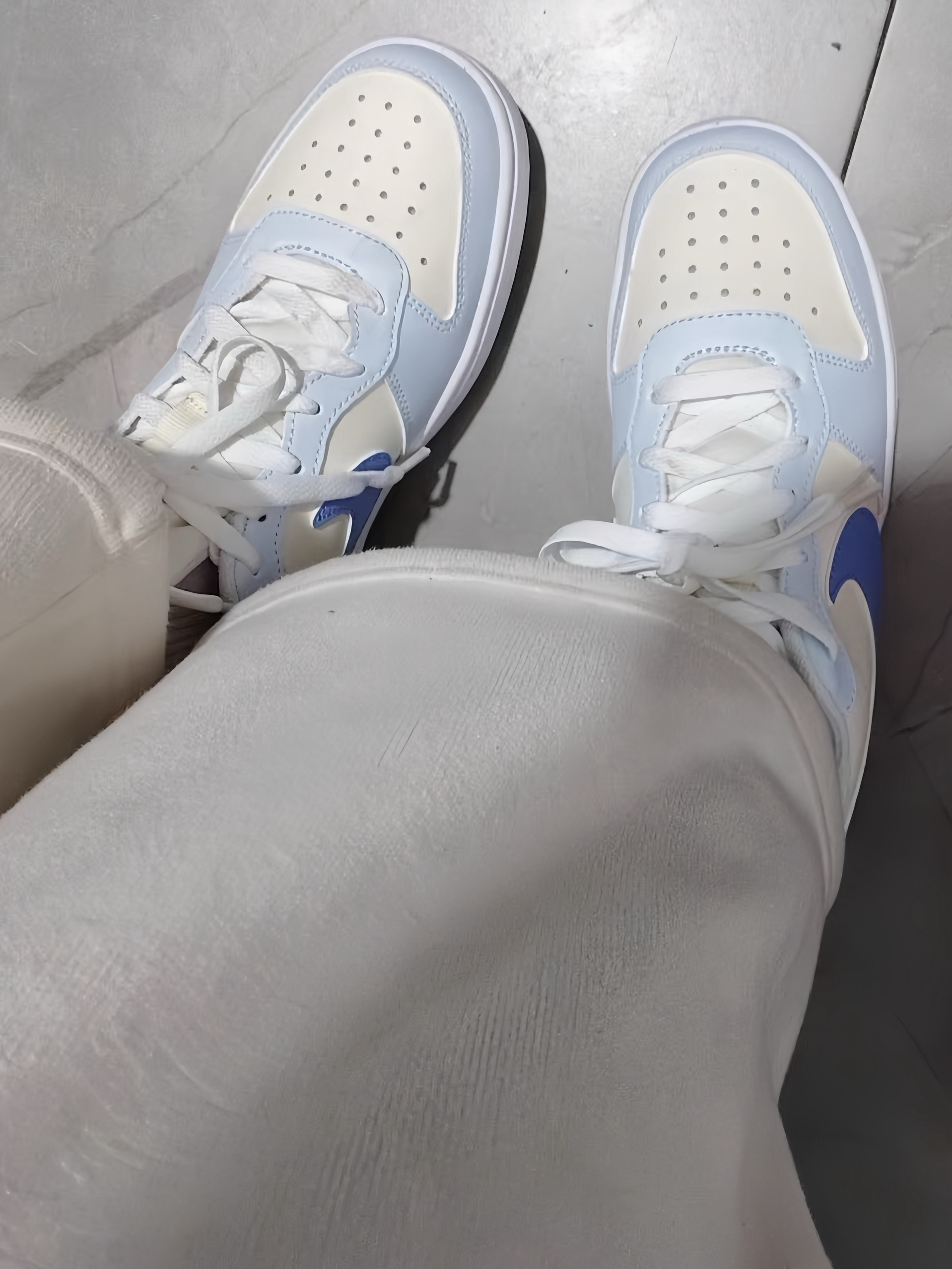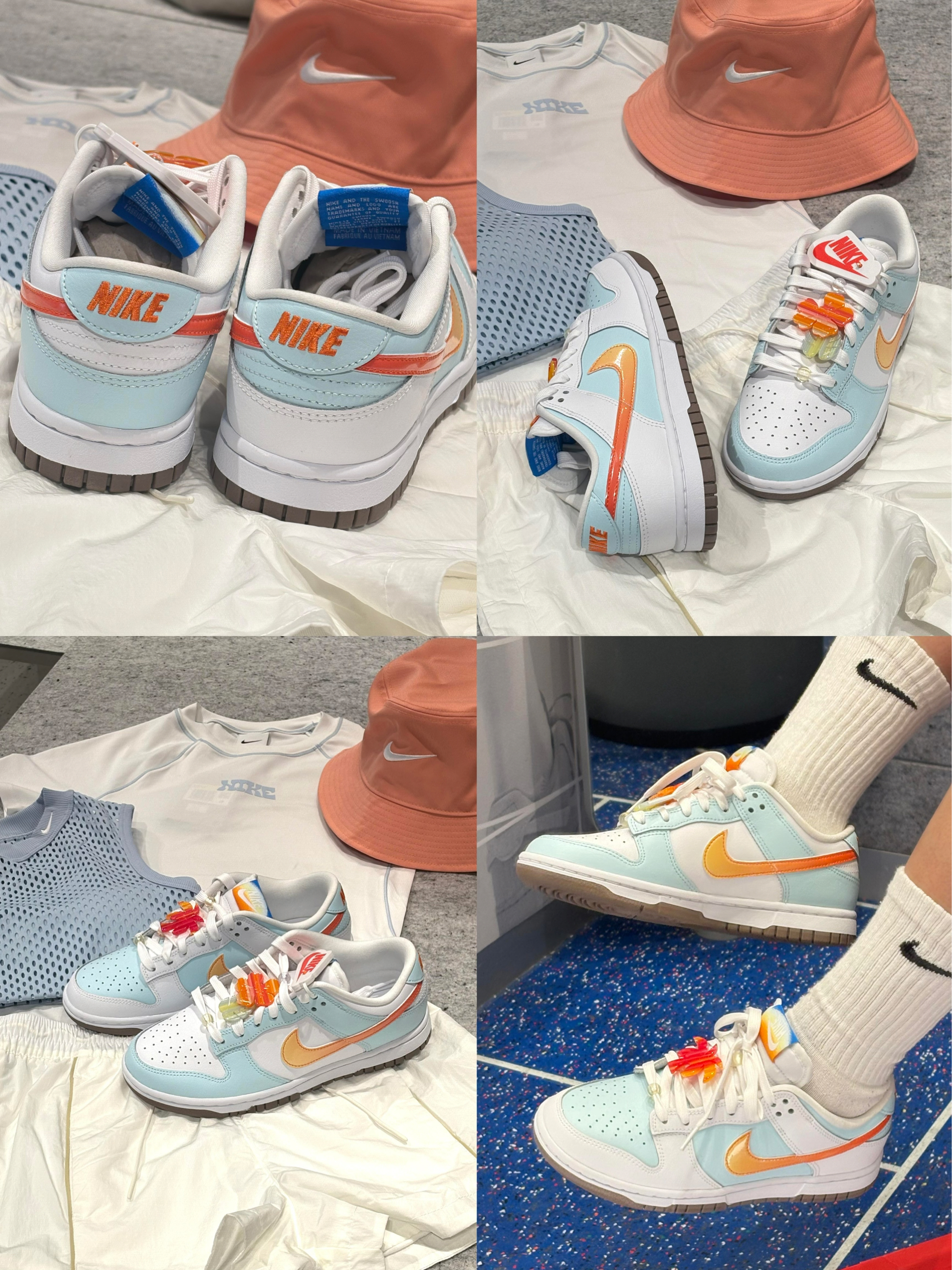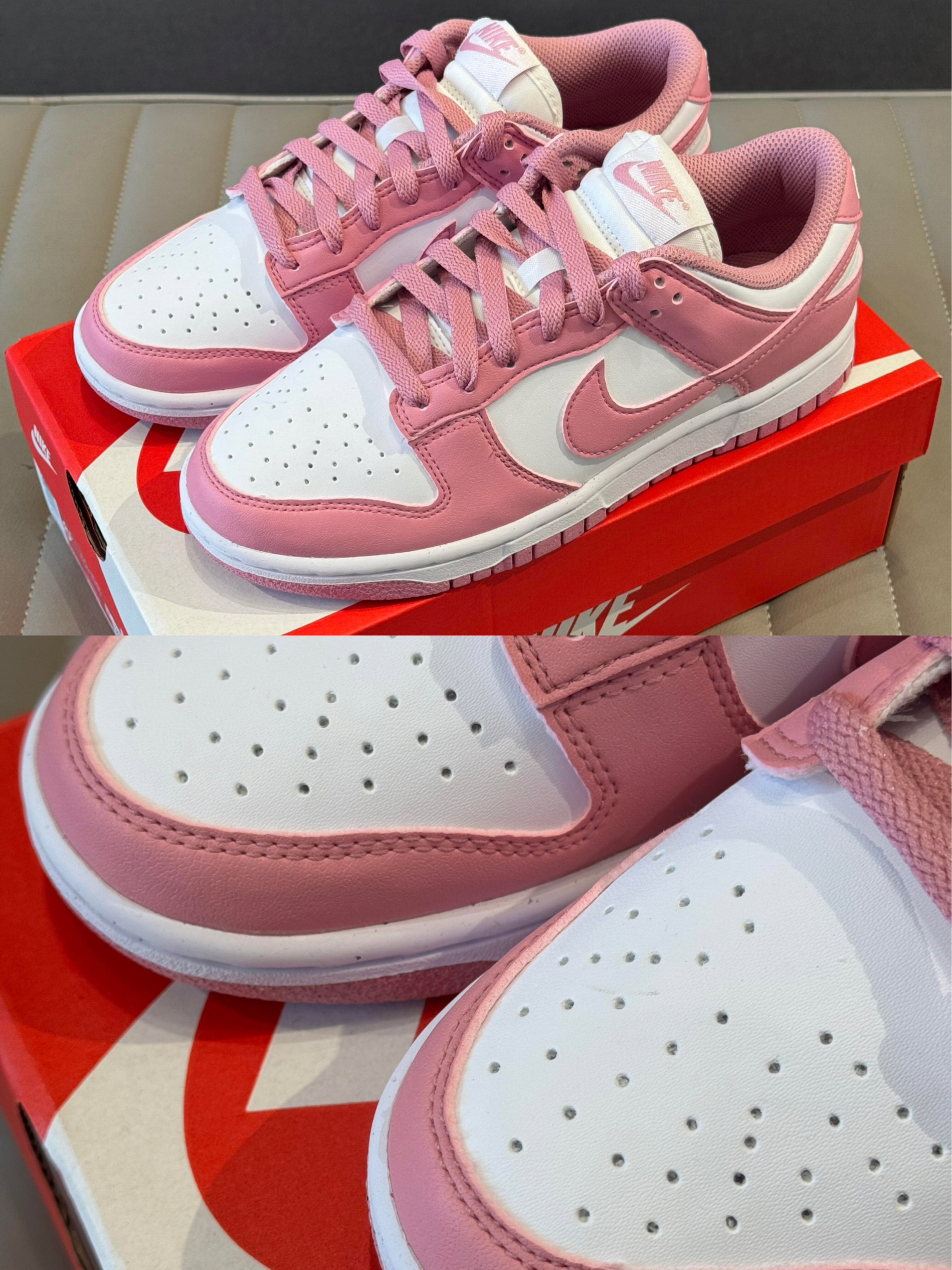 这双Nike Dunk Low粉白配色很柔和,像把樱花穿在脚上。皮革鞋面质感不错,日常打理起来方便,沾到污渍用湿布擦拭即可。鞋舌和后跟的填充适中,长时间走路也不会磨脚。鞋底有一定支撑力,逛街时脚感比较舒适,搭配牛仔裤、百褶裙都很协调。鞋型偏修长,脚宽的朋友可以考虑大半码,会更舒适。