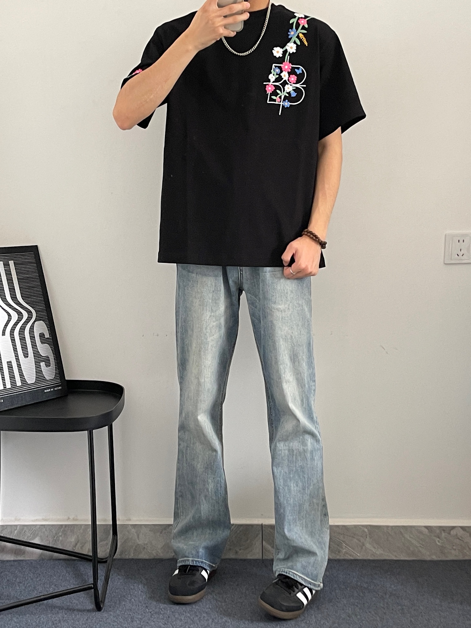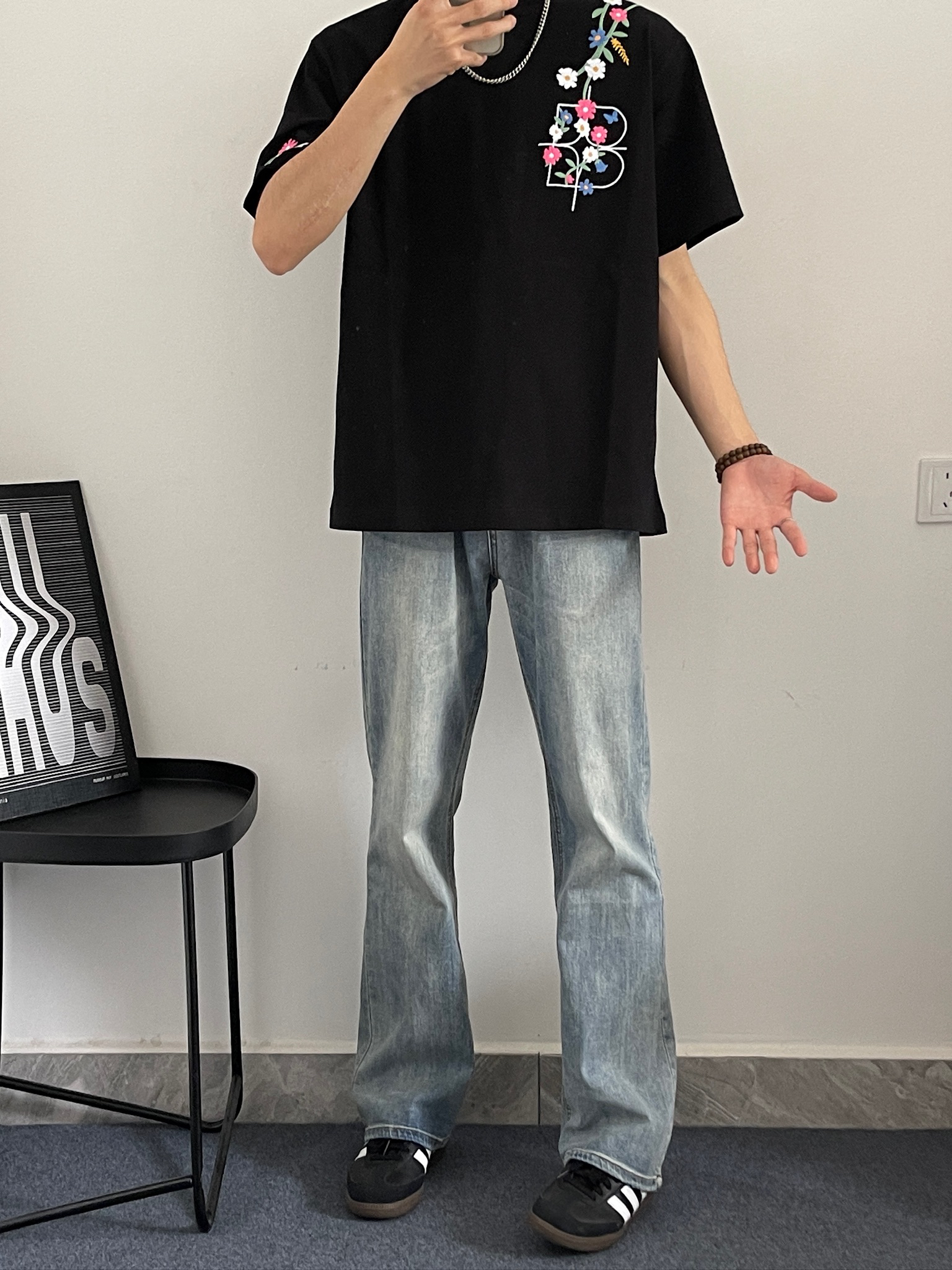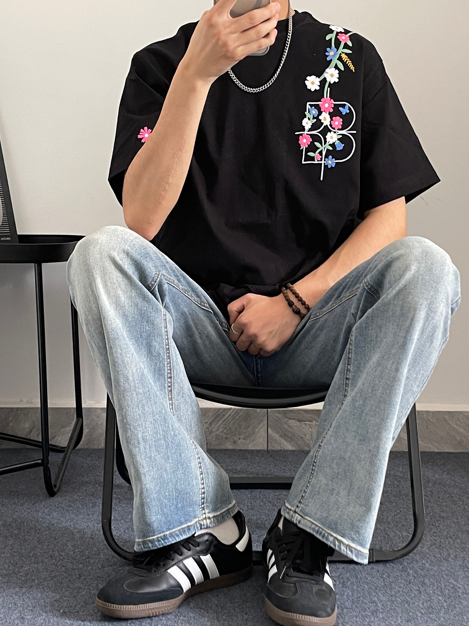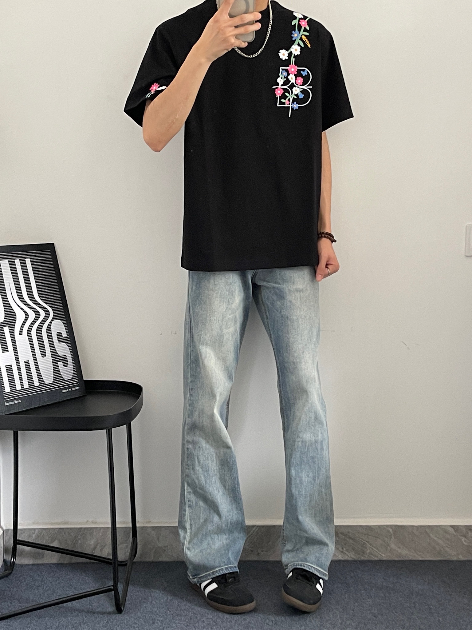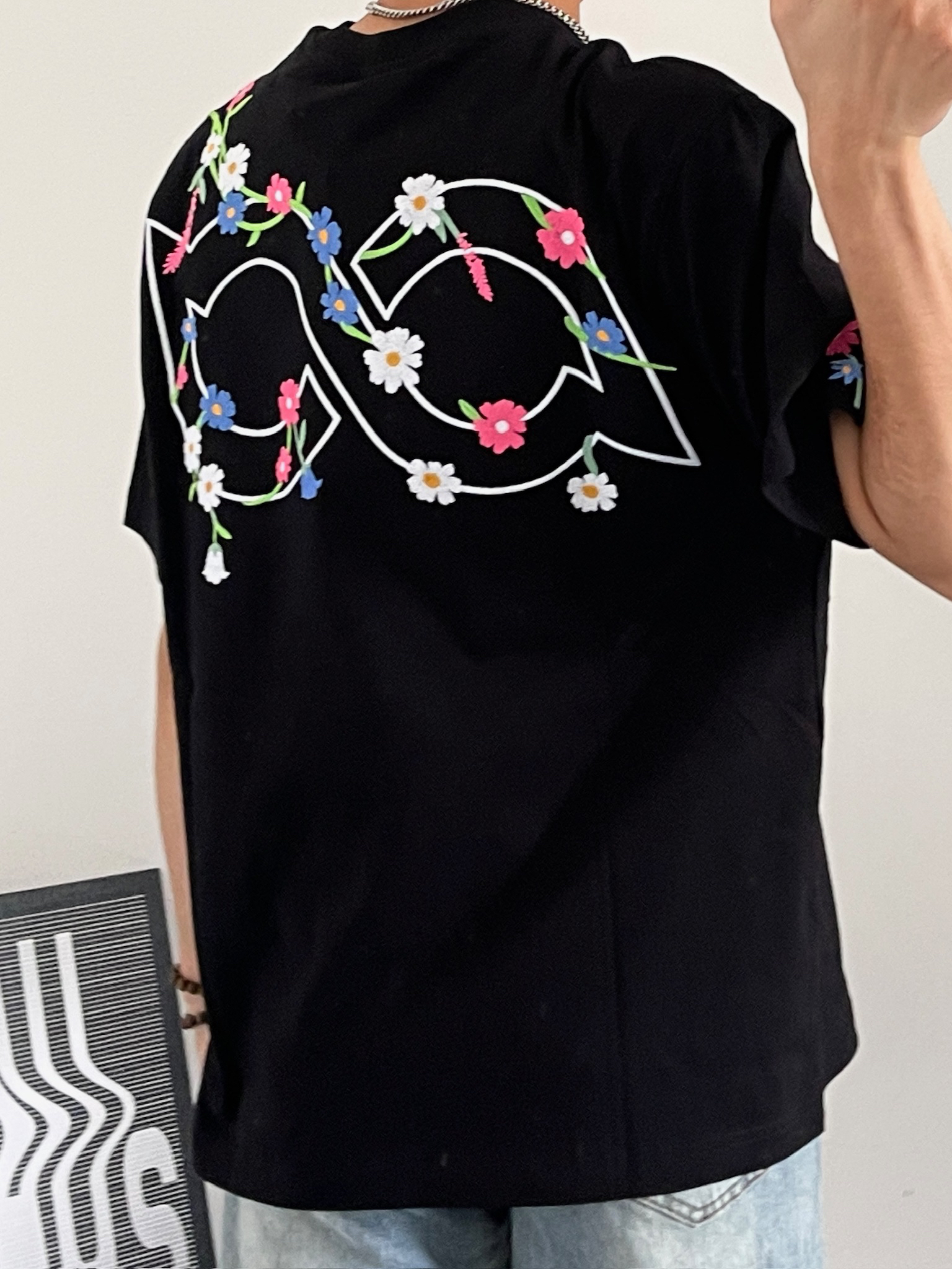 谁懂啊家人们!这件黑T真的长在我审美上了🥹 小花刺绣的细节真的很加分,不会像纯黑T那么单调,走线也很工整,没有多余的线头。我平时穿衣服比较简单,这件T刚好满足我的需求,蓝白红的小花在黑底上很亮眼,不用费心搭配,里面穿个白T,下面配个工装裤,秒变街头潮人。面料很舒服,洗了两次也没变形,质量真的很抗打👍
