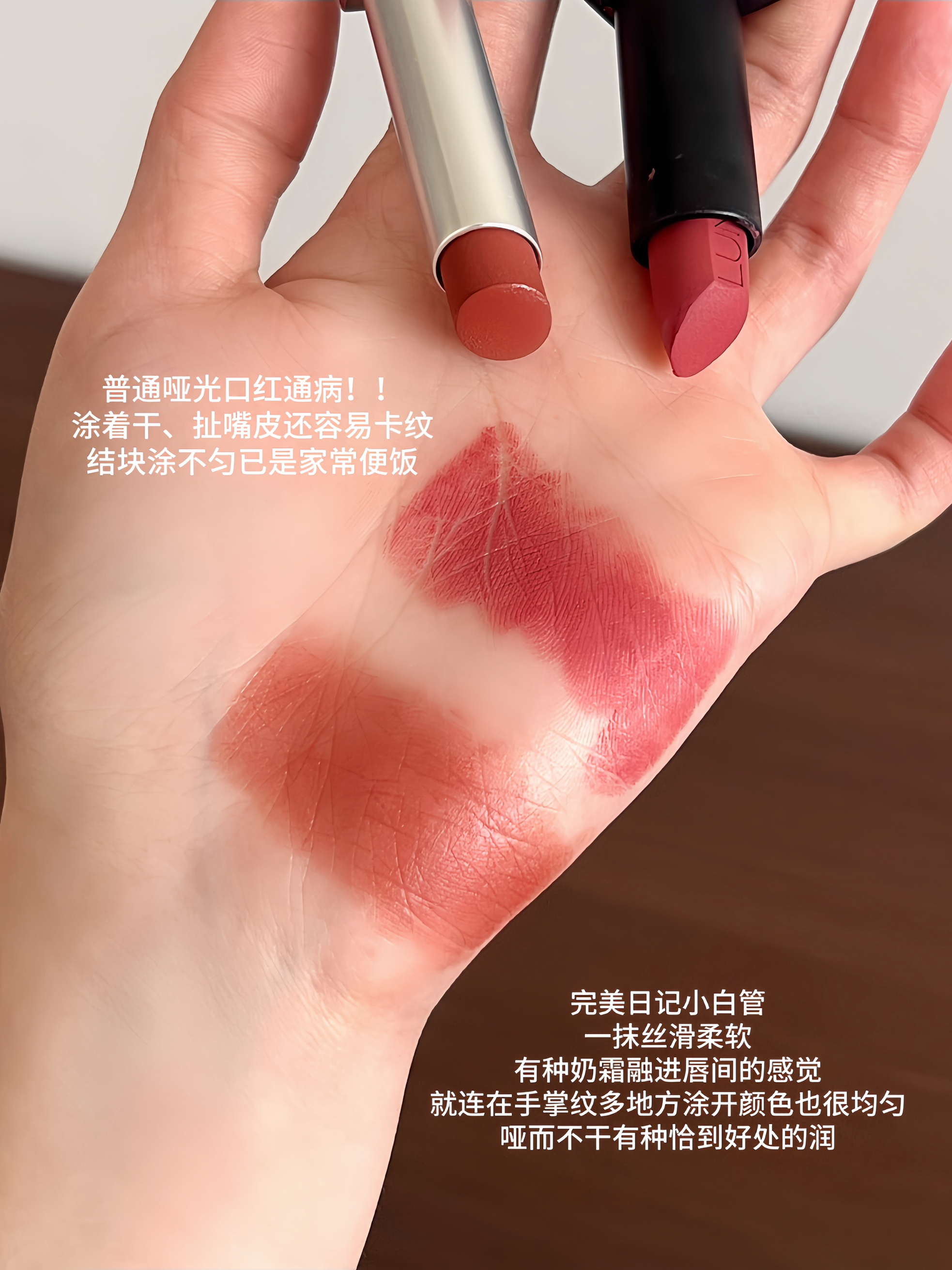 本篇笔记关联了3CE 哑光丝绒雾面烟管口红3.2g 铁锈红PLAIN 、perfect diary/完美日记 3.0仿生膜精华囗红 哑光自然持久润泽玻璃唇 3g 712锦鲤、perfect diary/完美日记 仿生膜精华哑光第三代口红 易上色持久不拔干 3.3g 939无畏红棕等商品,为用户提供真实的使用体验和购买参考。