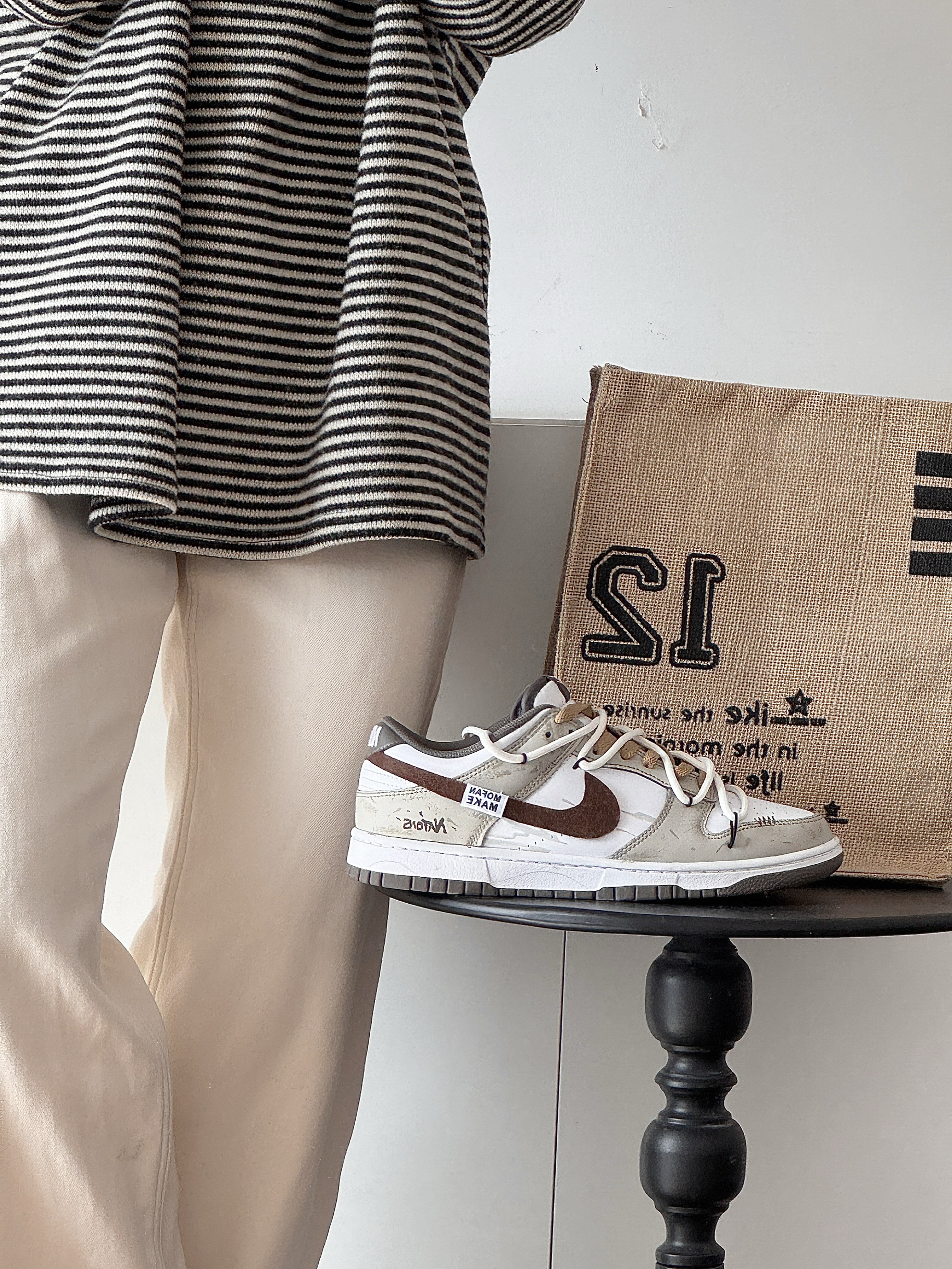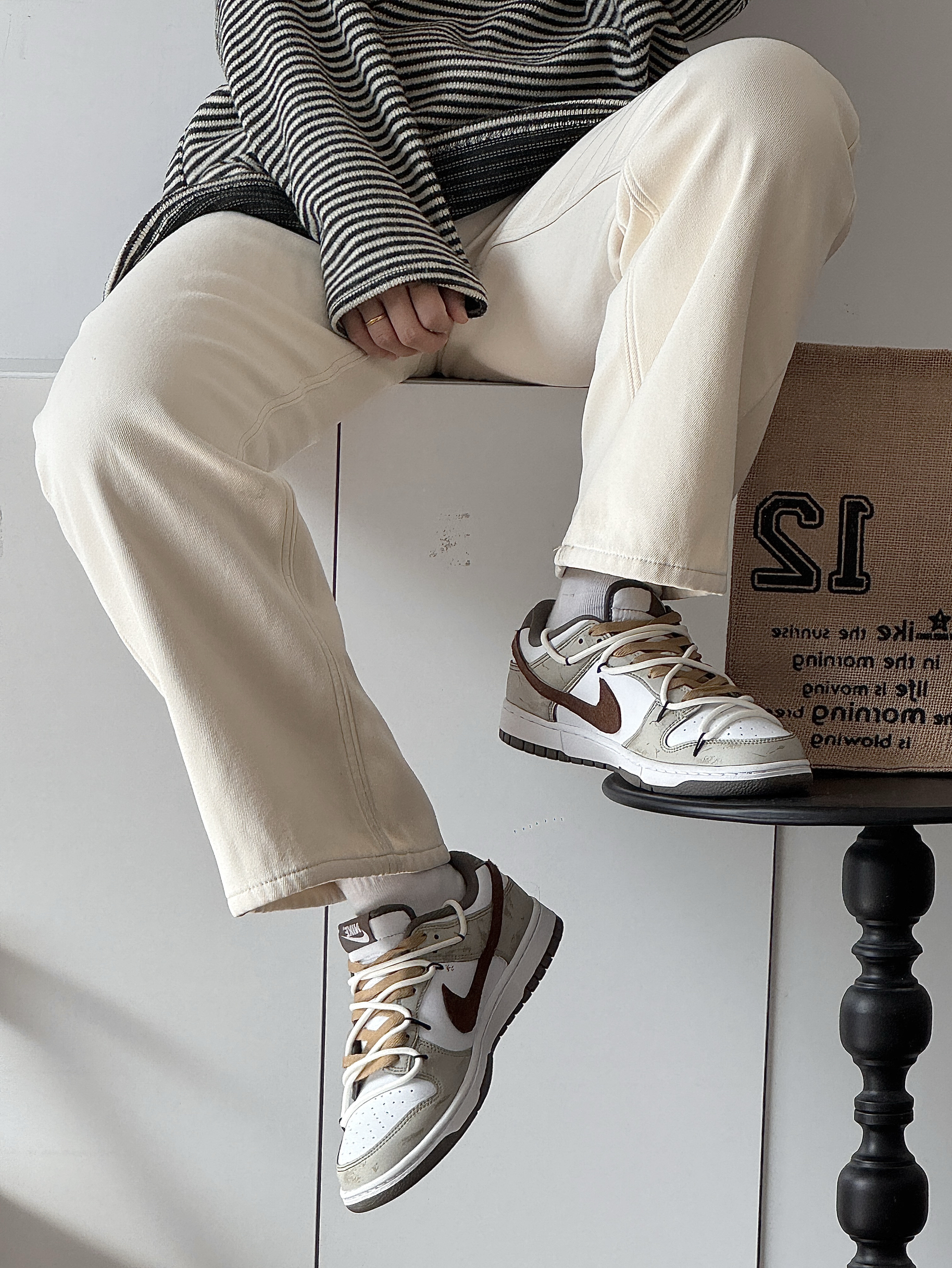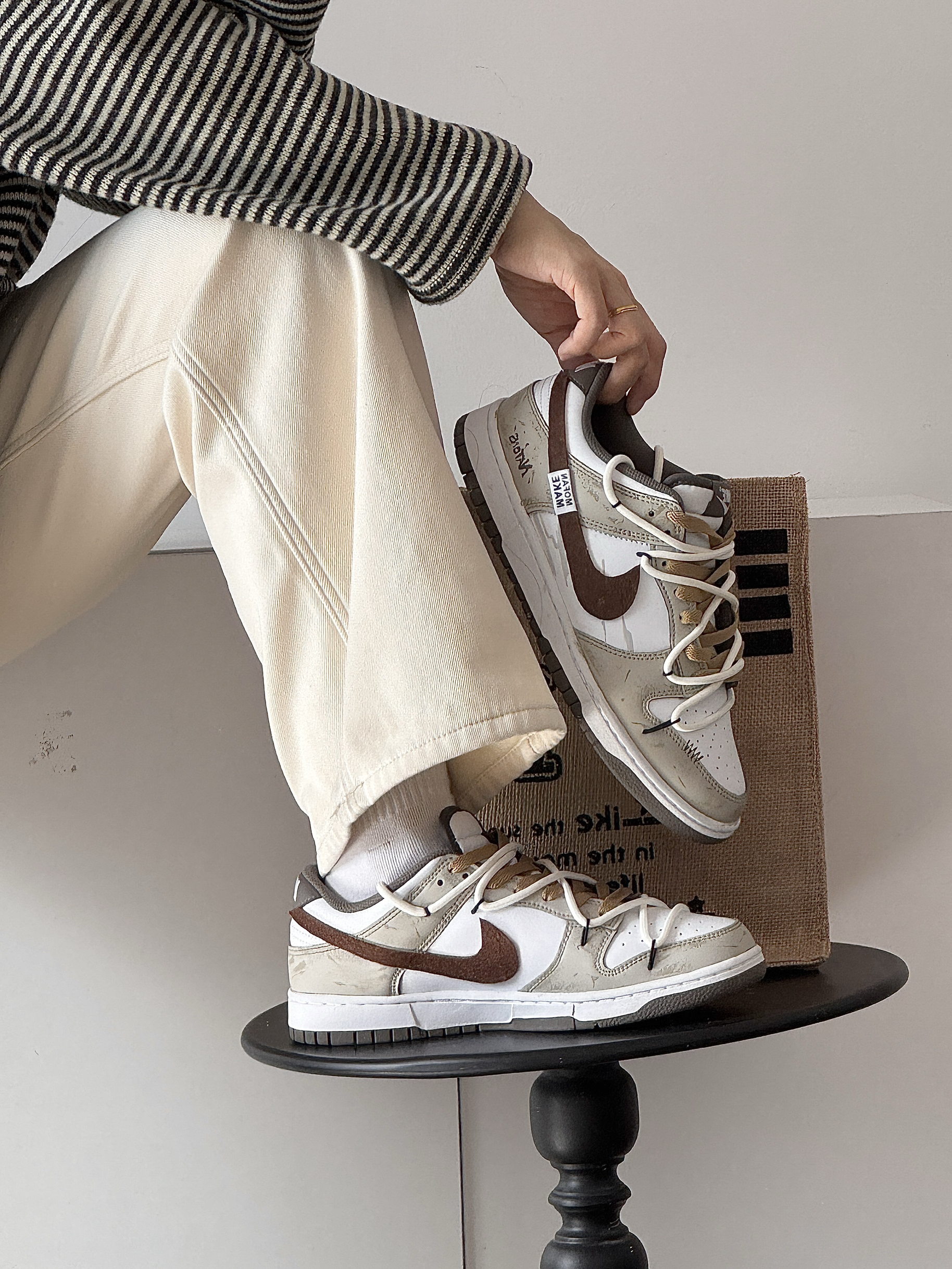 这双Dunk真的太戳我了!米白+棕的配色,复古又温柔,做旧的细节也很到位,自带一种随性的氛围感。上脚很舒服,鞋型对脚宽、脚面高的朋友也很友好,我选大半码刚好合适。不管是搭休闲裤还是牛仔裤都很好看,日常出街完全不挑风格,越看越喜欢